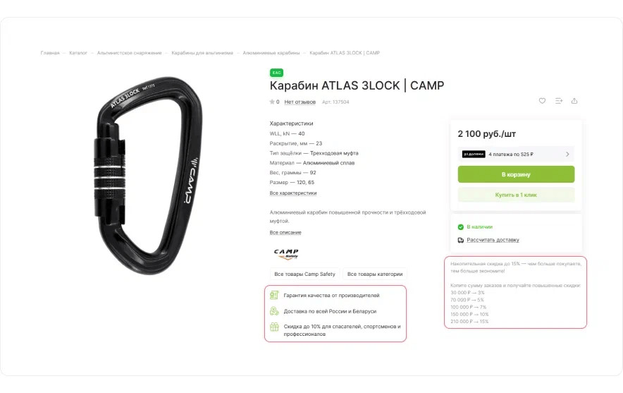 - Работа с посадочными страницами и карточками товаров. Мы добавили на сайт облако тегов. Это помогло привлечь дополнительный трафик по более узким запросам. В карточках товаров появились блоки с преимуществами, подсказки о скидках, а также табы с информацией о доставке и оплате.