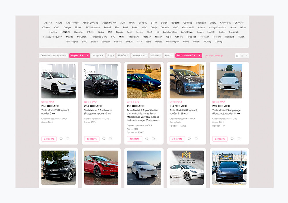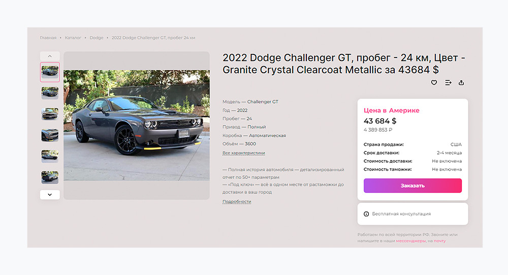 При переходе во второй раздел открывается библиотека автопроизводителей с почти сотней брендов. Визуальное представление логотипов существенно упрощает навигацию и помогает быстро найти интересующую марку. Дополнительно покупатели могут выбирать страну поставки. Этот параметр влияет на логистические расходы в зависимости от местоположения получателя. Система фильтрации товаров Создание продвинутой системы фильтров стало наиболее технически сложной задачей всего проекта. Итоговое решение включает множество параметров отбора: — Мощность силового агрегата — Тип трансмиссии — Рабочий объем мотора — Конфигурация привода — Дополнительные технические характеристики Такая детальная навигация позволяет пользователям быстро находить модели, соответствующие их требованиям. Детальные карточки товаров Каждый автомобиль представлен развернутым описанием со всей необходимой информацией: — Полные технические характеристики — Фотогалерея — Ориентировочные сроки поставки — Расчет транспортных расходов — Стоимость таможенного оформления Основой маркетинговой кампании стала поисковая оптимизация. Команда регулярно публиковала SEO-ориентированные материалы и обновляла товарные предложения, что помогло улучшить позиции в результатах поиска. Параллельно запустили контекстную рекламу через Яндекс.Директ. Интерактивный калькулятор полной стоимости Ключевой доработкой проекта стал автоматический расчет итоговой цены покупки. В стандартных карточках указана только базовая стоимость машины, но финальная сумма включает множество дополнительных статей: — Транспортировочные расходы — Комиссия за услуги подбора — Таможенные платежи и пошлины — Сопутствующие административные расходы Калькулятор адаптируется под географию доставки — валюта автоматически переключается между рублем, белорусским рублем, азербайджанским манатом или долларом. Покупатель может самостоятельно просчитать полную стоимость получения автомобиля в своей стране. Автоматизация наполнения каталога Вторая значимая доработка — скрипт автоматического добавления товаров. Эта функция решает сразу две задачи: 1. Снижает нагрузку на менеджеров по контенту 2. Обеспечивает постоянное расширение ассортимента Благодаря автоматизации пользователи получают доступ к обширному выбору моделей с регулярными обновлениями предложений. Команде удалось создать яркую и функциональную платформу для автоимпорта. Покупатели получили доступ к обширному выбору зарубежных автомобилей с прозрачным расчетом полной стоимости покупки. Все сложности логистики и документооборота теперь берет на себя сервис, что существенно упрощает процесс приобретения машины из-за рубежа. Хотите создать специализированный интернет-магазин с уникальной бизнес-логикой? Готовые решения Аспро позволяют реализовать сложные проекты быстрее и экономичнее индивидуальной разработки. Для тех, кому интересен запуск сайта на готовых решениях Аспро