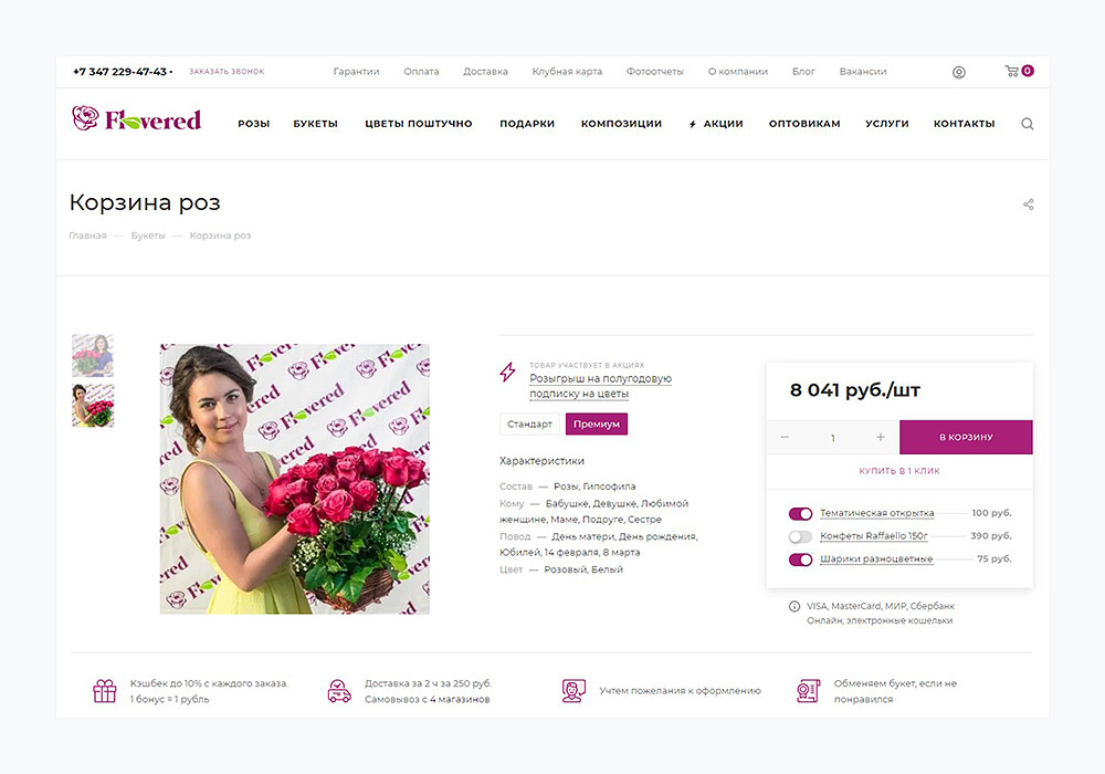 — Создали четкие рекомендации для каждой категории Для роста среднего чека внедрили систему дополнительных товаров. К каждому букету в один клик можно добавить открытку и коробку конфет — самые популярные дополнения. Также настроили показ похожих композиций и блок дополнительных услуг: упаковка, доставка, воздушные шары. Упрощение процесса покупки Корзина получила кардинальные изменения: — Сократили количество обязательных полей — Добавили примеры заполнения для оставшихся — Сделали различия в доставке более понятными Цветочный бизнес — это прежде всего эмоции. Команда кардинально пересмотрела визуальную подачу товаров. «Вместе с клиентом мы сделали сайт более живым — добавили на фото людей. Это создает у покупателя впечатление живого выбора цветов, передает эмоции как от настоящей покупки», — объясняет Павел Памухин. Ключевые изменения в визуальной части: — Фотосессии с реальными людьми вместо статичных композиций — Съемка персонала для главных баннеров — Фотоотчеты с доставок для демонстрации качества — Акцент на эмоциональной составляющей покупки Букеты в руках реальных людей помогают покупателям лучше оценить размер и внешний вид Такой подход решил практическую задачу — покупателям стало проще определять размеры букетов. Но главное — фотографии начали передавать эмоции от получения подарка. SEO-стратегия для цветочного рынка Первый этап: базовое ядро Команда собрала семантическое ядро из 262 запросов по основным направлениям: — Букеты различных типов — Названия цветочных магазинов — Конкретные виды цветов — Розы и популярные сорта Параллельно дорабатывали посадочные страницы и оптимизировали скорость загрузки сайта. Расширение через умный фильтр Спустя три месяца специалисты приступили к более амбициозной задаче — созданию SEO-страниц через умный фильтр. Новое ядро включало 502 запроса по категориям: — Виды цветов — Поводы для подарков — Тип получателя — Варианты оформления — Цветовая гамма Анализ показал интересную особенность рынка: по многим запросам в выдаче доминировали информационные ресурсы, а не интернет-магазины. Но команда решила рискнуть, предположив, что у конкурентов просто нет подходящих посадочных страниц. Финальная оптимизация ядра Через несколько месяцев гипотеза частично подтвердилась. Исключив информационные запросы, команда сосредоточилась на 308 коммерческих ключевых фразах, которые реально приводят покупателей. Павел Памухин отмечает ключевую роль технологии: «Умный SEO-фильтр в несколько раз облегчил работу по продвижению интернет-магазина. Только с помощью фильтра из поиска за месяц приходит в среднем 16,5% потенциальных клиентов». Комплексный подход дал измеримые результаты уже через 9 месяцев: Рост трафика: — Визиты с поисковых систем выросли на 40,3% — Прямые заходы увеличились на 64,6% — показатель роста лояльности — Повторные посещения существенно выросли Улучшение конверсии: — Добавление товаров в корзину выросло более чем в 2 раза — Конверсия по добавлению в корзину поднялась с 2,8% до 4,19% — Увеличился средний чек благодаря системе дополнительных товаров SEO-показатели: — 16,5% трафика приходит через страницы умного фильтра — Сайт вошел в топ по множеству низкочастотных запросов — Улучшились позиции по коммерческим ключевым фразам Кейс Flovered показывает: даже 