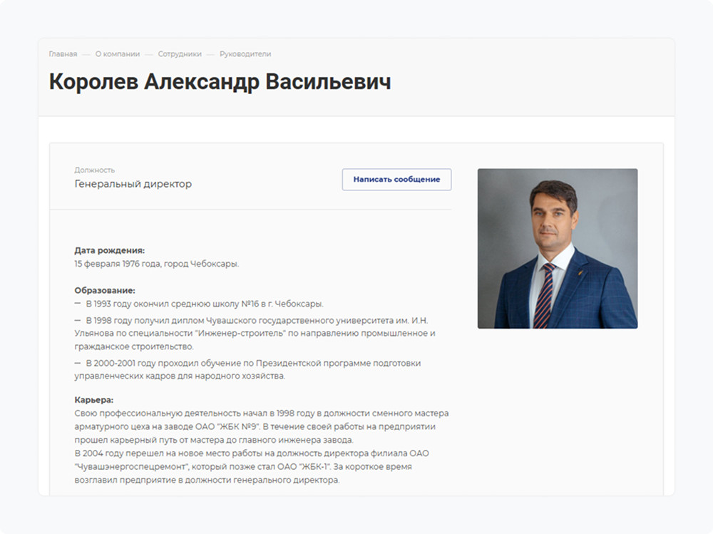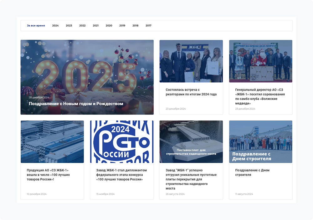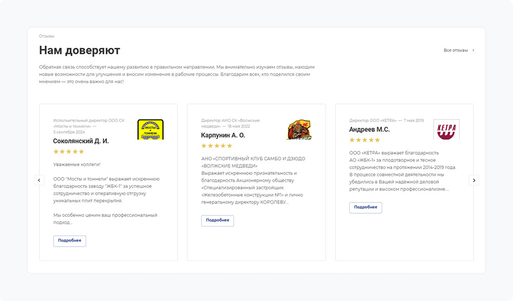Прежняя версия использовала боковую панель навигации, которая занимала значительную часть экранного пространства. В обновленном варианте меню переместили в верхнюю область с прозрачным фоном. Такая компоновка позволяет максимально задействовать видеобаннеры для привлечения внимания посетителей. При прокрутке страницы навигационная панель закрепляется в верхней части экрана и становится полупрозрачной. Это решение гарантирует постоянную доступность кнопки «Получить прайс-лист» и возможность быстрого перехода между разделами ресурса. Товарная линейка насчитывает порядка 100 наименований. Логичная организация разделов позволяет найти требуемую продукцию за несколько переходов без дополнительных фильтров поиска. Описание продукции выполнено в минималистичном стиле. Посетители могут выбирать модификации изделий различных габаритов. Торговые предложения представлены в табличном формате для удобства восприятия. Поскольку продукция завода востребована в соседних регионах, в карточки добавили таблицы с информацией о транспортных расходах. Покупатели видят базовые тарифы доставки до крупных населенных пунктов. На главной странице размещен блок с мнениями заказчиков. Особое внимание привлекают логотипы организаций, оставивших рекомендации. В специальном разделе можно ознакомиться с полными текстами отзывов и сканами благодарственных писем. Сотрудники «ЖБК-1» регулярно публикуют информацию о производственных достижениях и участии в отраслевых мероприятиях. Система фильтрации по годам упрощает поиск публикаций за определенный период. Информация о ключевых сотрудниках формирует дополнительное доверие посетителей. Например, можно узнать о профессиональном пути, образовании и принципах работы руководителя предприятия, а также связаться с ним напрямую. Страница трудоустройства демонстрирует актуальные потребности в персонале. Потенциальные партнеры получают представление об условиях работы на производстве и корпоративной культуре организации. Переход на специализированную платформу прошел без технических сложностей. Команда «ЖБК-1» продемонстрировала высокий уровень взаимодействия — все спорные моменты решались максимально быстро. «Миграция на отраслевое решение завершилась успешно благодаря конструктивному сотрудничеству с заказчиком. Особенно хочется отметить оперативность Сергея в решении организационных вопросов. Финальный результат превзошел ожидания — уверена, что пользователи оценят удобство обновленного ресурса», — делится впечатлениями Полина Артемова, менеджер проектов. Модернизированный веб-ресурс соответствует современным стандартам промышленной отрасли и обеспечивает эффективное взаимодействие с целевой аудиторией. Мы в Аспро знаем, как вернуть сайту актуальность без лишних затрат и простоев. Миграция на решение Аспро — быстрый способ обновить внешний вид, добавить современный функционал и сохранить все ваши данные.