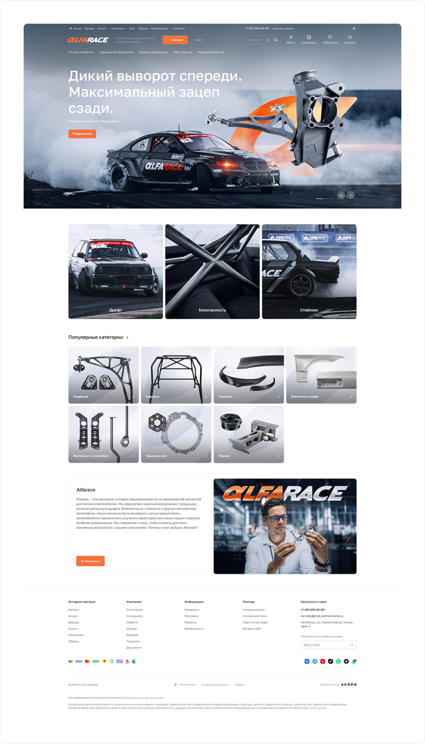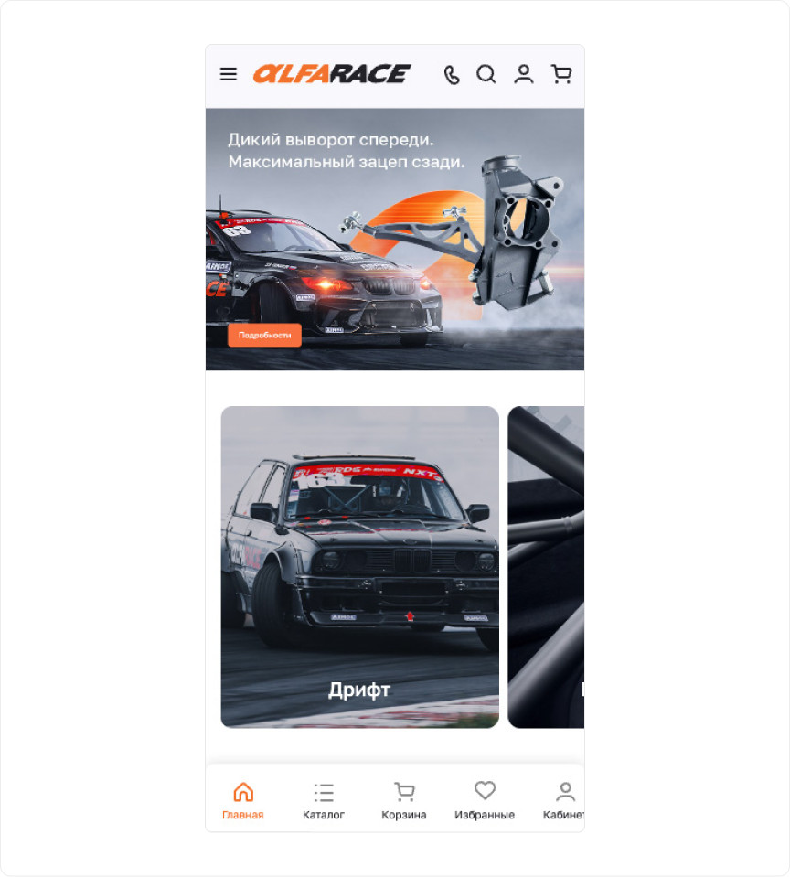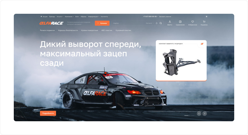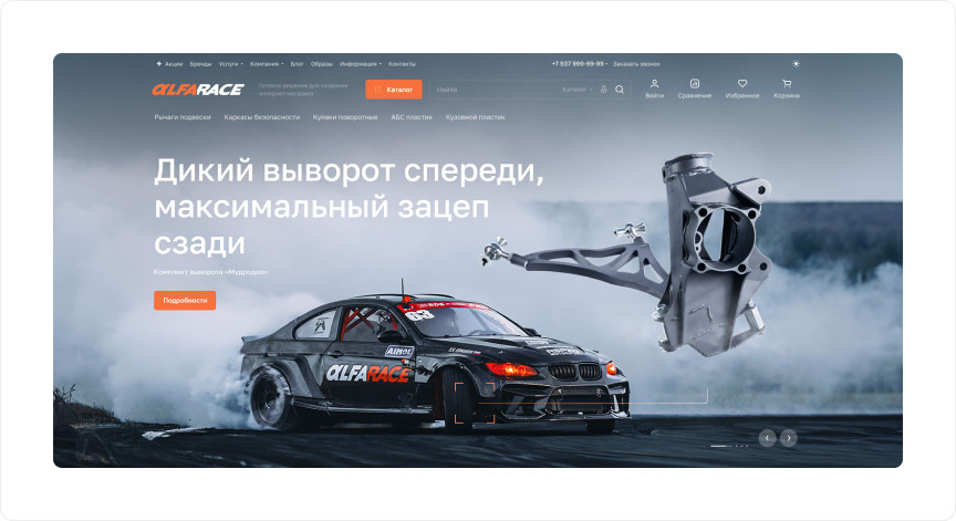 Компания обратилась к нам для создания нового дизайна интернет-магазина. В их ассортименте — детали для дрифта, системы безопасности, элементы стайлинга и другие компоненты для тюнинга автомобилей. Задача заключалась в том, чтобы показать продукцию в естественной среде использования.