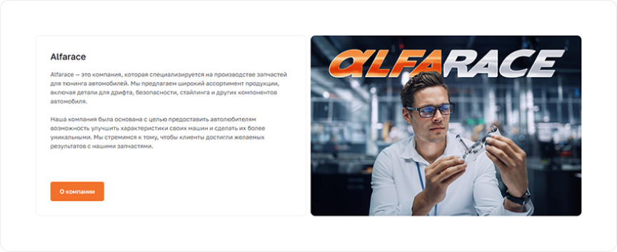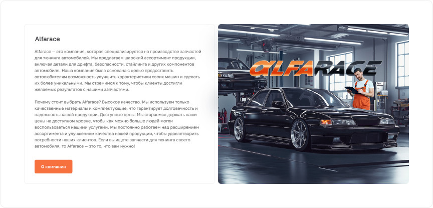 Изначально мы выбрали фотографию автомобиля с логотипом компании, сделанную прямо на гоночной трассе. Одну из установленных деталей разместили в белом квадрате рядом с машиной. «Поскольку деталь имеет неправильную форму, мы решили поместить ее на брендированный прямоугольник. По нашей задумке, такой подход позволил бы в дальнейшем использовать шаблон для разных деталей без серьезных затрат на дизайн, так как не требовалось бы каждый раз вписывать запчасть в пространство», — рассказывает арт-директор. Команде хотелось увидеть деталь крупнее и без белого прямоугольника. Необходимо было органично вписать запчасть в композицию, сохранив смысловую связь с победившим на соревнованиях автомобилем. Мы скорректировали расположение детали, выполнили цветокоррекцию и добавили дымовые эффекты для создания единого пространства. Для усиления композиции потребовался дополнительный связующий элемент. Мы добавили логотип компании, яркое освещение фар и световую полосу от быстро движущегося автомобиля. «Понадобился более весомый элемент. Решили добавить логотип, чтобы связать автомобиль с деталью и закрепить ассоциацию с брендом», — комментирует арт-директор. Для мобильных устройств мы адаптировали основной баннер под соответствующие размеры экрана. Для трех основных направлений продукции — дрифта, безопасности и стайлинга — мы создали отдельные баннеры, максимально раскрывающие содержание через визуальные образы: Мы отобрали снимки с подходящими ракурсами из предоставленной подборки и обработали их для достижения нужного эффекта. Клиенту важно было представить себя как проектировщика и производителя, а не торгового посредника или сервисную мастерскую. Поэтому окончательный вариант с инженером, демонстрирующим спроектированную деталь, полностью соответствовал требованиям. «Отрисовать категории каталога оказалось самой трудоемкой частью процесса. Все детали специфичные, не всегда фотогеничные. В каждой категории очень разные товары, поэтому изображение одной запчасти не передавало бы суть категории», — объясняет арт-директор. Предоставленные фотографии товаров были сняты в разных ракурсах и условиях. Потребовалась серьезная постобработка: Мы также протестировали темный вариант оформления, но он конфликтовал с соседними блоками сайта, поэтому остановились на светлом решении. Созданные изображения также используются в навигационном меню сайта. Существующий логотип компании мы адаптировали под требования платформы, создав две версии: для светлой и темной тем оформления, между которыми пользователи могут переключаться в шапке сайта. Новый дизайн стал значительным шагом вперед для команды с точки зрения визуального представления бренда. Созданные изображения передают атмосферу компании и органично вписываются в концепцию специализированного интернет-магазина. Визуальный контент способен донести ключевые смыслы до посетителя на подсознательном уровне. Хотя хочется достичь идеального результата с первой попытки, это получается далеко не всегда. Наша цель — не просто предоставить картинки, а создать продуманный дизайн, отражающий нужные аспекты бренда. Лучшие идеи часто рождаются в процессе работы над проектом, поэтому мы всегда готовы к диалогу с клиентом для достижения результата, устраивающего о