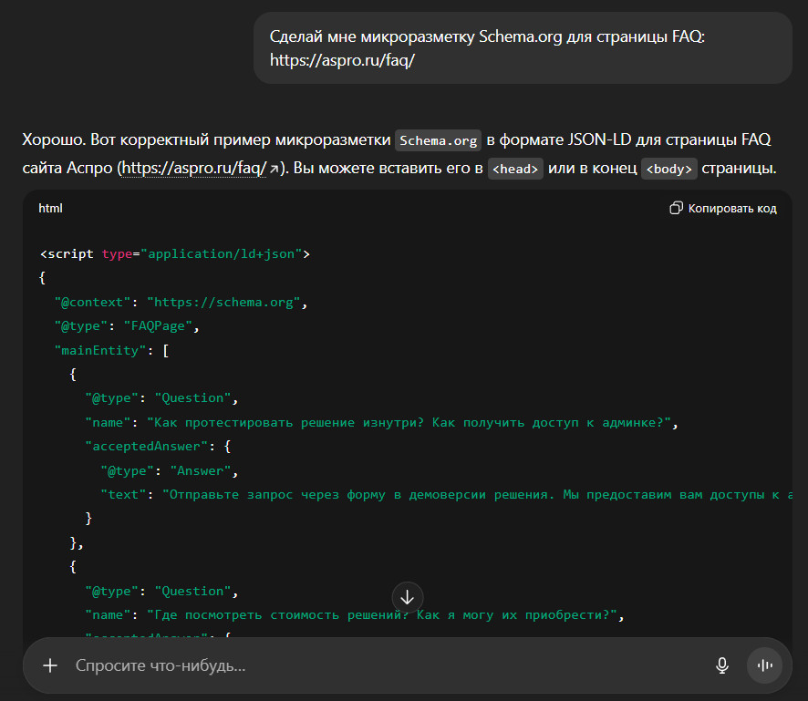 ИИ работает в условиях ограниченного времени: пользователю нужен ответ сразу. Размеченные данные нейросети обрабатывают в разы быстрее, чем неструктурированный текст. Поэтому страницы с микроразметкой чаще попадают в ответы ИИ.