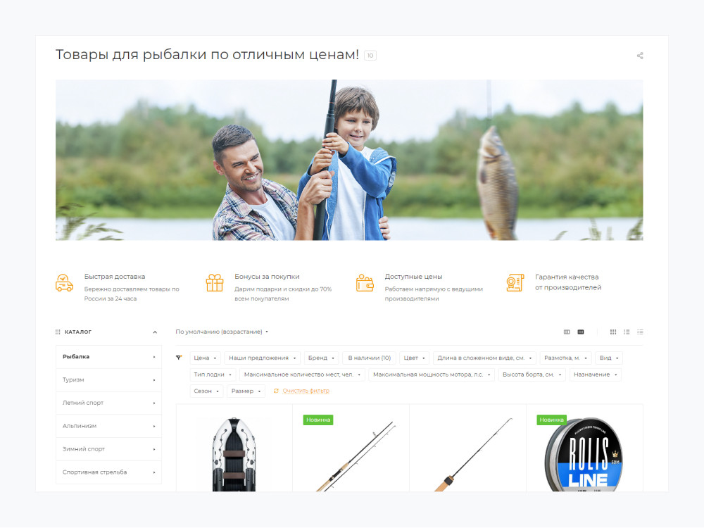 Основа любого интернет-магазина — удобная продажа товаров. Рыболовы — требовательная аудитория, которая тщательно изучает характеристики снастей и экипировки.