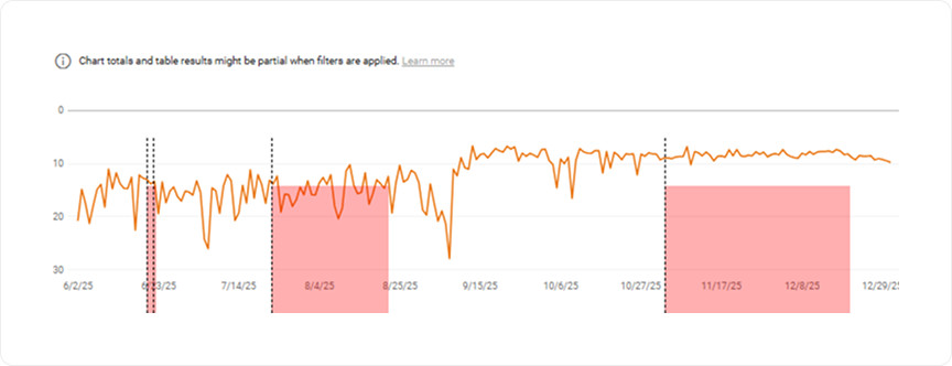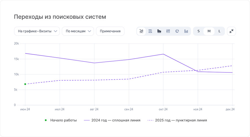 Работу начали в июне 2025 года. Уже к октябрю показатели вернулись к лучшим месяцам предыдущего года, а в ноябре их удалось превысить. К концу декабря органический трафик достиг около 13 000 визитов, а благодаря улучшению пользовательского опыта количество заказов увеличилось в 4 раза. Для сравнения, в период с декабря 2024 по июнь 2025 трафик упал до 6 500 визитов, а после нашей работы стабильно рос, достигнув 13 000 к концу 2025 года.