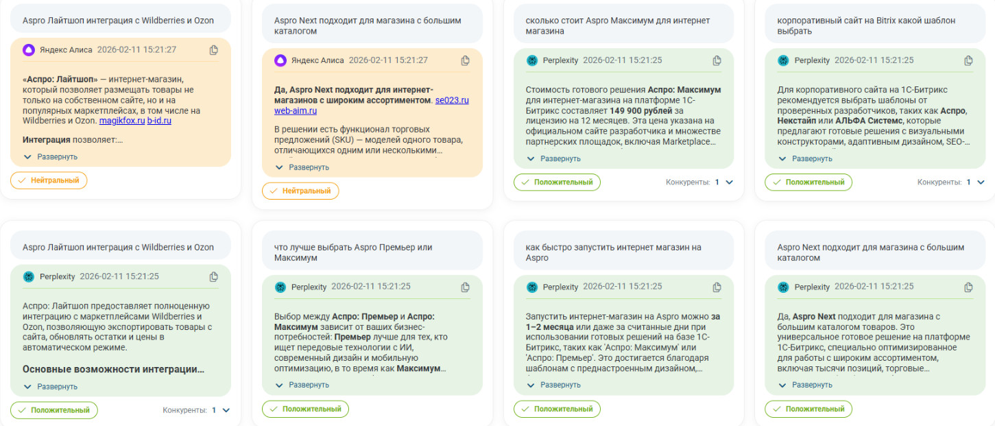 В логике AI-поиска появляется новый показатель — доля упоминаний бренда в ответах нейросетей. Важно анализировать видимость отдельно по каждой модели и учитывать не только ранжирование страниц, но и сам факт появления бренда в ответе.