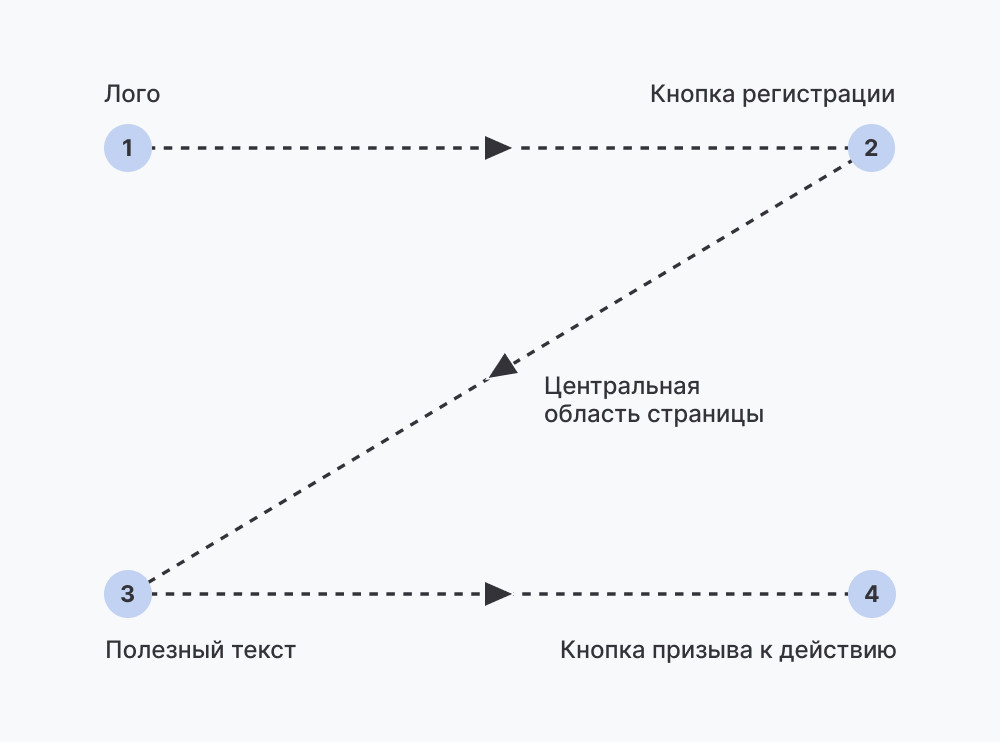 Z-паттерн отражает движение взгляда по страницам, где важны визуальные элементы, а не только текст. Он предполагает: