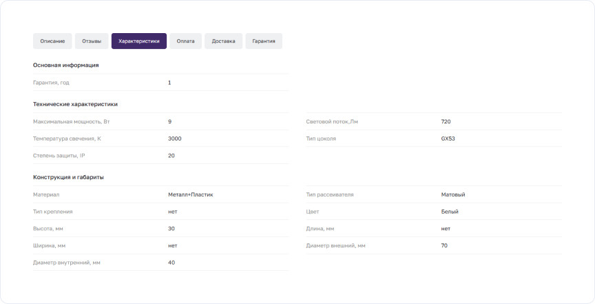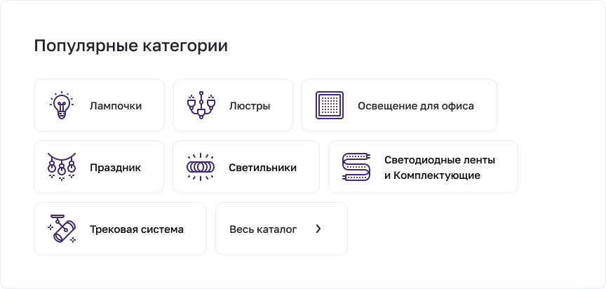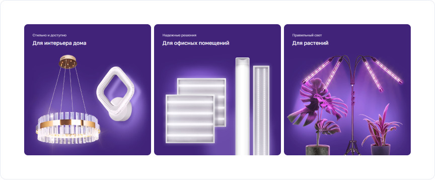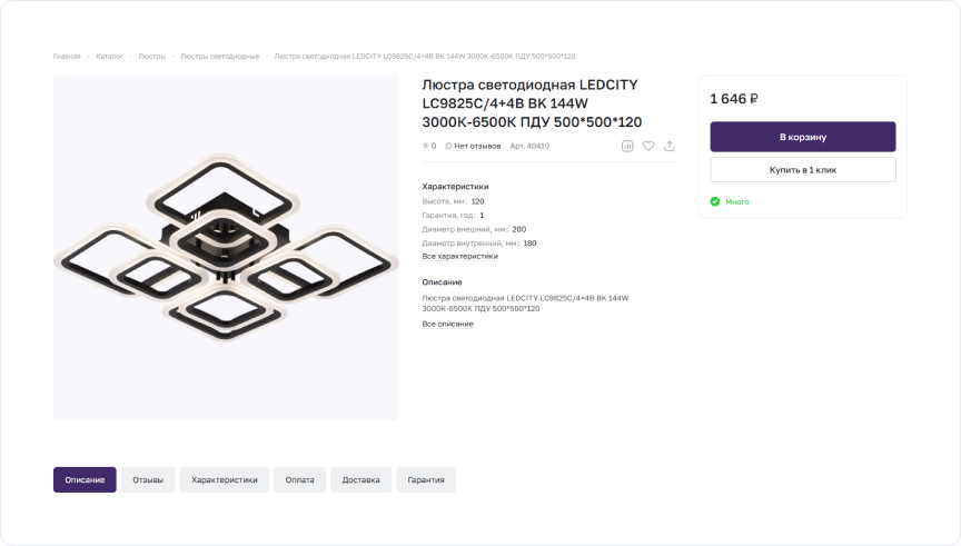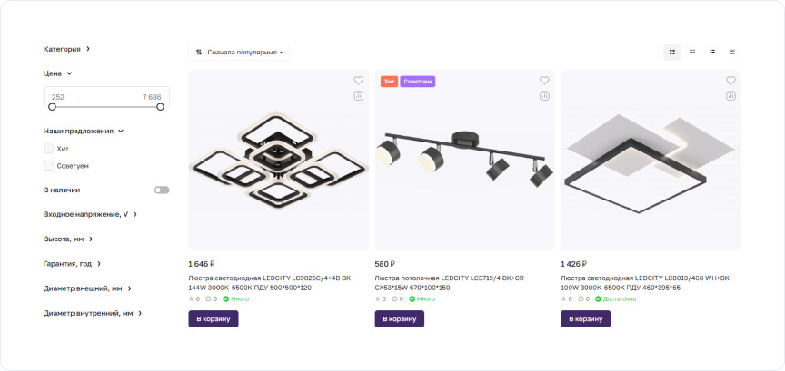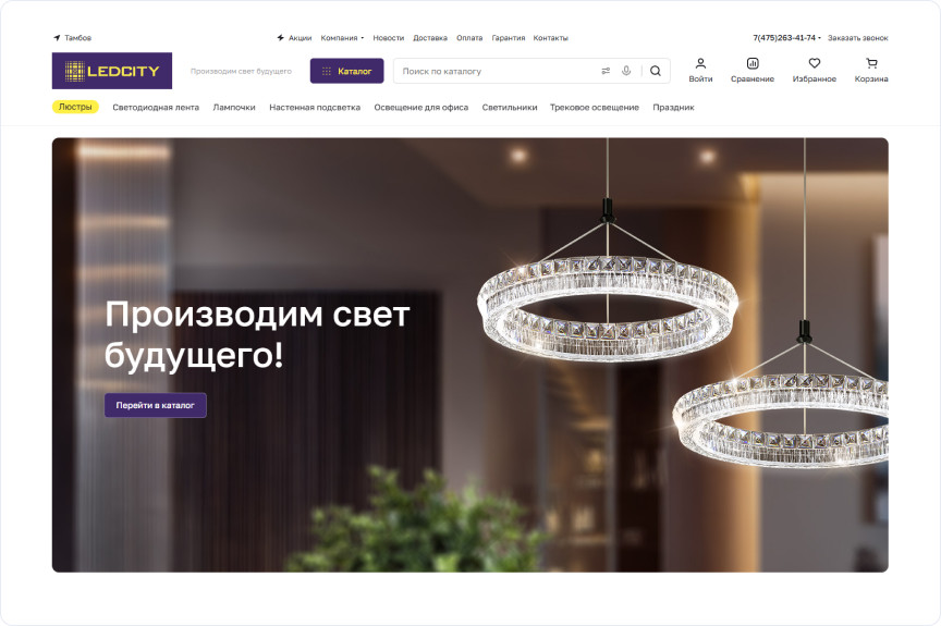 В рамках проекта мы разработали ключевые графические элементы. Основой визуала стал фирменный цвет компании — глубокий фиолетовый. Он используется в баннерах и графических блоках и формирует единый стиль сайта. Главный баннер сделали акцентным. Мы использовали крупные изображения светильников, контрастный фон и лаконичный слоган. Это помогает сразу передать позиционирование компании как технологичного производителя. Баннеры с фоном оформили как сценарии использования продукции — для дома, офиса и растений. За счет единой цветовой гаммы и мягкой подсветки они выглядят как связанная серия и не перегружают страницу. Иконки каталога сделали минималистичными. Они не конкурируют с товарами и помогают пользователю быстрее ориентироваться. Остальные изображения предоставила команда LEDCITY. Главную страницу мы собрали как основную точку входа в каталог. Она задает сценарий взаимодействия пользователя с сайтом. На странице разместили ключевые блоки: главный баннер, баннеры с акциями и категориями, популярные разделы, подборки товаров и блок о компании. Такая структура помогает пользователю быстро перейти к товарам и начать выбор без лишних действий. Параллельно мы подготовили базовые страницы, которые формируют доверие и помогают пользователю ориентироваться. На сайте появились разделы о компании, доставке, оплате, гарантии, а также страницы с реквизитами, контактами и документами. Эти блоки закрывают типовые вопросы и упрощают взаимодействие с клиентом. Основной акцент сделали на каталоге, так как именно он влияет на удобство выбора и конверсию. Мы реализовали полноценную структуру каталога и настроили ключевые элементы. Пользователь может фильтровать товары по характеристикам, видеть их в плиточном формате и сразу понимать, какие позиции есть в наличии. Также на сайте отображаются остатки. В карточке товара мы сгруппировали характеристики, чтобы информация воспринималась проще. Дополнительно разместили данные о доставке, оплате и гарантии. Это позволяет пользователю принять решение без перехода на другие страницы. Процесс оформления заказа адаптировали под задачи бизнеса. Пользователь оформляет заказ прямо на сайте, а основные условия заданы заранее. Мы установили минимальную сумму заказа — 50 000 ₽. Также настроили выбор службы доставки. Среди доступных вариантов — СДЭК, ПЭК, Деловые линии, Байкал Сервис и Возовоз. Финальную стоимость доставки менеджер рассчитывает отдельно после оформления заказа. Интеграция с системой учета стала одной из ключевых задач проекта. Без нее интернет-магазин требует постоянного ручного обновления данных. Мы настроили обмен между сайтом и 1С: передаются товары, цены, остатки и заказы. Также задали регулярность обмена. Товары обновляются каждые 4 часа, а заказы передаются каждые 2 минуты. Это позволяет поддерживать актуальность информации без участия менеджеров и снижает риск ошибок. На финальном этапе мы подготовили сайт к индексации и продвижению. Подключили Яндекс Метрику, настроили цели и электронную коммерцию. Добавили сайт в Яндекс Вебмастер и Google Search Console, чтобы отслеживать индексацию и находить технические ошибки. Для ключевых страниц задали метатеги Title и Description, а также настроили шаблоны генерации метаданных для каталога и карточек товаров. Дополнительно выполнили те
