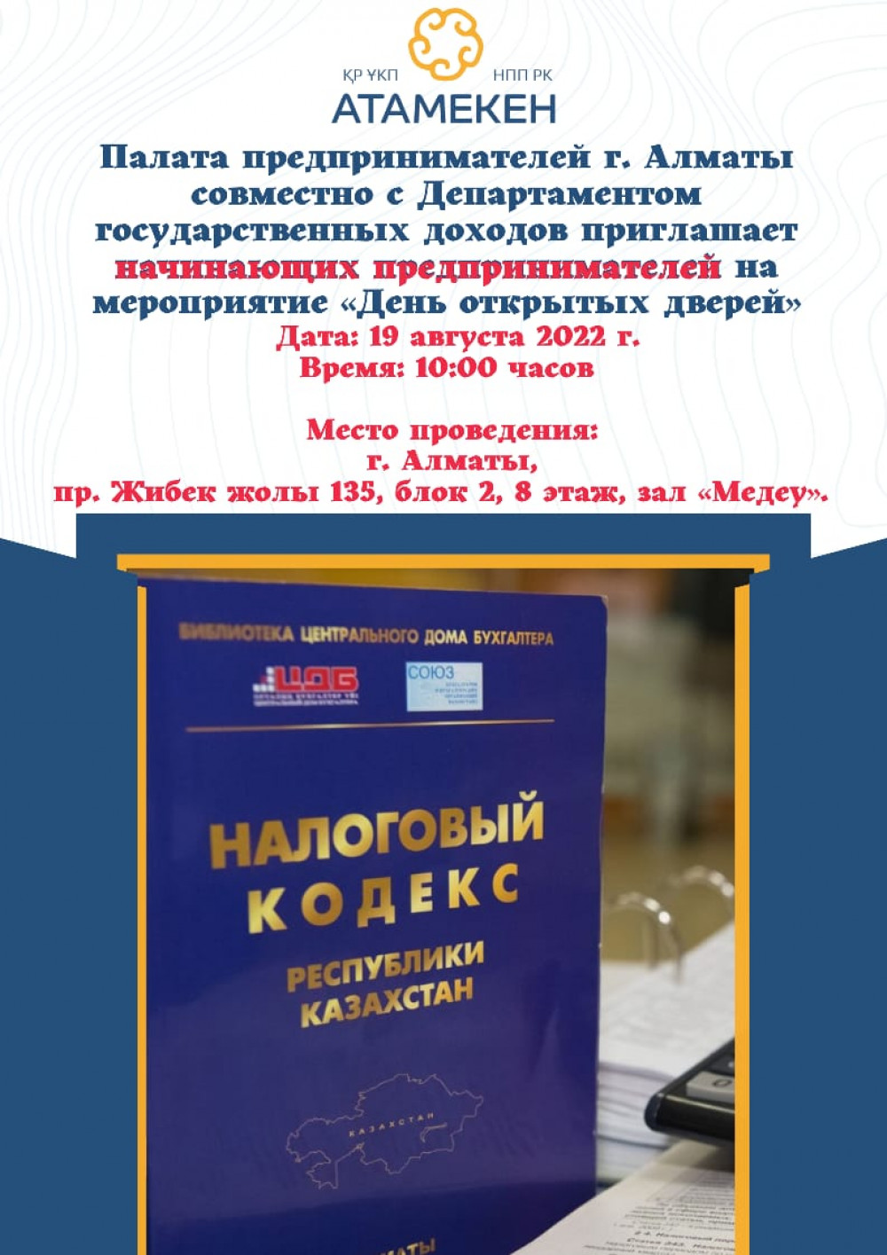 Проведение мероприятия «День открытых дверей» планируется 19 августа 2022 года в 10:00 ч. по адресу: г. Алматы, пр. Жибек жолы 135, блок 2, 8 этаж, зал «Медеу».