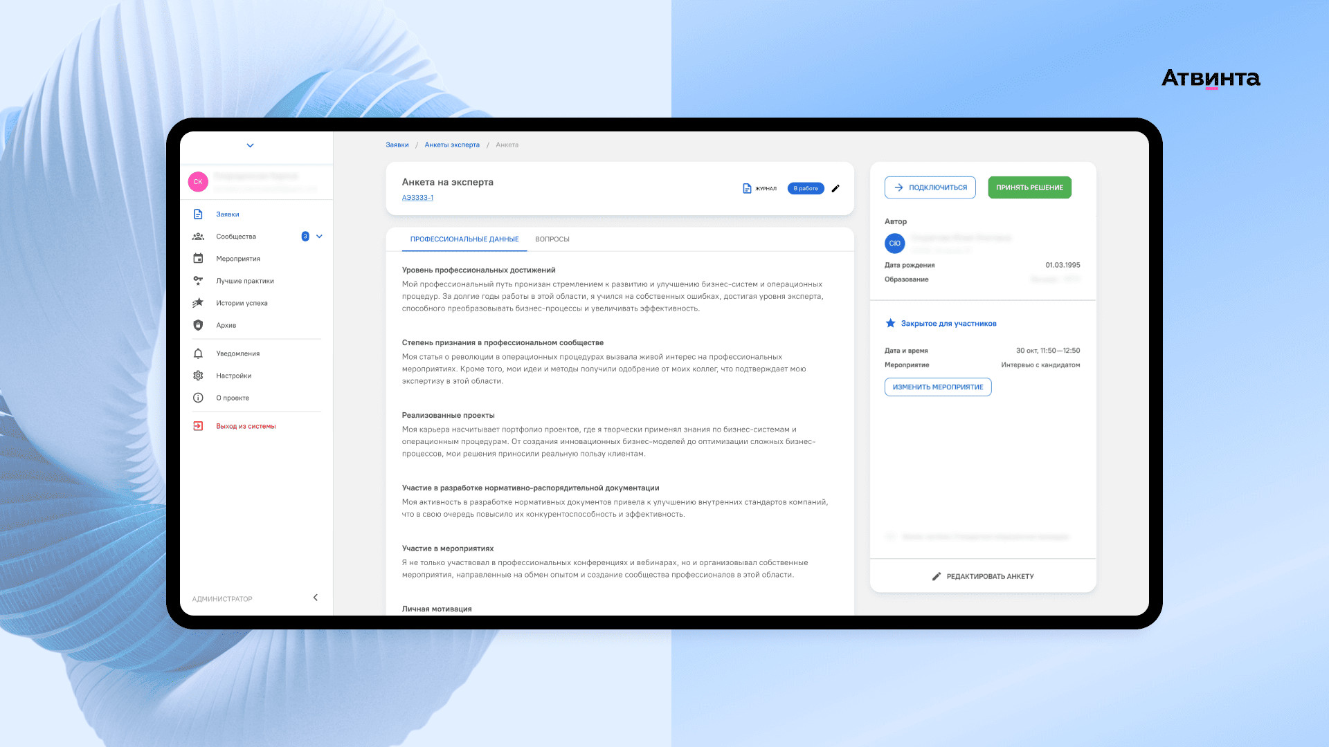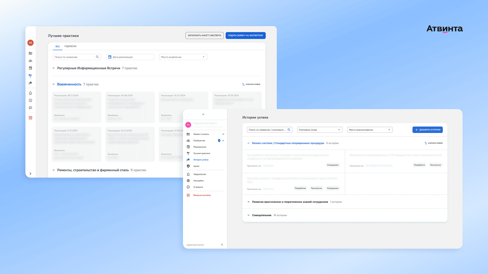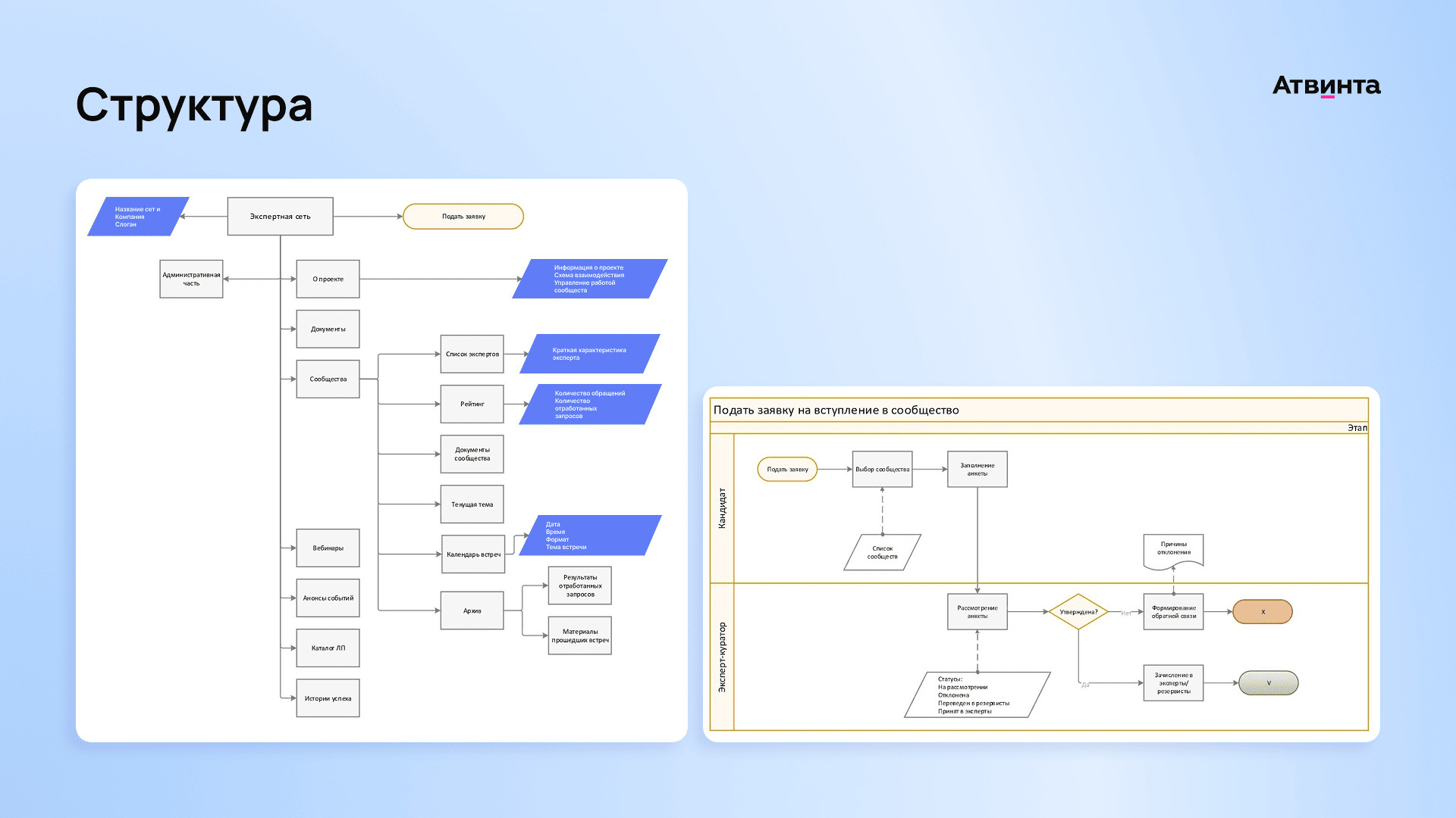 Мы устранили барьер между сотрудниками. Например, теперь технолог из Сибири может получить рекомендации директора по производству из Москвы Другой важный блок продукта — функционал профессиональной соцсети, которая нужна для обмена опытом, обсуждения трендов и совместных брейнштормов. Сотрудники могут объединяться в сообщества по темам, например, производство, ремонт, управление или охрана труда. Чтобы мотивировать пользователей активничать и помогать коллегам, ввели элементы геймификации: лидерборды, баллы и рейтинги. Они действуют как для сообществ, так и для экспертов. Продукт написан на PHP и фреймворках Vue и Laravel. Интерфейс выполнен в едином стиле с другими продуктами и позволяет бесшовно переключаться между ними по одному клику без дополнительной авторизации. Мы работаем с клиентом уже пять лет и отлично понимаем специфику бизнес-процессов в производстве. На этапе брифования клиент поделился видением структуры сервиса и ключевыми требованиями к функционалу, в том числе: Наш отдел аналитики собрал логику сервиса, связал между собой его разделы и составил пути пользователей по ролям. В системе 5 ключевых ролей: В сервисе любой сотрудник компании может запросить консультацию эксперта для решения рабочего вопроса. Мы добавили блок функций, через который специалисты заказывают экспертизу и коммуницируют с экспертом. Чтобы система работала, сначала нужно сформировать пул экспертов, которые будут давать консультации. Для этого мы внедрили систему анкетирования и отбора. Сначала будущий эксперт заполняет в системе анкету, где есть поля с личными данными и подтверждением экспертности — подробное описание опыта, компетенций и навыков. Чтобы облегчить процесс заполнения, добавили примеры и инструкции. Далее анкета попадает к куратору — это отдельная роль в системе для сотрудников, которые отвечают за отбор экспертов и администрирование Экспертной сети. Просматривая анкеты, куратор может добавить дополнительные вопросы, чтобы заранее уточнить детали и подготовить план собеседования. После проверки анкеты куратор назначает собеседование. Если кандидат соответствует требованиям, ему присваивается роль эксперта в системе — и он получает доступ к работе с заявками. Так, наш сервис помогает быстро просматривать анкеты и расширять пул экспертов. Форма подачи заявки на консультацию вынесена в правый верхний угол — кнопка всегда находится перед глазами, чтобы сотрудники могли быстро отправлять запросы. В заявке нужно описать вопрос и указать ожидаемый результат. Заявка отображается в общем реестре и выбранном сообществе. Для удобства предусмотрели систему фильтров, которая позволяет быстро находить нужные запросы по названию, статусу, уровню сложности или назначенному эксперту. С базой заявок работает куратор, который назначает эксперта на решение запроса. Если на эксперта поставили заявку — он получит уведомление в системе и начнет работу на отдельной странице заявки. Например, работнику нужна помощь в поиске стандартов для закупки мебели в новый офис. Эксперт присылает варианты декора и где его можно приобрести. Пользователь берет полученную информацию в работу, и заявка закрывается. Эксперты, пользователи и кураторы могут общаться в чате — у каждой заявки есть окно для обсуждения деталей. После консульта