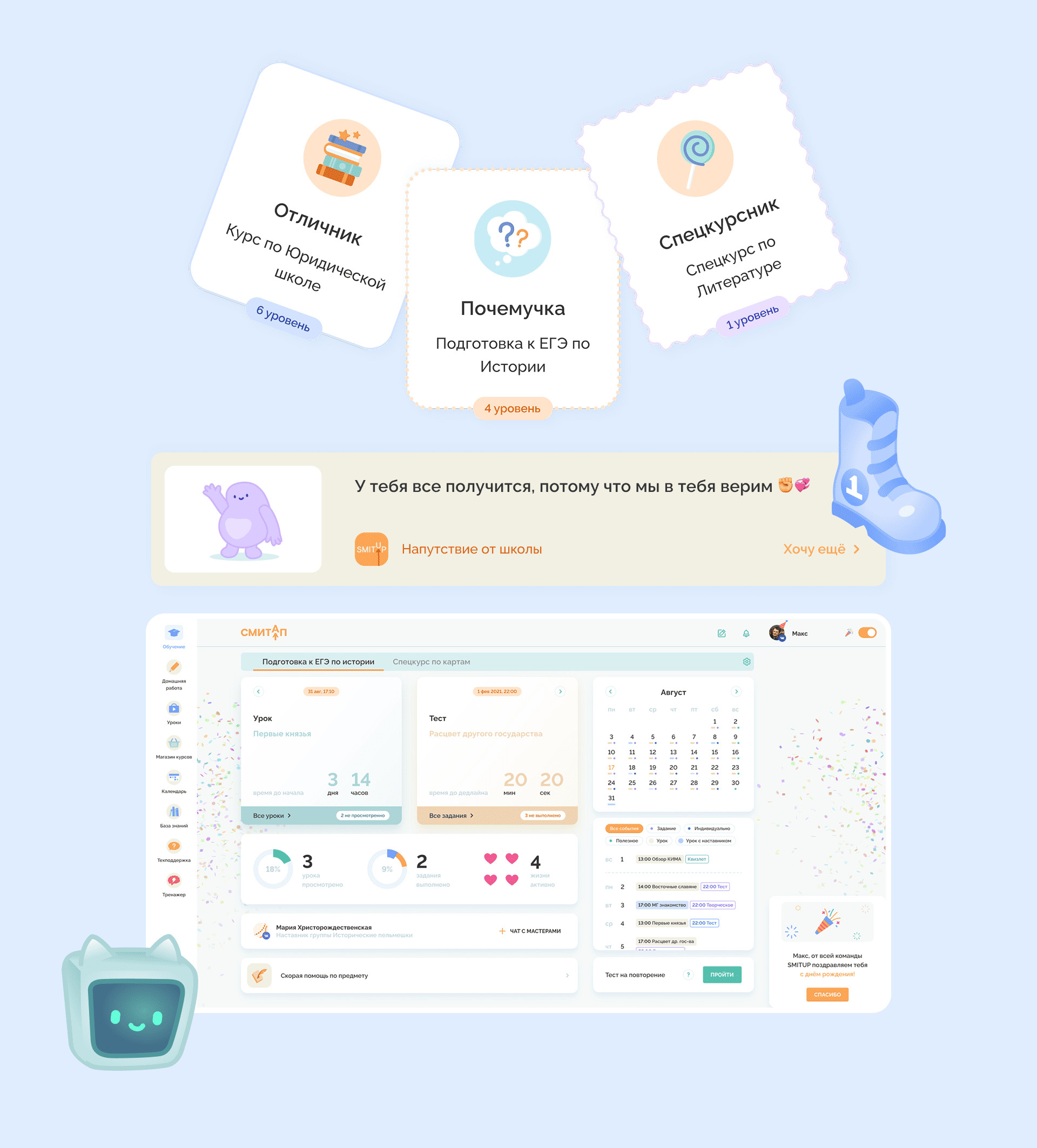 - Онлайн-школа СМИТАП по подготовке к ЕГЭ, в которую каждый день переходят более 8 000 учеников и сдают до 15 000 домашних заданий. Внутри сервиса внедрены игровые механики, автоматизация, редактор курсов, встроенные инструменты для студентов, преподавателей и кураторов.
