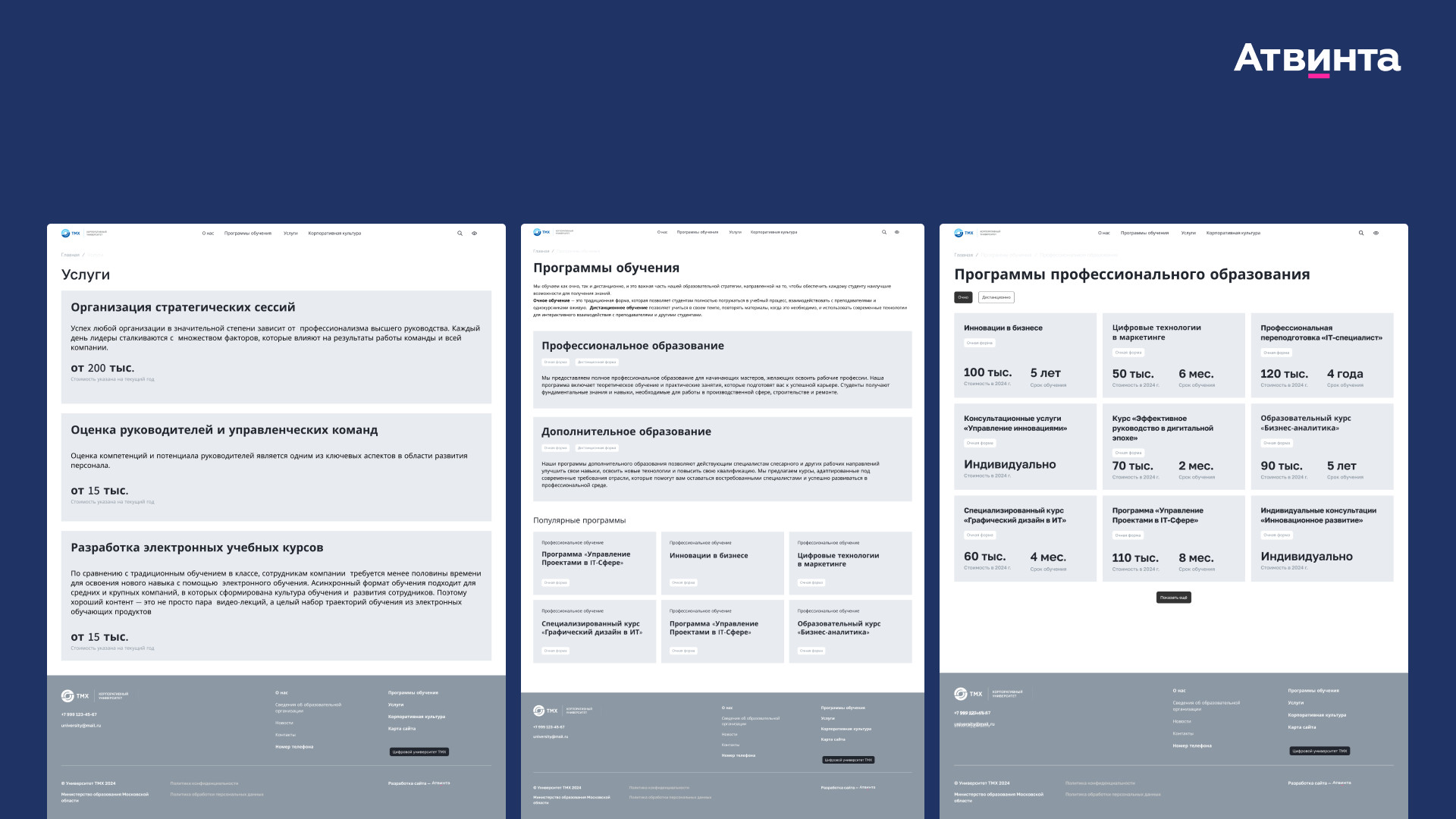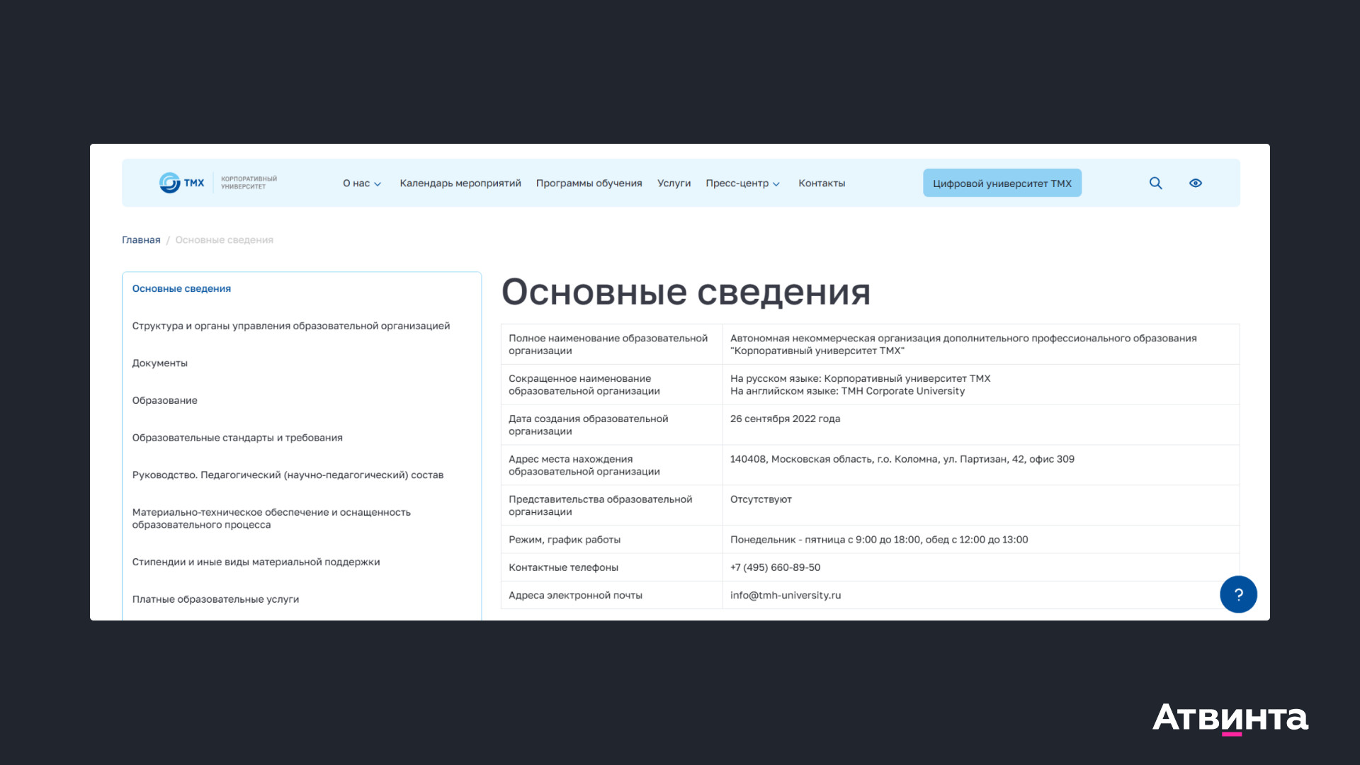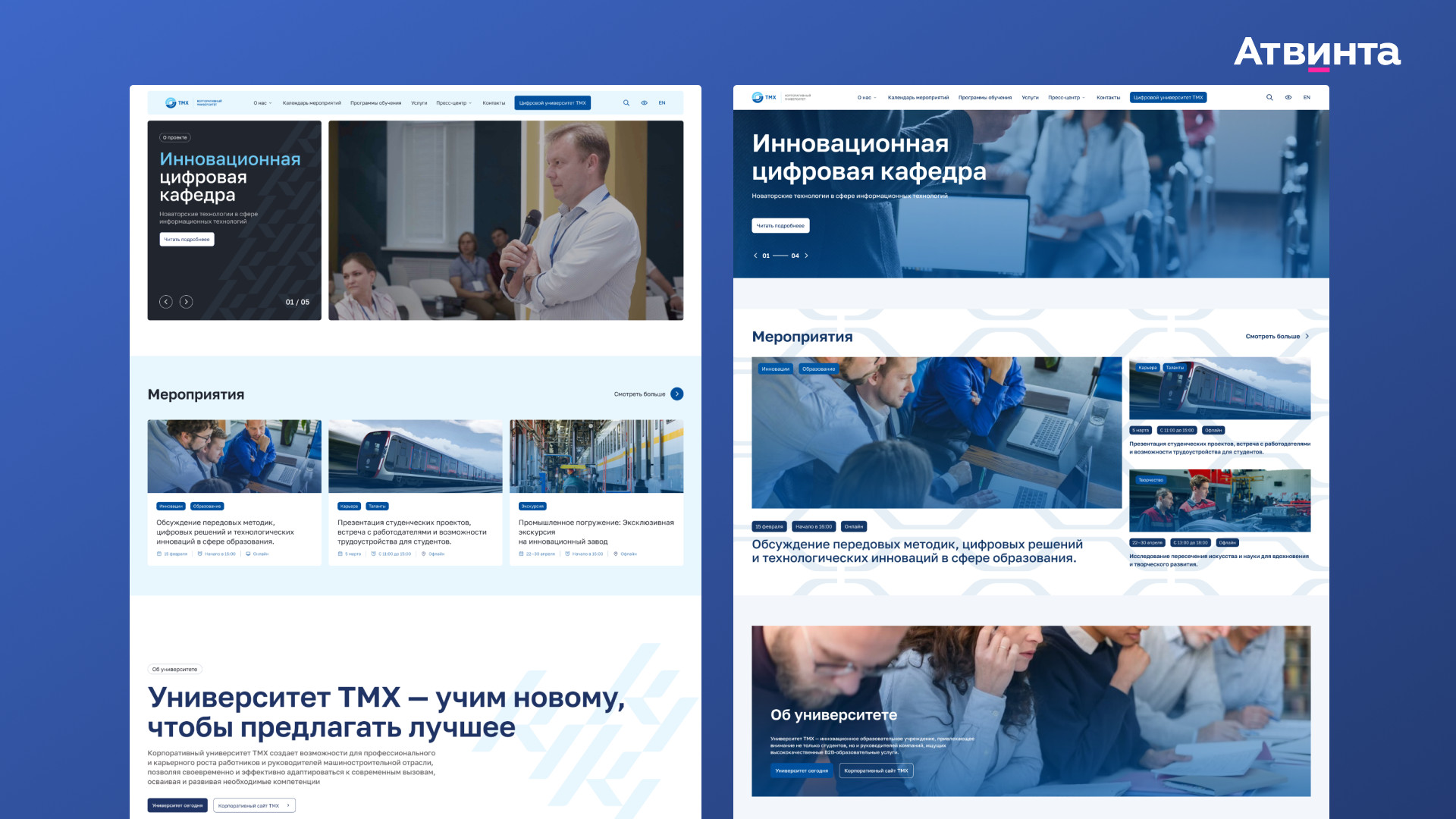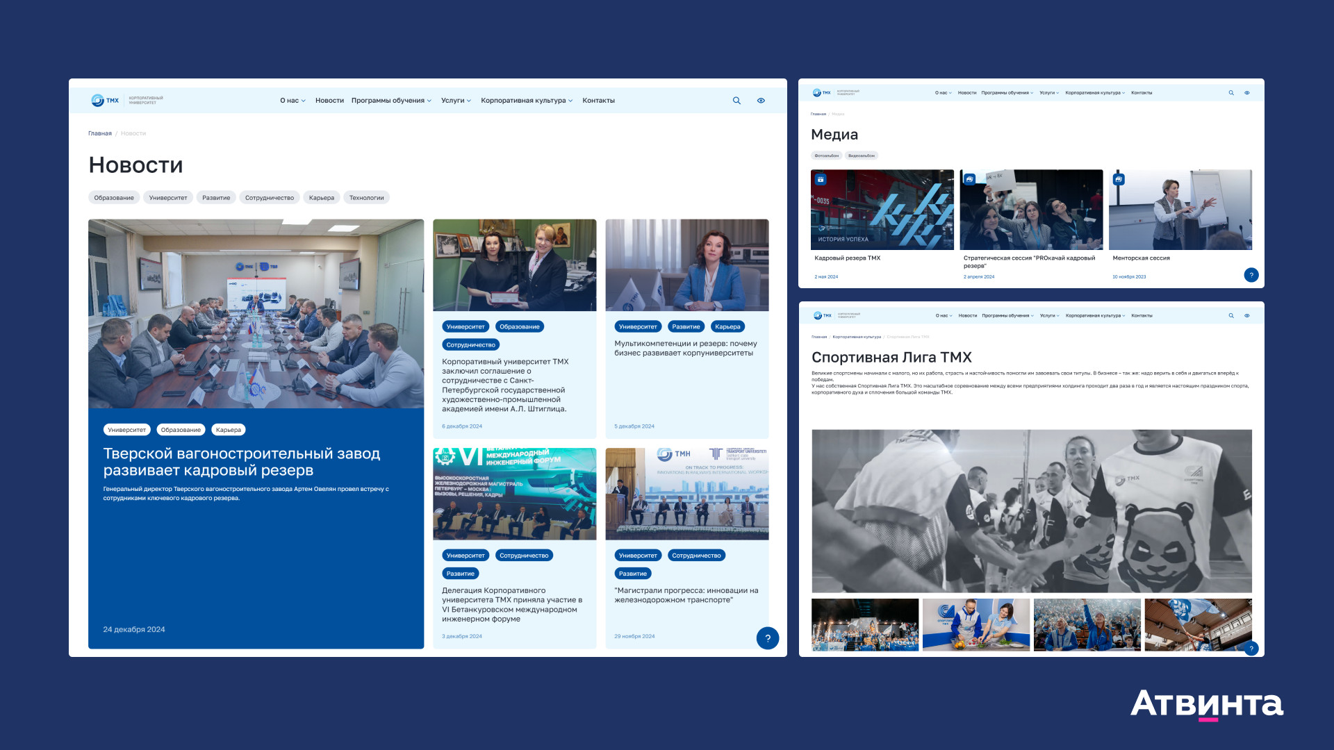 Поступить в университет могут как сотрудники ТМХ, так и специалисты из других компаний. В проекте было важно учесть широкую аудиторию образовательного учреждения. Цель проекта: создать удобный сайт для Корпоративного университета ТМХ, в котором ежегодно обучается более 10 000 человек. Задачи проекта: Мы разработали удобный информационный сайт для университета ТМХ. На нем будущие студенты могут познакомиться с программами обучения, записаться на онлайн-курс или поступить на очное отделение. Для разработки была выбрана платформа 1C-Битрикс, так как это российское решение с возможностью интеграции с различными сервисами, включая «1С: ERP Управление предприятием» и «1С: Бухгалтерия». На этапе аналитики мы собрали бизнес-требования и изучили рекомендации по оформлению сайта со стороны законодательства РФ. К примеру, в сведениях об образовательной организации должны быть данные о структуре и органах управления, подтверждающая документация и стандарты качества. Проанализировали продукты и услуги клиента, специфику бизнеса, а также провели UX-аудит конкурентов и изучили ЦА. Мы выявили несколько паттернов на образовательных сайтах: На основе исследований мы сформировали пользовательский путь для каждой страницы, определили основные функции сайта и лучшие решения на рынке образовательных услуг. Так пользователь сможет легко перейти с главной страницы к программам обучения и подаче заявки через кнопки и виджеты, минимизируя количество кликов. Наши аналитики подготовили структуру сервиса, опираясь на законодательные требования Рособрнадзора и лучшие практики образовательных сайтов. Отдел дизайна собрал прототипы, опираясь на структуру наших аналитиков. На главной странице мы показали выпадающее меню с основными разделами сайта, а также разместили ключевые блоки — информацию об университете и фактические данные, программы обучения и новости. На этапе подготовки дизайн-концепции мы ориентировались на мудборд и референсы. Для презентации общей идеи предложили несколько вариантов оформления главной страницы. Дизайн сайта должен создавать впечатление престижного и надежного учебного заведения. Для этого мы использовали несколько приемов: По итогам этапа дизайна собрали макеты всех страниц и UI kit для дальнейшей верстки. Чтобы презентовать университет ТМХ и показать его статус, мы добавили факты, слоганы, программы обучения, новости и блоки с партнерами. Подробно рассказали про учебное заведение, его цели, ценности и миссию. Так аудитория может узнать о масштабах университета и методах преподавания. Для подтверждения деятельности университета добавили отдельную страницу с документами и контактной информацией. Университет ТМХ предлагает профессиональное и дополнительное образование. Специалисты могут учиться очно, заочно или дистанционно. На странице с программами обучения мы показали карточки специальностей с названиями курсов, кратким описанием и стоимостью. Такой подход позволяет пользователям быстро найти интересующую программу и перейти к более подробному ее изучению. Когда посетитель открывает понравившуюся программу, он может подробнее изучить особенности обучения: для кого рассчитан курс, из каких блоков он состоит и какие знания получит специалист. Здесь есть форма заявки, а также указан срок и форма об