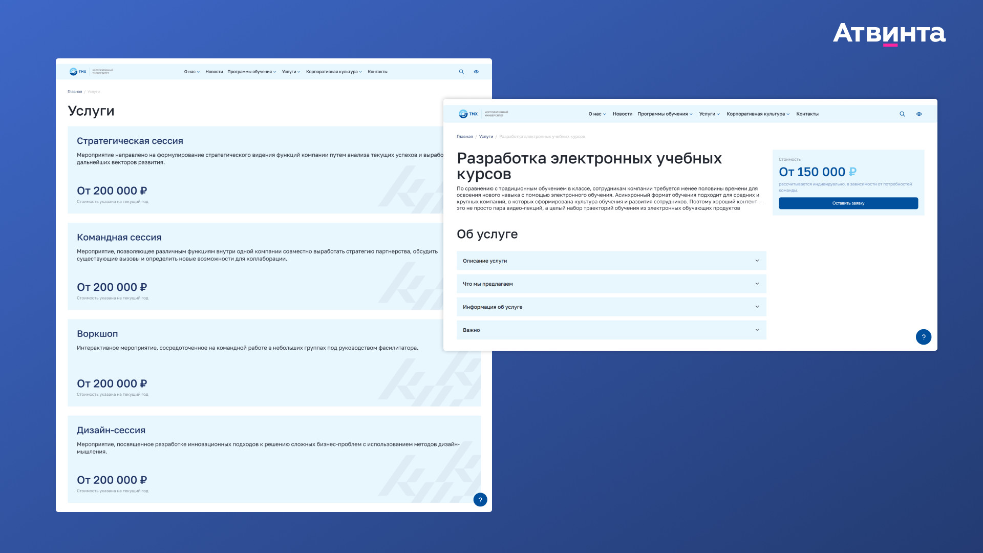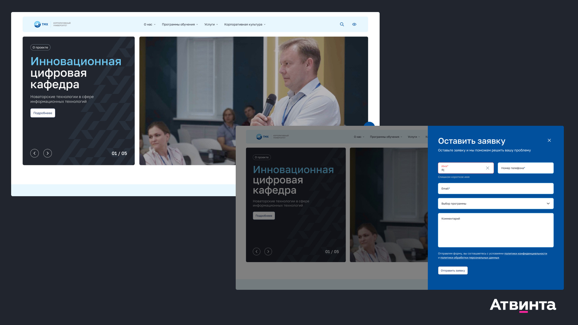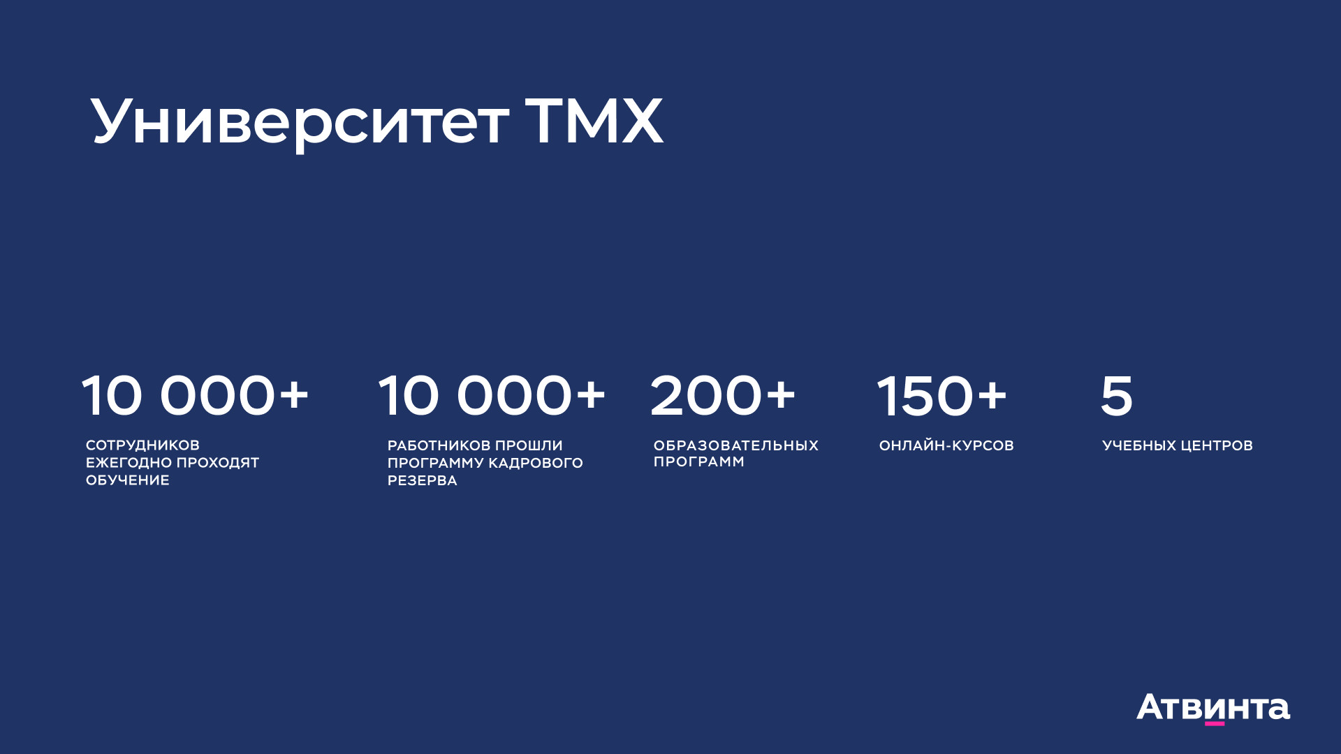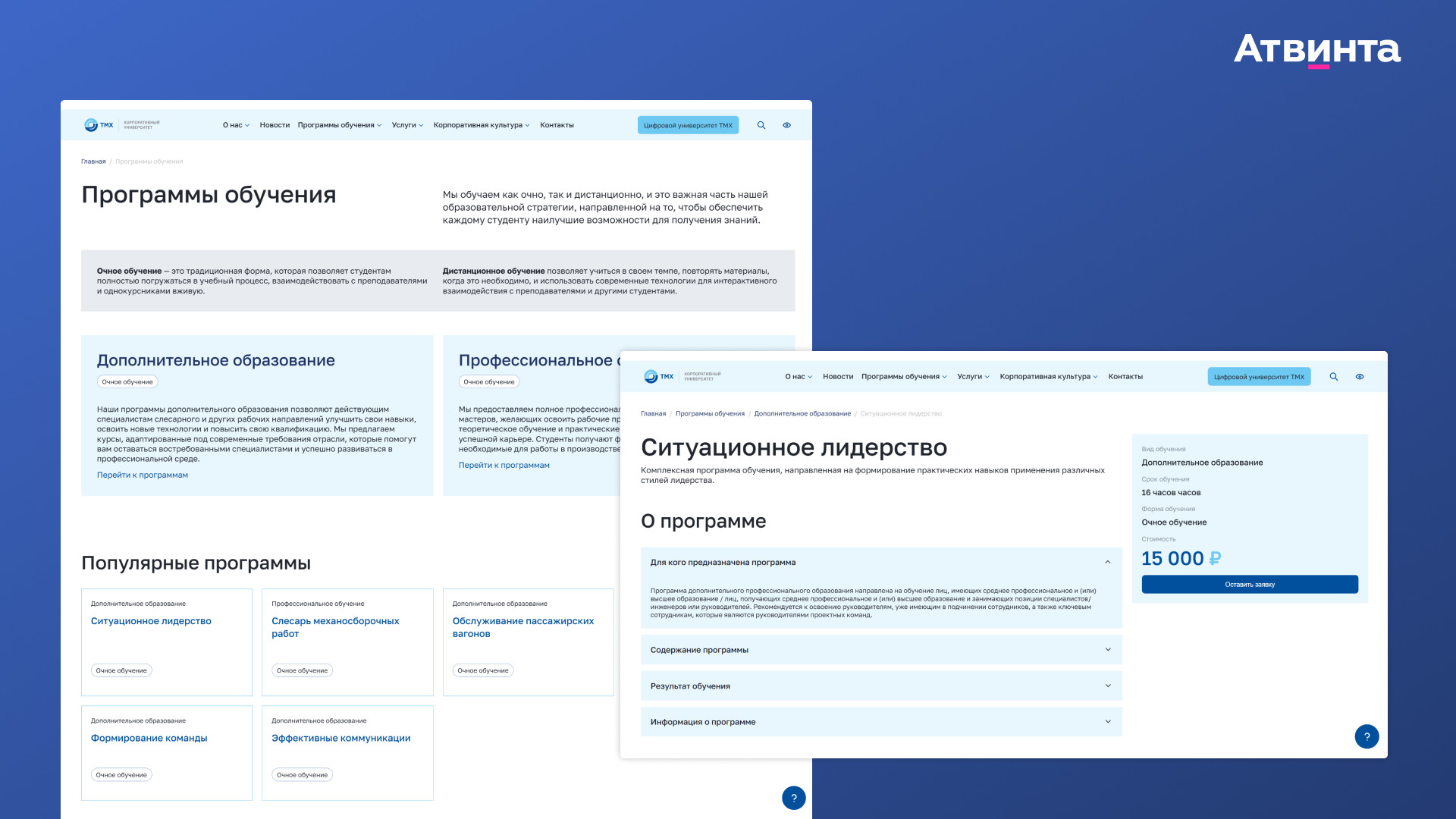 Поступить в университет могут как сотрудники ТМХ, так и специалисты из других компаний. В проекте было важно учесть широкую аудиторию образовательного учреждения. Цель проекта: создать удобный сайт для Корпоративного университета ТМХ, в котором ежегодно обучается более 10 000 человек. Задачи проекта: Мы разработали удобный информационный сайт для университета ТМХ. На нем будущие студенты могут познакомиться с программами обучения, записаться на онлайн-курс или поступить на очное отделение. Для разработки была выбрана платформа 1C-Битрикс, так как это российское решение с возможностью интеграции с различными сервисами, включая «1С: ERP Управление предприятием» и «1С: Бухгалтерия». На этапе аналитики мы собрали бизнес-требования и изучили рекомендации по оформлению сайта со стороны законодательства РФ. К примеру, в сведениях об образовательной организации должны быть данные о структуре и органах управления, подтверждающая документация и стандарты качества. Проанализировали продукты и услуги клиента, специфику бизнеса, а также провели UX-аудит конкурентов и изучили ЦА. Мы выявили несколько паттернов на образовательных сайтах: На основе исследований мы сформировали пользовательский путь для каждой страницы, определили основные функции сайта и лучшие решения на рынке образовательных услуг. Так пользователь сможет легко перейти с главной страницы к программам обучения и подаче заявки через кнопки и виджеты, минимизируя количество кликов. Наши аналитики подготовили структуру сервиса, опираясь на законодательные требования Рособрнадзора и лучшие практики образовательных сайтов. Отдел дизайна собрал прототипы, опираясь на структуру наших аналитиков. На главной странице мы показали выпадающее меню с основными разделами сайта, а также разместили ключевые блоки — информацию об университете и фактические данные, программы обучения и новости. На этапе подготовки дизайн-концепции мы ориентировались на мудборд и референсы. Для презентации общей идеи предложили несколько вариантов оформления главной страницы. Дизайн сайта должен создавать впечатление престижного и надежного учебного заведения. Для этого мы использовали несколько приемов: По итогам этапа дизайна собрали макеты всех страниц и UI kit для дальнейшей верстки. Чтобы презентовать университет ТМХ и показать его статус, мы добавили факты, слоганы, программы обучения, новости и блоки с партнерами. Подробно рассказали про учебное заведение, его цели, ценности и миссию. Так аудитория может узнать о масштабах университета и методах преподавания. Для подтверждения деятельности университета добавили отдельную страницу с документами и контактной информацией. Университет ТМХ предлагает профессиональное и дополнительное образование. Специалисты могут учиться очно, заочно или дистанционно. На странице с программами обучения мы показали карточки специальностей с названиями курсов, кратким описанием и стоимостью. Такой подход позволяет пользователям быстро найти интересующую программу и перейти к более подробному ее изучению. Когда посетитель открывает понравившуюся программу, он может подробнее изучить особенности обучения: для кого рассчитан курс, из каких блоков он состоит и какие знания получит специалист. Здесь есть форма заявки, а также указан срок и форма об