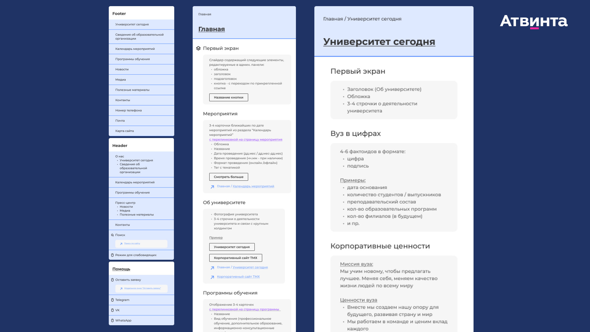 Клиенту нужен был понятный и информативный сайт с удобной навигацией, интеграцией с внутренними системами и возможностью сбора заявок на образовательные программы и услуги университета.