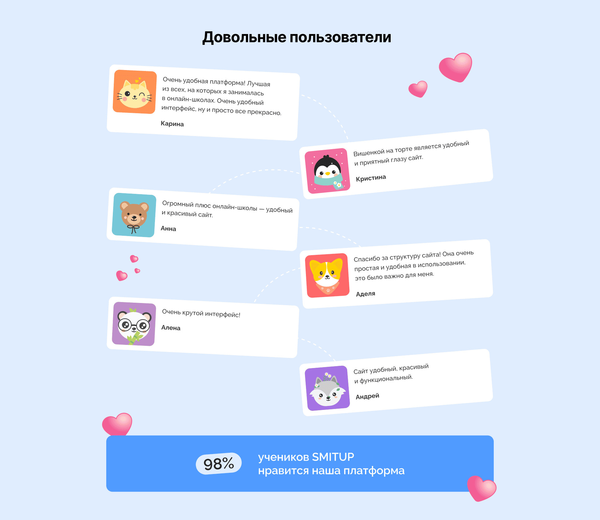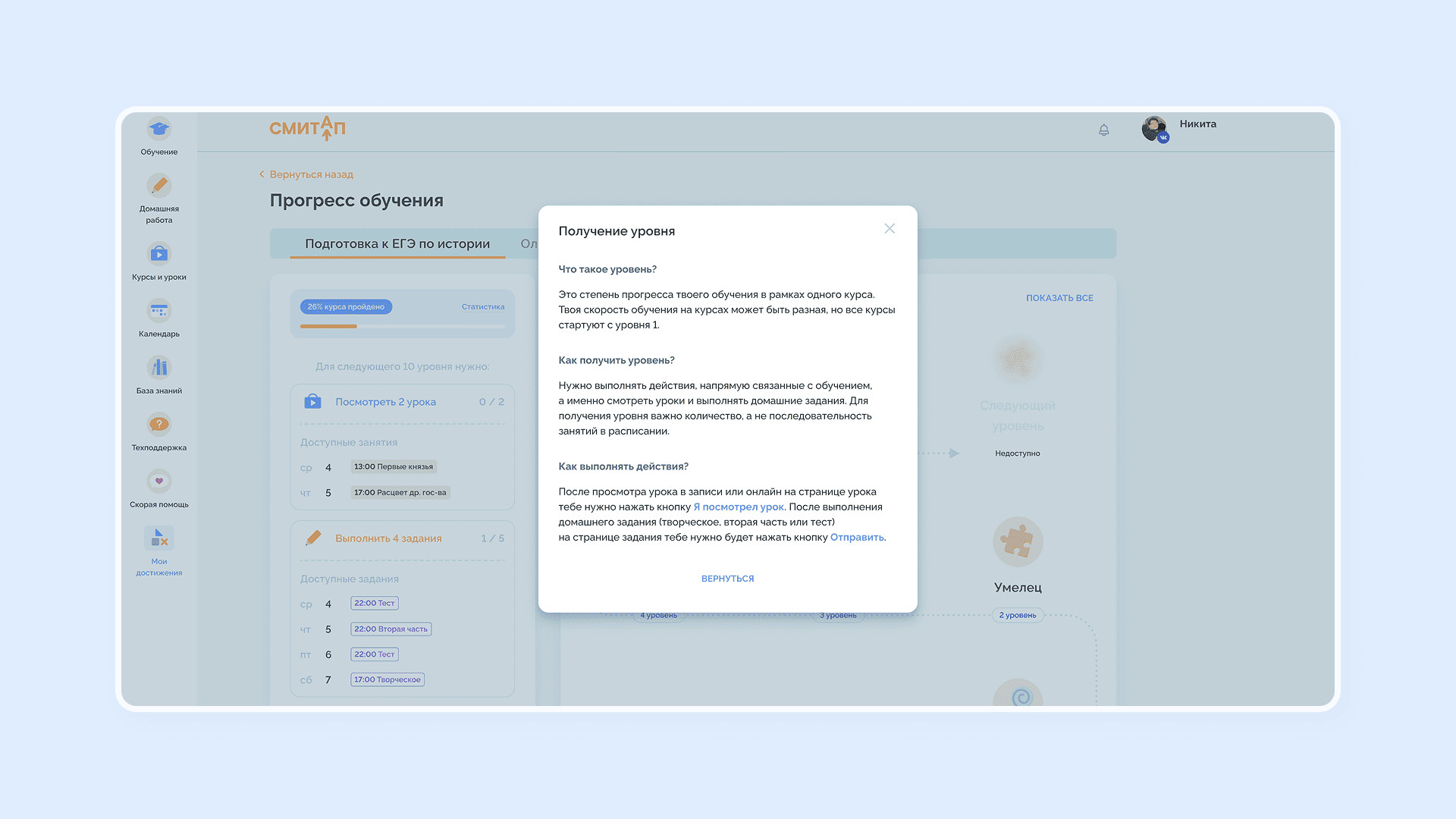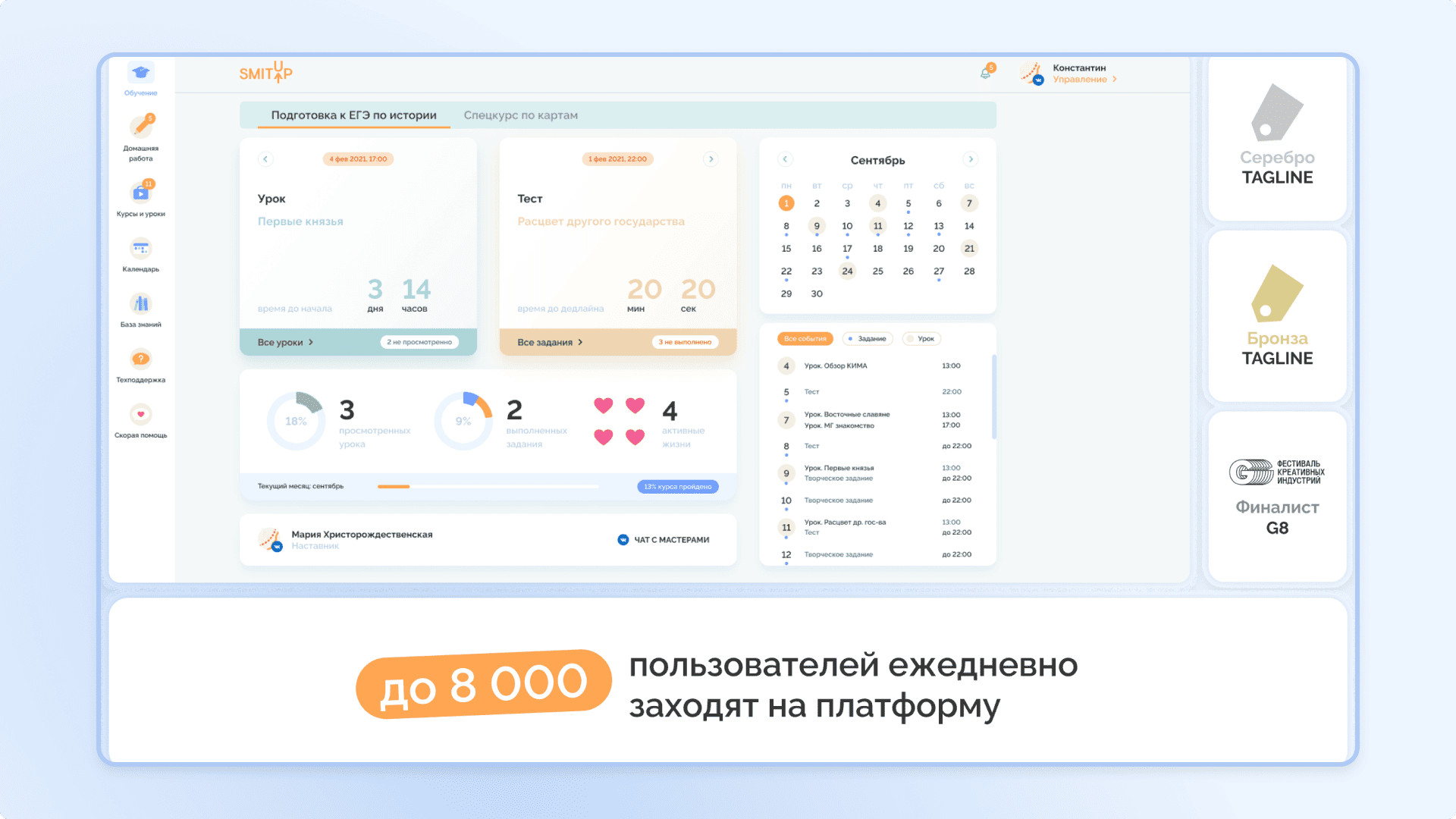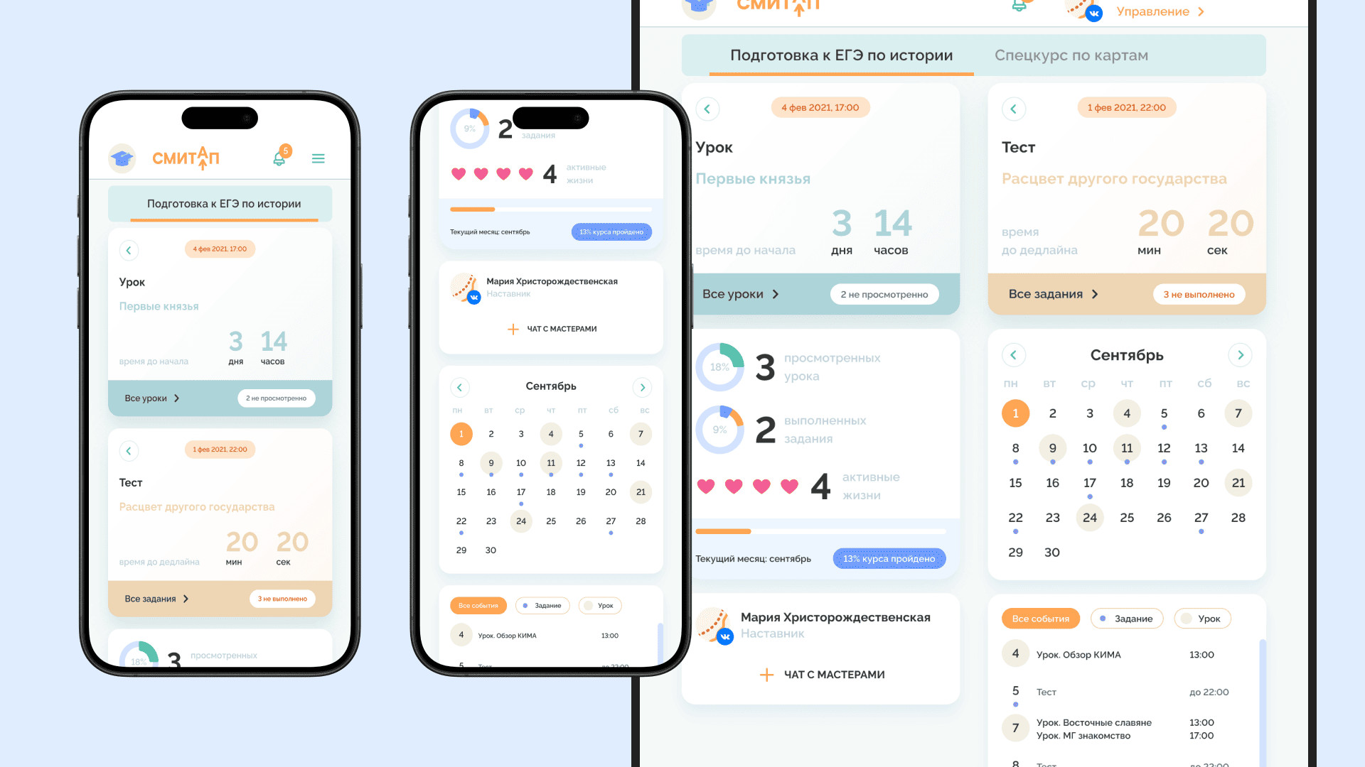 Один из наших крупных кейсов — разработка образовательной платформы для онлайн-школы «СМИТАП», в которой более 20 000 учеников готовятся к ЕГЭ. Площадка построена вокруг гибкой системы занятий с элементами геймификации. Она рассчитана на подростковую аудиторию и работает с высокой нагрузкой — до 8 000 пользователей в день.