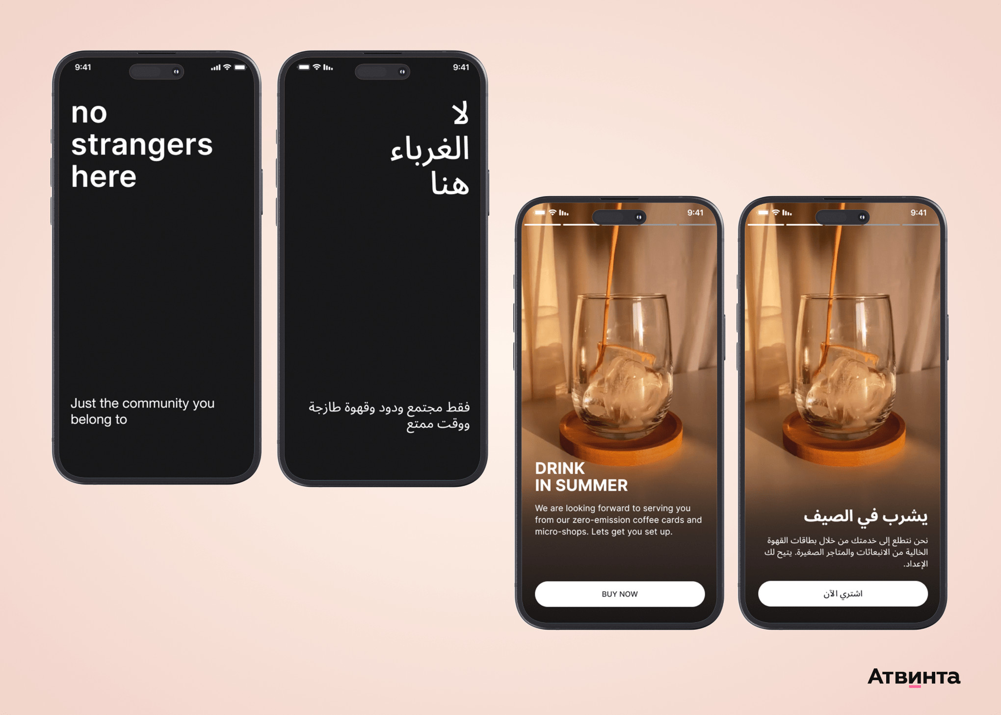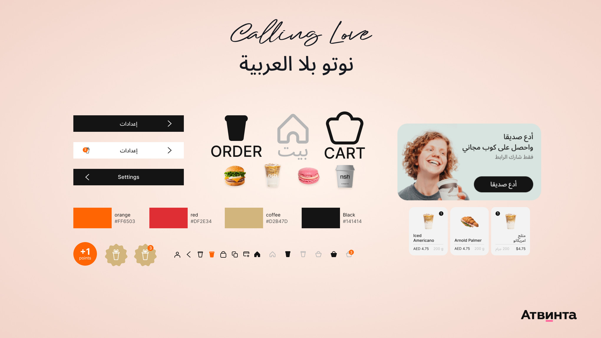 Также собрали UI kit с основными элементами приложения: цветовая гамма, шрифты, иконки, карточки товаров, лого и другие повторяющиеся блоки. Так как кофейня была стартапом, было важно учесть, что в будущем понадобятся доработки интерфейса. Эти артефакты нужно было передать заказчику. В интерфейсе реализовали все функции и экраны, необходимые для пути клиента: от регистрации до оформления заказа и бонусной системы. Первое, что видит пользователь — это загрузочный экран и приветствие. Сначала мы показали название кофейни и слоган компании. Затем видеоролик и краткое объяснение того, где найти кофейню и как получать награды. Помимо приветствия есть краткий онбординг — как пользоваться приложением. Такой подход способствует успешной адаптации аудитории и снижает риск потери пользователей на этапе знакомства. Для прохождения регистрации пользователю нужно подтвердить свой номер телефона. Он может выбрать любую страну, заполнить данные, получить код верификации — и перейти к основному функционалу. В кофейне действует акция «Приведи друга», поэтому в окне регистрации можно указать его или ее номер и получить напиток в подарок. Это не только мотивирует новую аудиторию к установке приложения, но и способствует органическому росту клиентской базы за счет рекомендаций от лояльных пользователей. В меню даны карточки товаров с изображением продукта, названием, стоимостью и его весом и объемом. Когда пользователь открывает карточку — он выбирает объем напитка и добавки к нему: сиропы, сахар или мед, растительное или коровье молоко и так далее. Затем добавляет кофе и переходит в корзину. Клиент может сделать заказ, но оплата происходит непосредственно в кофейне во время выдачи товара. Покупка отображается на домашнем экране — пользователь видит место, где забирать напиток. А если нажать на кнопку «Просмотр заказа» — можно получить полную информацию. Гибкий интерфейс настроен с учетом специфики продукта: кофе — напиток, который требует индивидуальных опций, особенно для искушенной публики. Возможность выбора подчеркивает заботу о клиентах и высокий уровень сервиса. После получения напитка на домашнем экране будет отображаться выполненный заказ и товары, которые в нем были. Для удобства мы добавили функцию повторения покупки. Новые заказы отображаются сверху, а прошлые — под ними. На домашнем экране в начале показываются сезонные предложения и истории, а затем — бонусная программа и акции. Например, клиент может привести друга или набрать отметки за заказы — и получить напиток в подарок. Приложение дает возможность клиентам накапливать бонусы. Все привилегии хранятся в одном месте и под рукой. Подобное внимание к деталям подчеркивает клиентоориентированность кофейни. Подарок находится в правом верхнем углу — пользователь видит, сколько бесплатных напитков он может выбрать в меню. В настройках пользователь может поменять свои данные, посмотреть историю заказов, выбрать параметры уведомлений, оценить приложение и обратиться в техподдержку. Простое управление и возможность быстро обратиться за помощью укрепляет доверие к бренду и показывает уровень сервиса. Приложением в Дубае будет пользоваться разная аудитория — сейчас город является точкой притяжения для людей со всего мира. Поэтому мы сделали две версии — английс