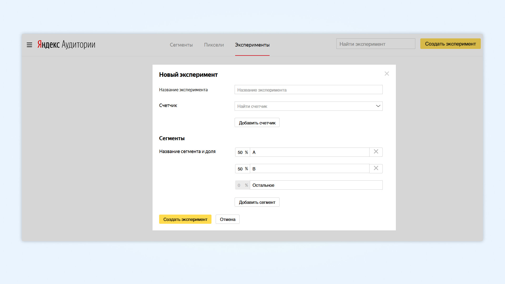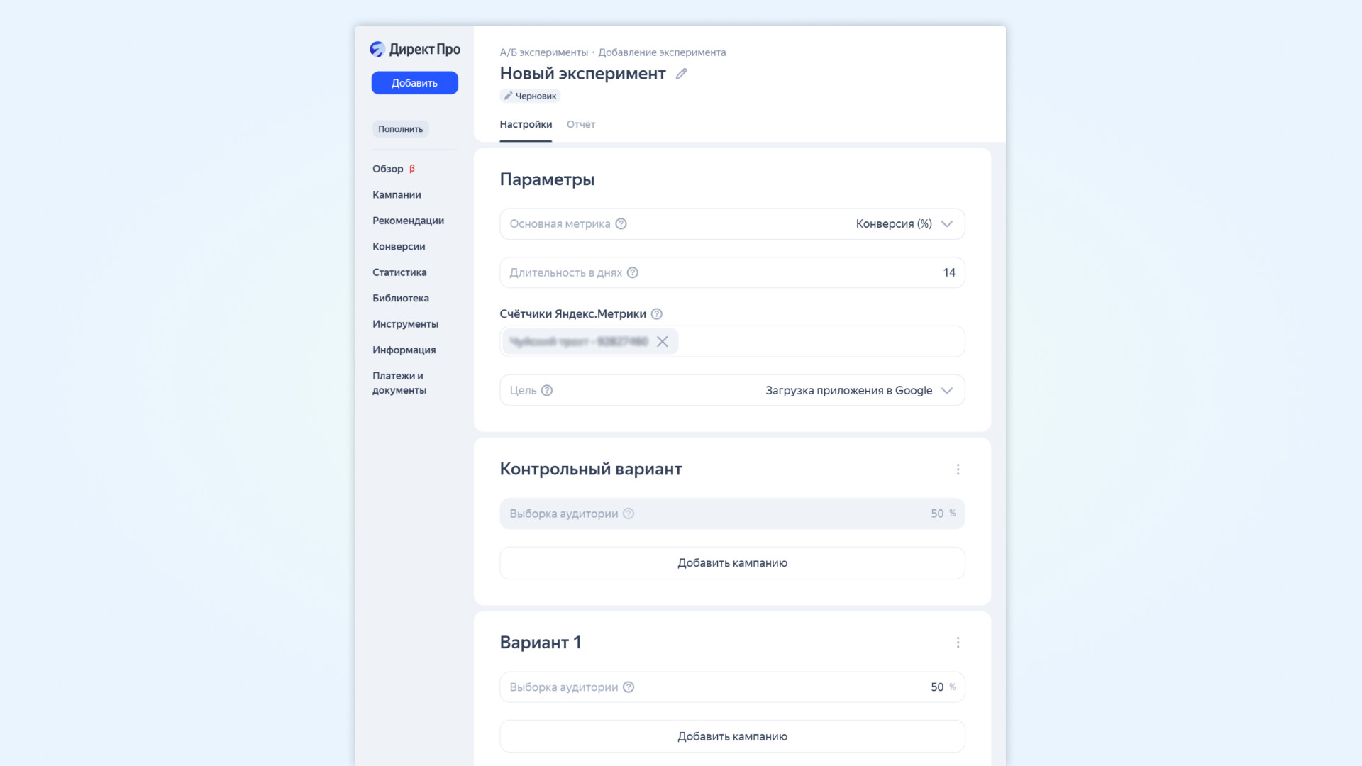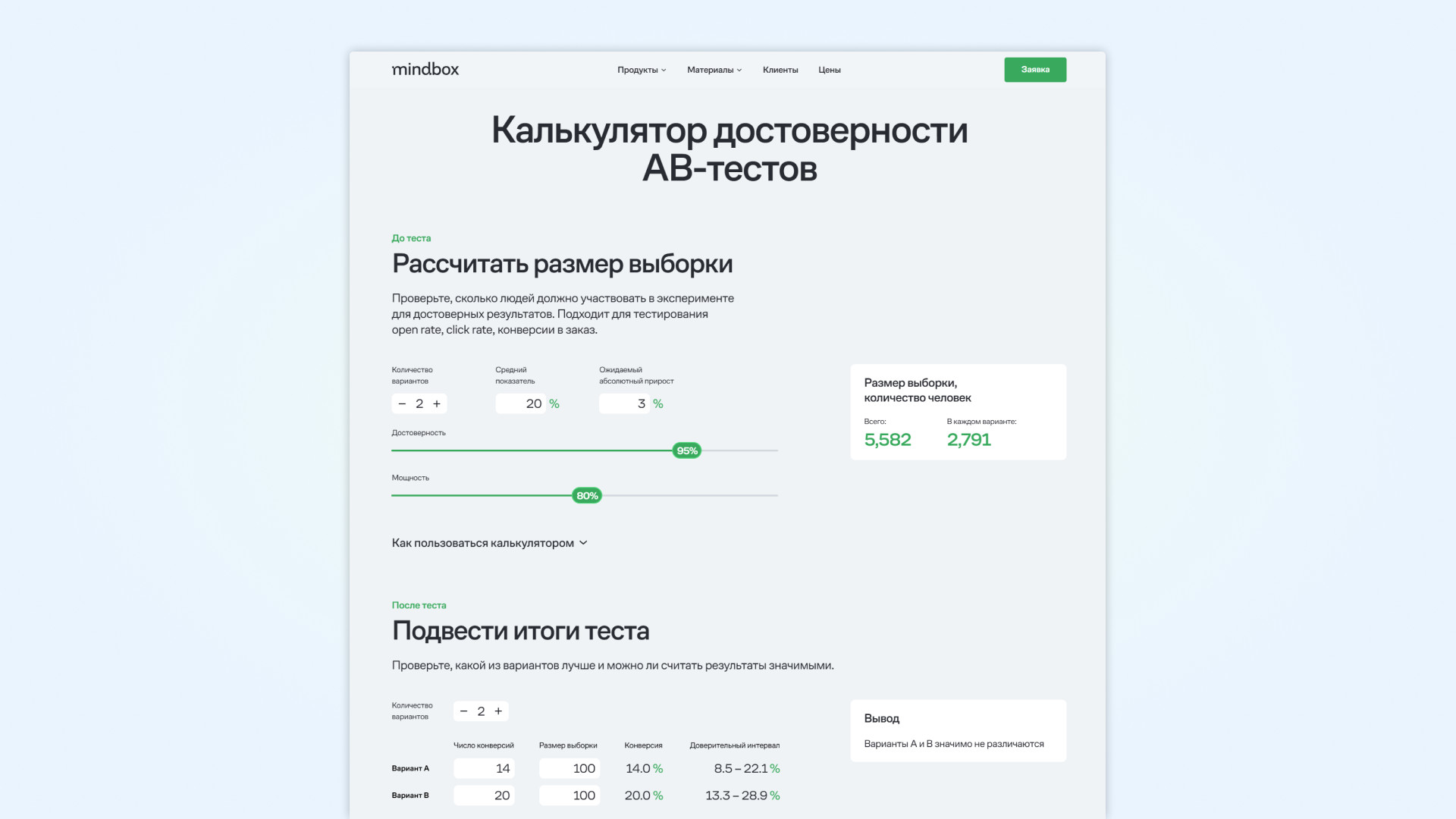Яндекс.Директ — это платформа для запуска контекстной рекламы. Здесь можно проводить эксперименты с кампаниями и объявлениями на поиске и в РСЯ. Также через инструмент Яндекс.Аудитории тестируют сегменты пользователей. Система дополнительно связана с Яндекс.Метрикой, в которой можно посмотреть результаты исследования в разделе «Источники — Яндекс.Директ, эксперименты». VK Ads — сервис для запуска таргетированной рекламы в социальной сети ВК и на площадках партнеров. Ранее в старом кабинете A/B-тесты были в отдельной вкладке, в новом же нужно создать объявления и сегментировать аудиторию. Varioqub — сервис Яндекса для проведения тестов на сайте или в мобильном приложении. Инструмент встроен в Яндекс.Метрику. Полученные данные можно проверить в Яндекс.Метрике, а также воспользоваться Вебвизором, проверкой форм и картами ссылок, кликов и скроллинга. Это поможет отследить взаимодействие аудитории с сайтом. Calltouch — сервис сквозной аналитики, в котором можно провести A/B-тестирование, чтобы проверить, как изменения в РК и на сайте влияют на звонки, заявки и конверсии. Получить результаты можно по запросу или в личном кабинете — это зависит от того, отличаются ли у вас номера на разных версиях сайта или нет. UX Rocket — платформа продуктовой аналитики и A/B-тестирования на сайтах и в приложениях. Здесь можно собирать события, отслеживать метрики, настраивать воронки, изучать поведение пользователей, проводить различные тесты и даже использовать визуальный редактор. Mindbox — инструмент для запуска рассылок и автоматизации маркетинга. В личном кабинете и на сайте есть калькулятор достоверности A/B-тестов, позволяющий быстро рассчитать размер выборки аудитории, а также примерные результаты. Чтобы результаты экспериментов были достоверными, требуется подготовка и четкое понимание того, для чего именно вы проводите тест. Разберем шаги для проведения A/B-тестирования. Перед началом работ нужно провести несколько исследований, чтобы обнаружить недочеты и понять ситуацию с продуктом: Сформулируйте, какой показатель нужно улучшить исходя из полученных данных. Это может быть конверсия, кликабельность или снижение отказов. Что важно: На основе информации и статистики сформулируйте гипотезу, которую хотите проверить. Она должна включать изменение, которое вы предполагаете внедрить, и ожидаемый результат. Оригинальный вариант станет контрольной группой (A), а измененный — тестируемой (B). Внесите только одну модификацию за раз, чтобы можно было точно определить ее влияние. Распределение пользователей между группами должно быть равномерным и случайным. Например, 50 процентов посетителей видят оригинальный вариант (A), а другая половина — тестируемый (B). Тестирование должно длиться достаточно долго, чтобы охватить соответствующее количество пользователей и исключить влияние случайных факторов. Как определить продолжительность: После завершения теста тщательно проанализируйте полученные результаты. Что важно проверить: Один успешный тест не всегда гарантирует достоверный результат. Проведите дополнительные исследования для подтверждения гипотезы. Если при первом тестировании вариант B показал рост конверсии на 20%, попробуйте повторить его через месяц, чтобы убедиться в стабильности. Если тестируемый вариант показал улучшение ключевых мет