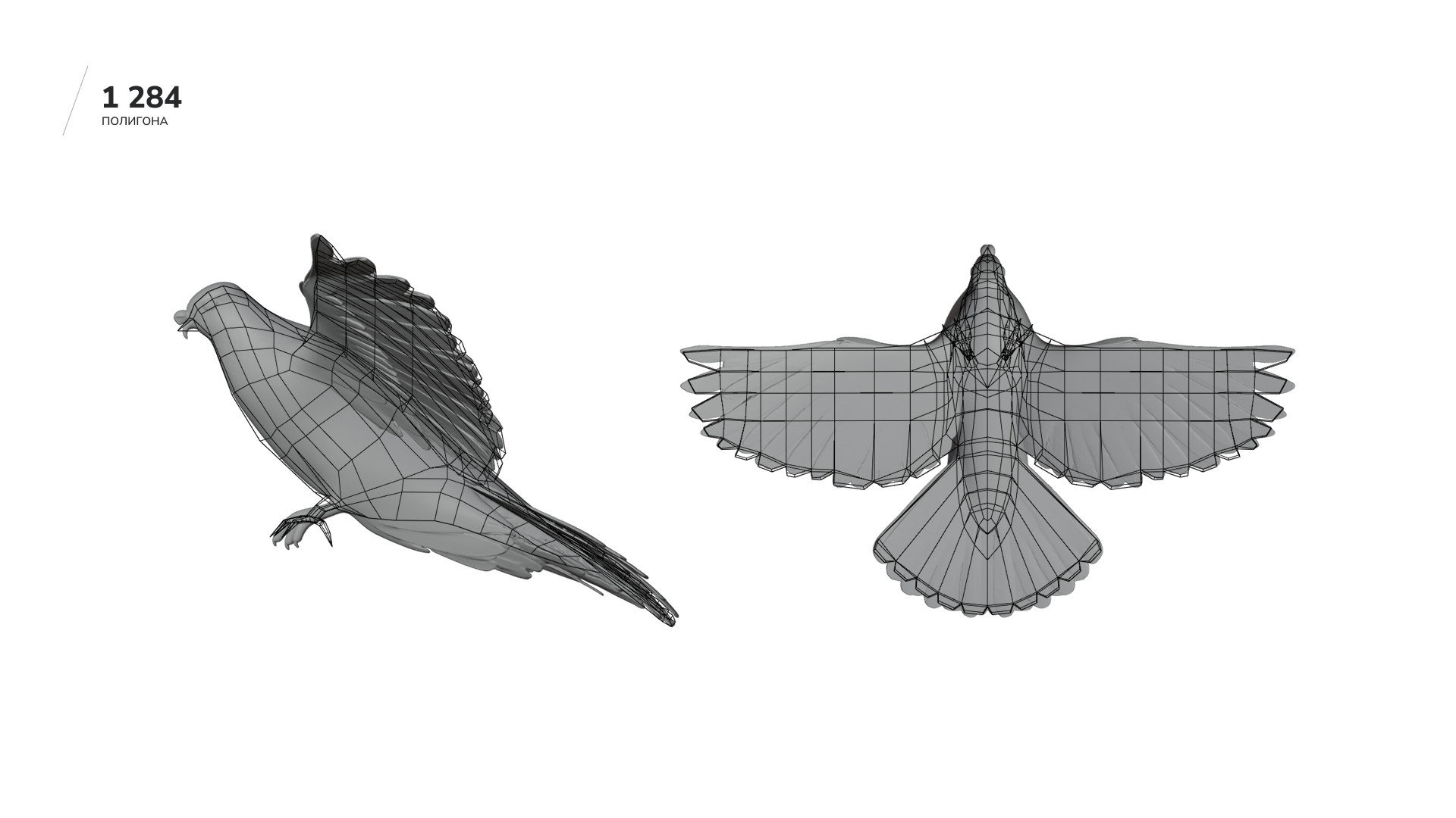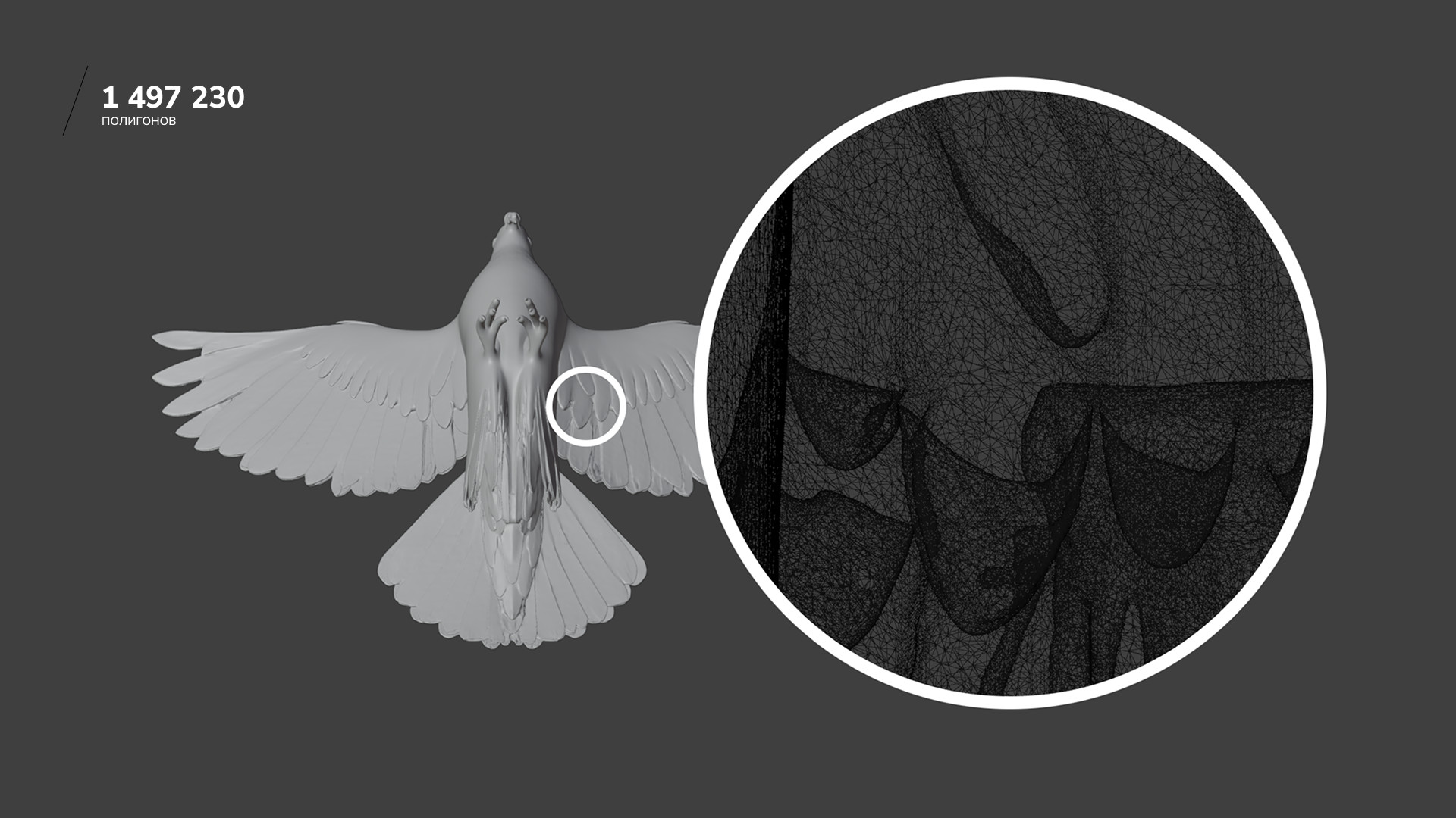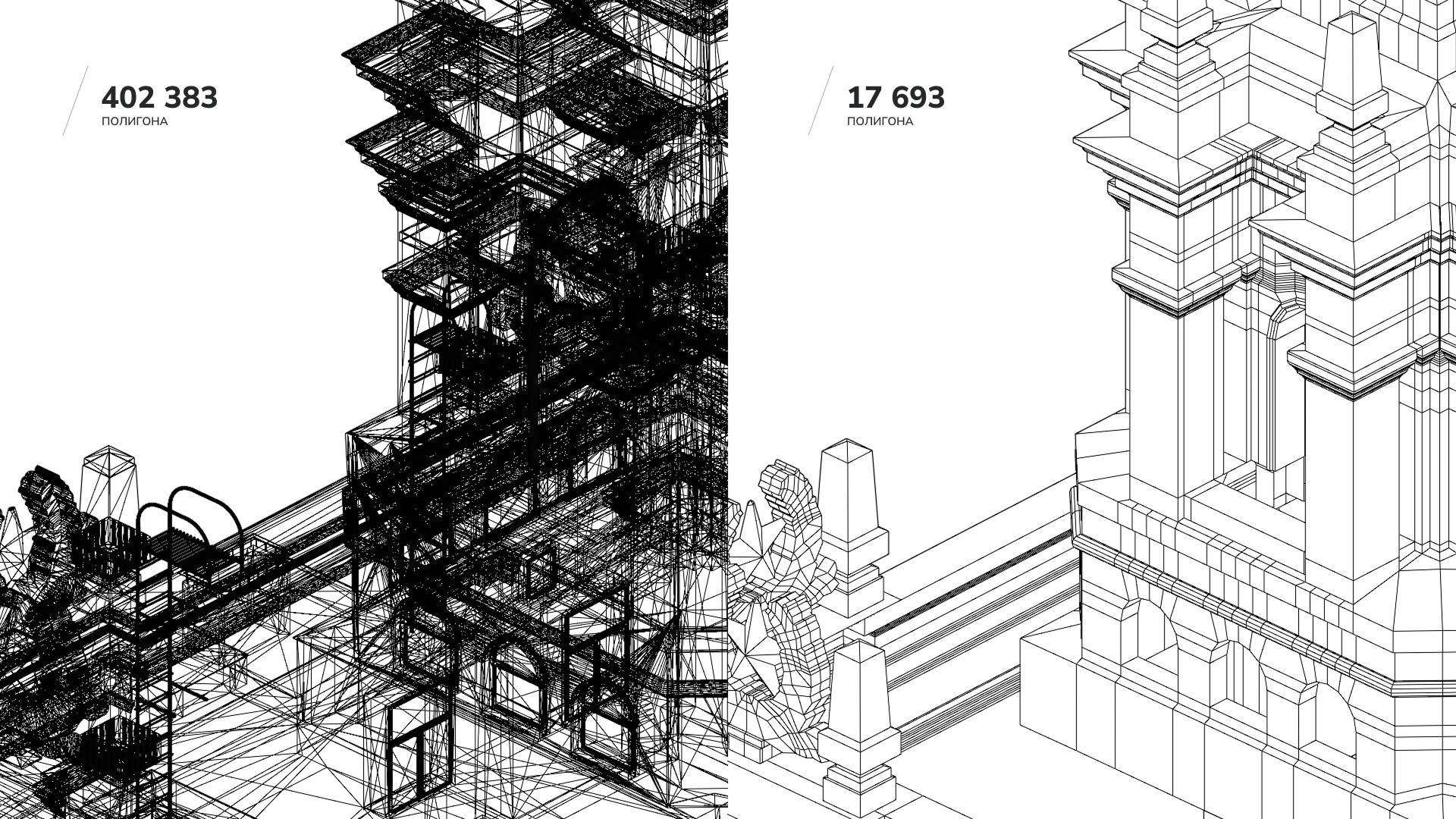 Объект на экране выглядел красиво, но монументально и статично. Я хотел добавить контрастный элемент — что-то маленькое и живое на фоне большой архитектуры, но мы не могли придумать, что именно. И тогда один из наших дизайнеров предложил птицу. Клиент потом признался, что именно она зацепила его больше всего. Из 14 моделей, которые нам прислали, мы выбрали три варианта. Среди них было здание на Тверской, значимое для заказчика, но когда я начал его уменьшать, все архитектурные детали потерялись и оно превратилось в квадрат. Остановились на башне в стиле триумф (сталинский ампир), потому что у неё простая ось симметрии и она хорошо смотрелась при вращении. Архитектурные модели делаются под инженерные задачи, где нужна точность размеров. При этом любая 3D-модель состоит из полигонов — треугольников, координаты вершин которых записываются в файл. Чем больше полигонов, тем тяжелее документ. Если включить отображение сетки, видно, насколько плотная у неё геометрия. Рендер в картинку из Blender занимал заметно больше времени, как и последующая оптимизация модели. Первой на ум приходит автоматическая оптимизация, но я хотел контролировать новую модель, чтобы в ней можно было что-то менять, если потребуется. Я начал перестраивать башню вручную. Включил в Blender привязку к существующим точкам оригинала — и по ним построил новую геометрию. Создал параллелепипед, который автоматически цепляется за ближайшую вершину оригинала, вытянул ширину и привязался к следующей точке. Я просто брал элементы такого же размера и, по сути, обводил исходник. Большая часть из них — это гербы и звёзды на фасаде, но основная геометрия здания достаточно простая. Разница хорошо видна, если сравнить сетки. Башня в оригинале была несимметричной: где-то торчала лесенка или с одной стороны объём был больше. Я сделал геометрию полностью симметричной, чтобы здание крутилось ровно. Собрал одну четверть и зеркально отразил, поэтому работы стало вчетверо меньше. Готовую модель загрузил в Spline и настроил эффект облака точек, задавая цвет, плотность и размер. Когда я оценивал сроки на создание птицы, мне казалось, что нейросеть возьмёт на себя основную работу — и модель сгенерирует, и анимирует. В оценке я заложил до 20 часов: минимум это 2 часа, если нейросеть справится сама, и максимум — 20 часов, если придётся делать руками. Оказалось, что адекватно анимировать она умеет только людей и собак. Пришлось идти по программе максимум: в сервисе Tripo получил модель из текстового запроса — и уже с ней работал дальше. Промпт: city bird with spread wings Специально я не просил голубя, вдруг у архитекторов какие-то предрассудки: голуби и чистые фасады — вещи несовместимые. Но нейросеть сама решила, что это будет именно голубь. Модель получилась узнаваемая, но с огромным наростом на носу, переломанными ногами и вся скрюченная. Ещё и на полтора миллиона полигонов, а это в три с лишним раза больше, чем у нашего здания, потому что нейросеть прорисовывала каждое пёрышко. Я проделал с ней ту же операцию, что и с башней: взял за основу модель и обвёл вручную. На картинке ниже видно: серая модель это нейросеть, а чёрные линии поверх — мои. Контуры не везде совпадают, так как часть расхождений я сделал намеренно. Клюв починил и пузо убрал, потому что во время анимации хвоста у нейросетевой версии тряслось бы всё вместе. 