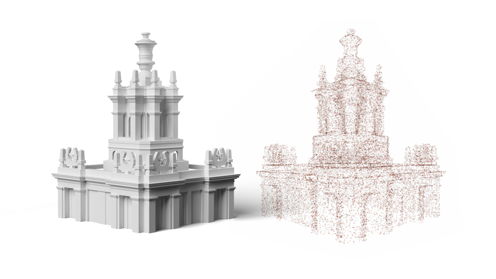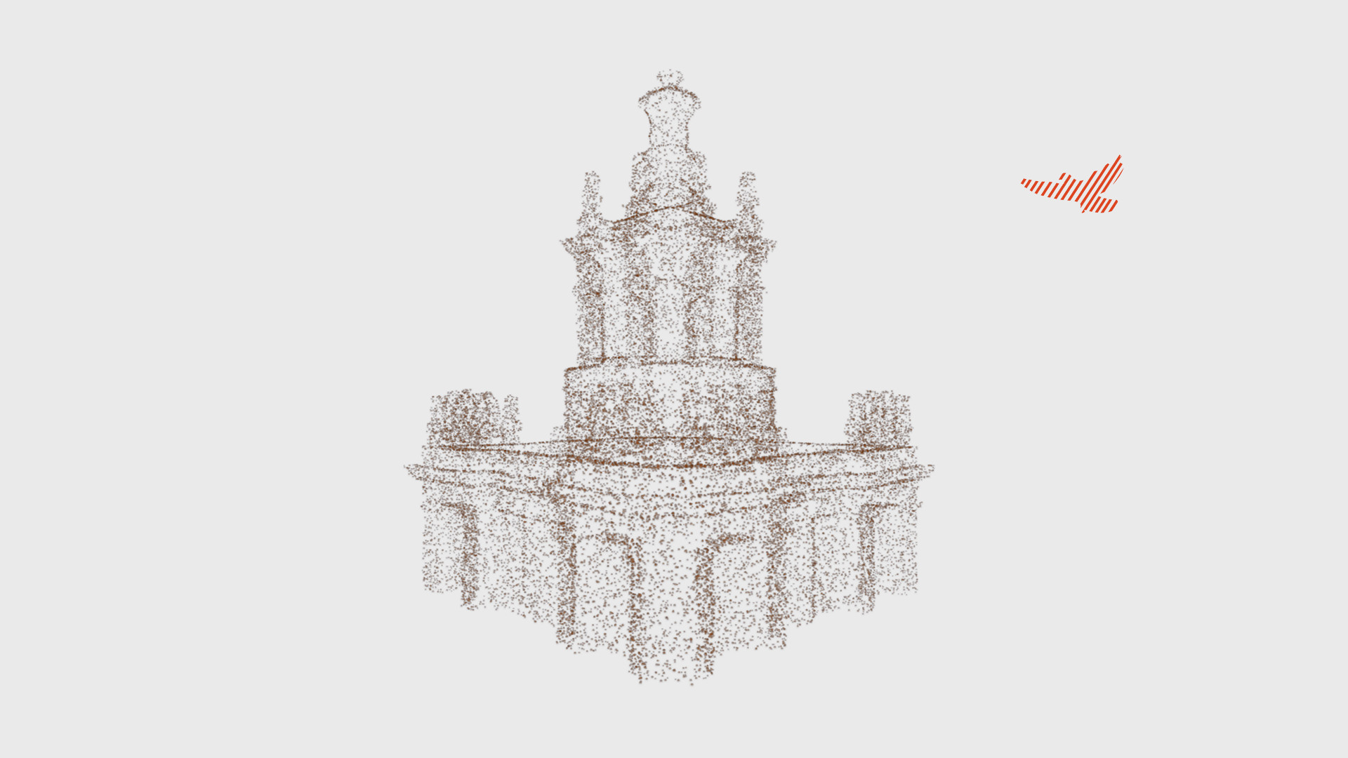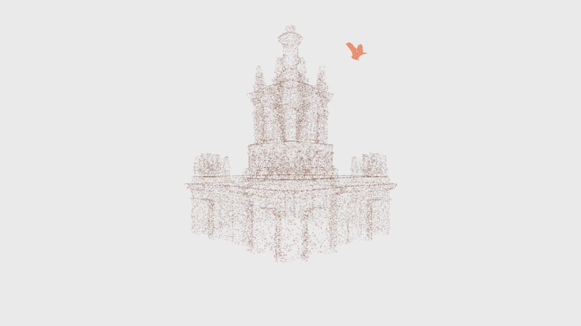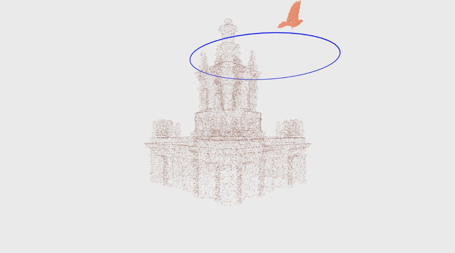 Объект на экране выглядел красиво, но монументально и статично. Я хотел добавить контрастный элемент — что-то маленькое и живое на фоне большой архитектуры, но мы не могли придумать, что именно. И тогда один из наших дизайнеров предложил птицу. Клиент потом признался, что именно она зацепила его больше всего. Из 14 моделей, которые нам прислали, мы выбрали три варианта. Среди них было здание на Тверской, значимое для заказчика, но когда я начал его уменьшать, все архитектурные детали потерялись и оно превратилось в квадрат. Остановились на башне в стиле триумф (сталинский ампир), потому что у неё простая ось симметрии и она хорошо смотрелась при вращении. Архитектурные модели делаются под инженерные задачи, где нужна точность размеров. При этом любая 3D-модель состоит из полигонов — треугольников, координаты вершин которых записываются в файл. Чем больше полигонов, тем тяжелее документ. Если включить отображение сетки, видно, насколько плотная у неё геометрия. Рендер в картинку из Blender занимал заметно больше времени, как и последующая оптимизация модели. Первой на ум приходит автоматическая оптимизация, но я хотел контролировать новую модель, чтобы в ней можно было что-то менять, если потребуется. Я начал перестраивать башню вручную. Включил в Blender привязку к существующим точкам оригинала — и по ним построил новую геометрию. Создал параллелепипед, который автоматически цепляется за ближайшую вершину оригинала, вытянул ширину и привязался к следующей точке. Я просто брал элементы такого же размера и, по сути, обводил исходник. Большая часть из них — это гербы и звёзды на фасаде, но основная геометрия здания достаточно простая. Разница хорошо видна, если сравнить сетки. Башня в оригинале была несимметричной: где-то торчала лесенка или с одной стороны объём был больше. Я сделал геометрию полностью симметричной, чтобы здание крутилось ровно. Собрал одну четверть и зеркально отразил, поэтому работы стало вчетверо меньше. Готовую модель загрузил в Spline и настроил эффект облака точек, задавая цвет, плотность и размер. Когда я оценивал сроки на создание птицы, мне казалось, что нейросеть возьмёт на себя основную работу — и модель сгенерирует, и анимирует. В оценке я заложил до 20 часов: минимум это 2 часа, если нейросеть справится сама, и максимум — 20 часов, если придётся делать руками. Оказалось, что адекватно анимировать она умеет только людей и собак. Пришлось идти по программе максимум: в сервисе Tripo получил модель из текстового запроса — и уже с ней работал дальше. Промпт: city bird with spread wings Специально я не просил голубя, вдруг у архитекторов какие-то предрассудки: голуби и чистые фасады — вещи несовместимые. Но нейросеть сама решила, что это будет именно голубь. Модель получилась узнаваемая, но с огромным наростом на носу, переломанными ногами и вся скрюченная. Ещё и на полтора миллиона полигонов, а это в три с лишним раза больше, чем у нашего здания, потому что нейросеть прорисовывала каждое пёрышко. Я проделал с ней ту же операцию, что и с башней: взял за основу модель и обвёл вручную. На картинке ниже видно: серая модель это нейросеть, а чёрные линии поверх — мои. Контуры не везде совпадают, так как часть расхождений я сделал намеренно. Клюв починил и пузо убрал, потому что во время анимации хвоста у нейросетевой версии тряслось бы всё вместе. 