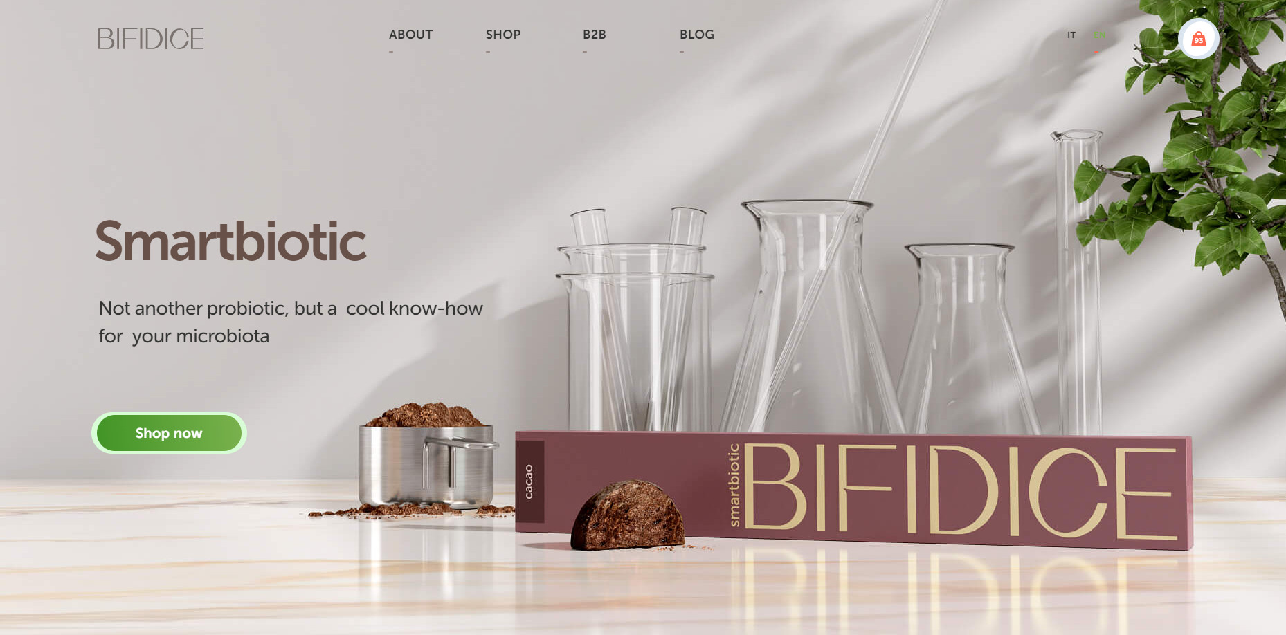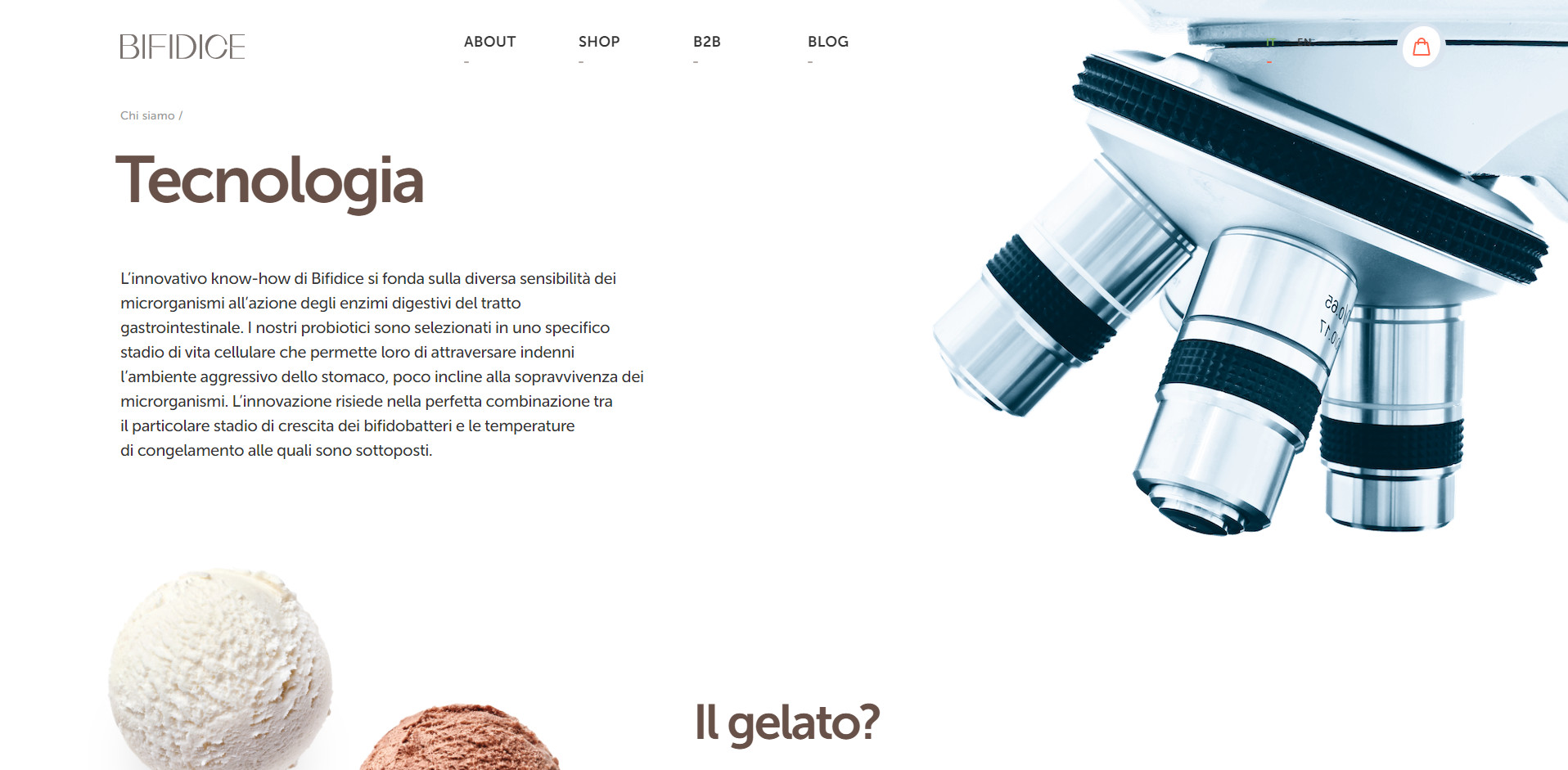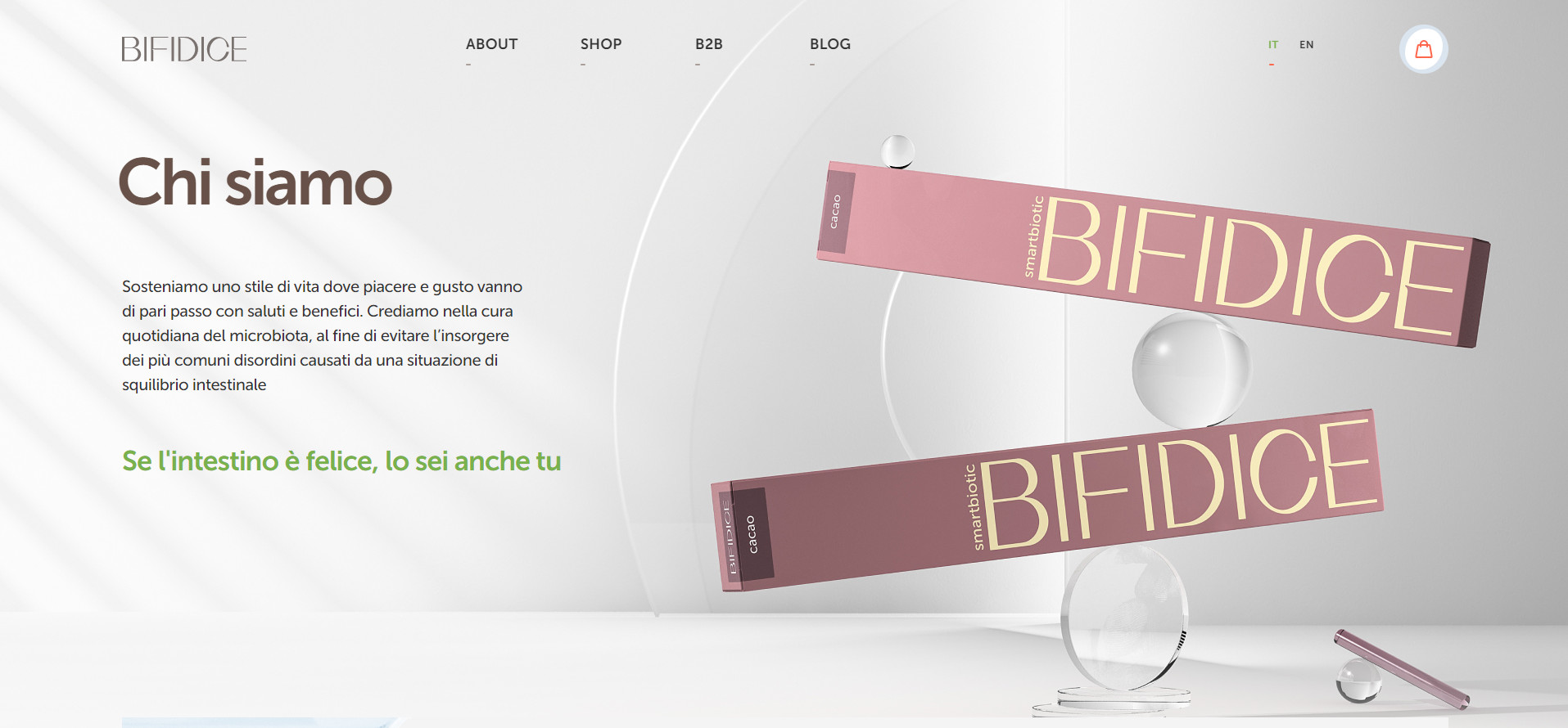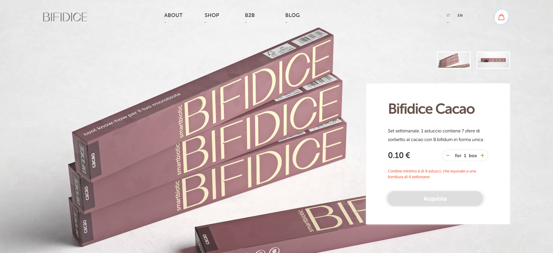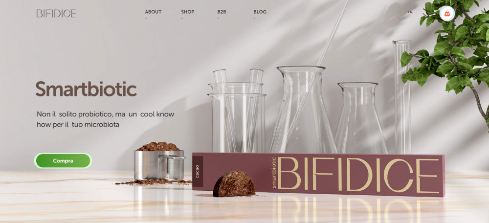 Для подробного описания технологии производства и бактерий, содержащихся в продукте, мы создали отдельные страницы. Так как Bifidice является монопродуктом, мы создали минималистичный раздел для заказа товара. На странице находится описание продукта и форма для наполнения корзины покупателя. Переходя в корзину, покупатель заполняет данные и производит оплату одним из предложенных способов: через PayPal или с помощью кредитной карты. Преимущество разработанного интерфейса заключается в его простоте и наглядности — пользователя не отвлекает лишняя информация или яркие визуальные элементы. Также мы обеспечили быстрый путь к заказу: перейти к оформлению можно через кнопку на первом экране главной страницы и через раздел в основной навигации сайта. C компаниями Bifidice сотрудничает на особых условиях, поэтому для этого типа заказчиков мы сделали отдельный раздел «B2B», где менеджер может оставить заявку в специальной форме. Bifidice находится в нише функциональных продуктов, где потребителю нужно объяснять полезность товара и обучать уходу за здоровьем. Для образования покупателей мы внедрили на сайте блог, где заказчик размещает просветительский и продающий контент. Основная языковая версия сайта разработана на итальянском языке, так как Италия — главная локация продаж Bifidice. Для клиентов из других стран добавлена англоязычная версия сайта.
