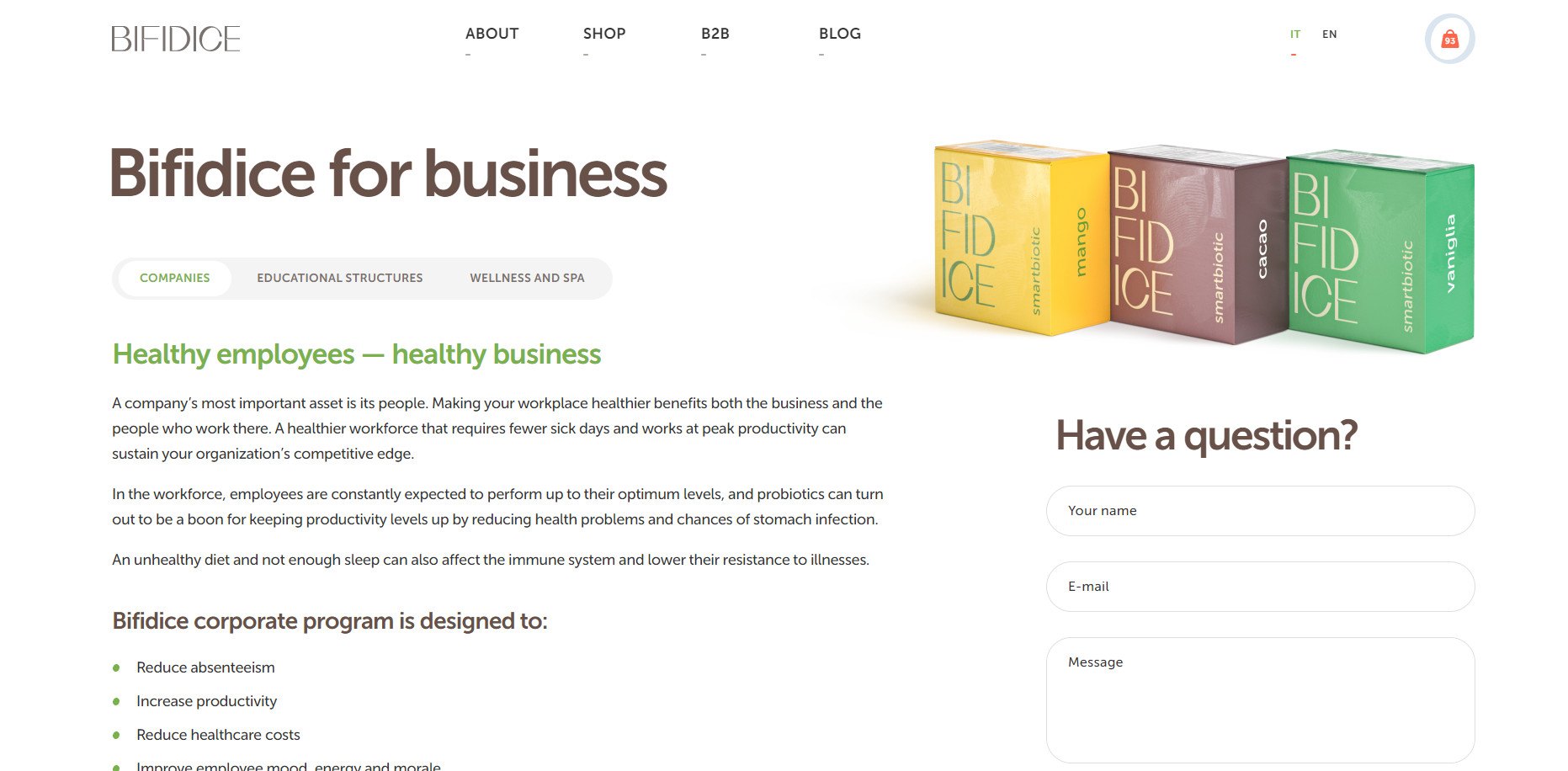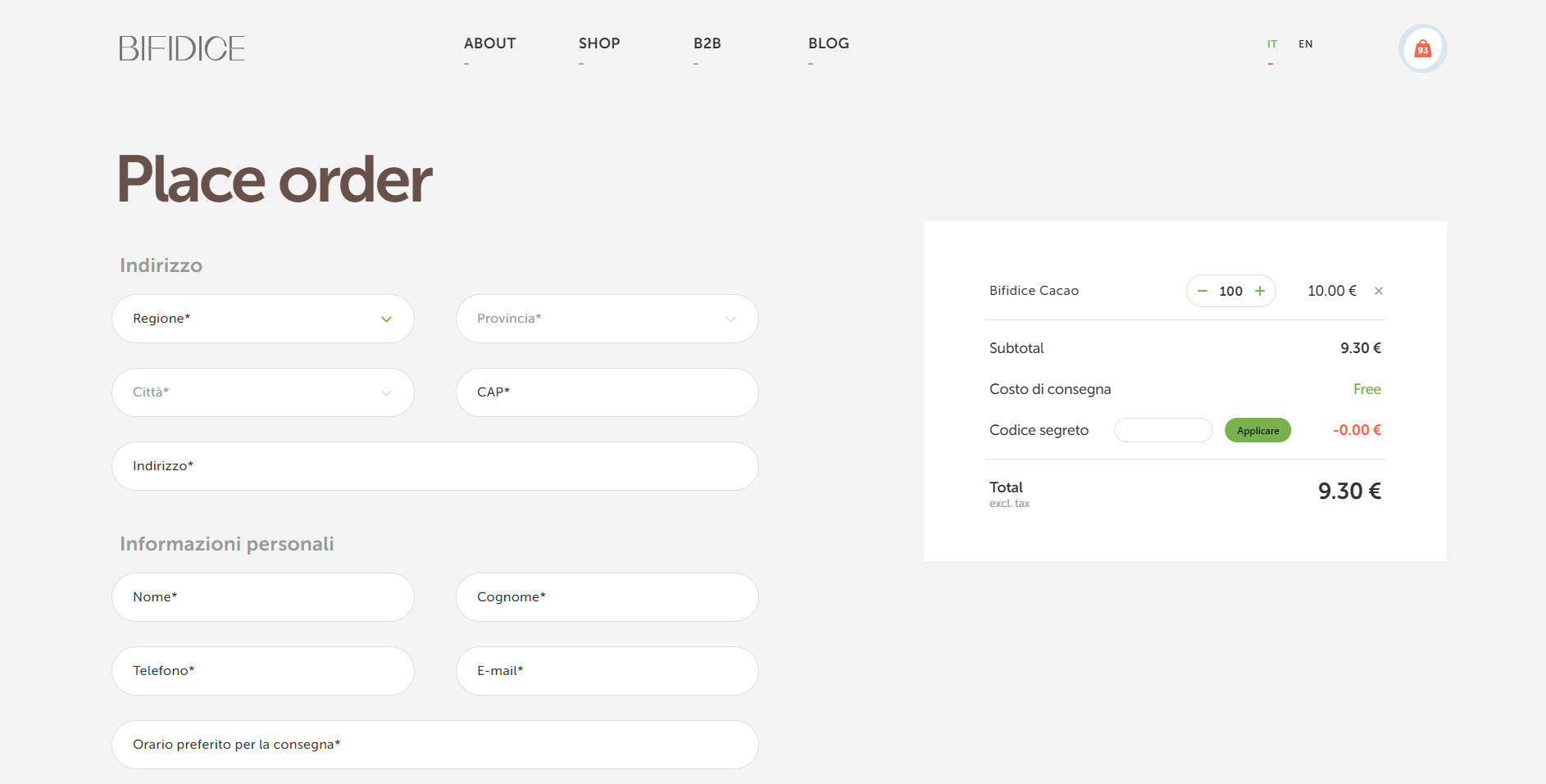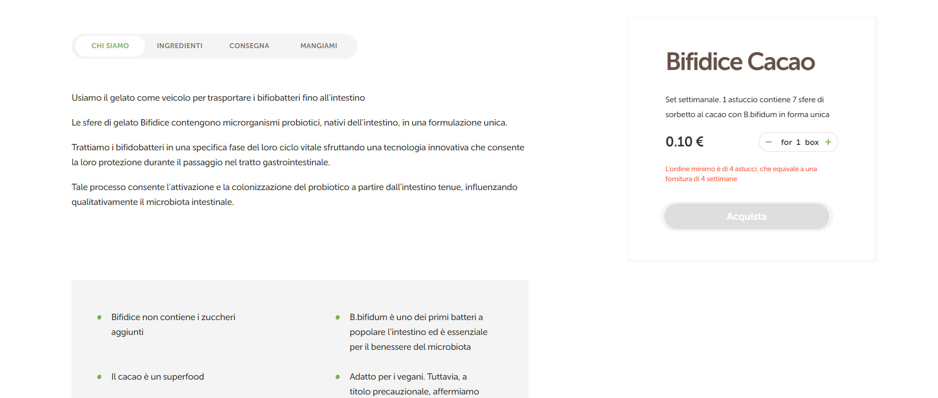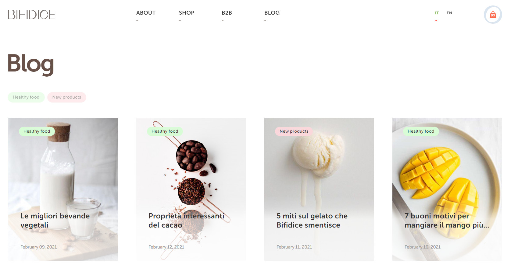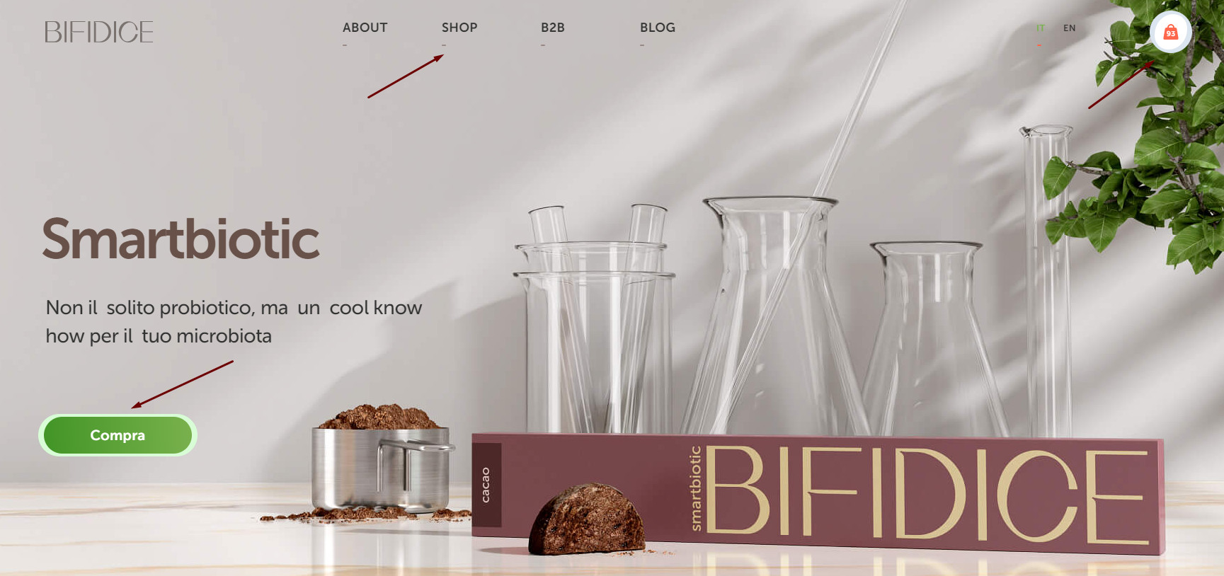 Для подробного описания технологии производства и бактерий, содержащихся в продукте, мы создали отдельные страницы. Так как Bifidice является монопродуктом, мы создали минималистичный раздел для заказа товара. На странице находится описание продукта и форма для наполнения корзины покупателя. Переходя в корзину, покупатель заполняет данные и производит оплату одним из предложенных способов: через PayPal или с помощью кредитной карты. Преимущество разработанного интерфейса заключается в его простоте и наглядности — пользователя не отвлекает лишняя информация или яркие визуальные элементы. Также мы обеспечили быстрый путь к заказу: перейти к оформлению можно через кнопку на первом экране главной страницы и через раздел в основной навигации сайта. C компаниями Bifidice сотрудничает на особых условиях, поэтому для этого типа заказчиков мы сделали отдельный раздел «B2B», где менеджер может оставить заявку в специальной форме. Bifidice находится в нише функциональных продуктов, где потребителю нужно объяснять полезность товара и обучать уходу за здоровьем. Для образования покупателей мы внедрили на сайте блог, где заказчик размещает просветительский и продающий контент. Основная языковая версия сайта разработана на итальянском языке, так как Италия — главная локация продаж Bifidice. Для клиентов из других стран добавлена англоязычная версия сайта.