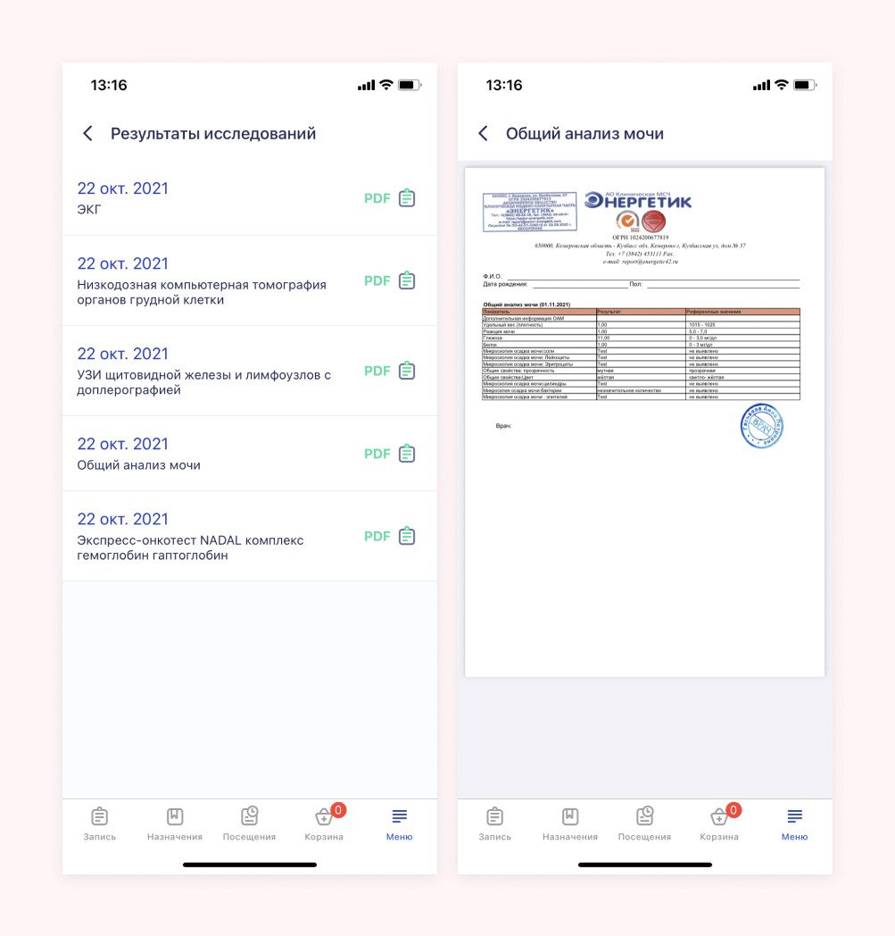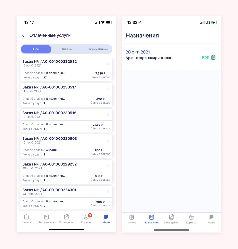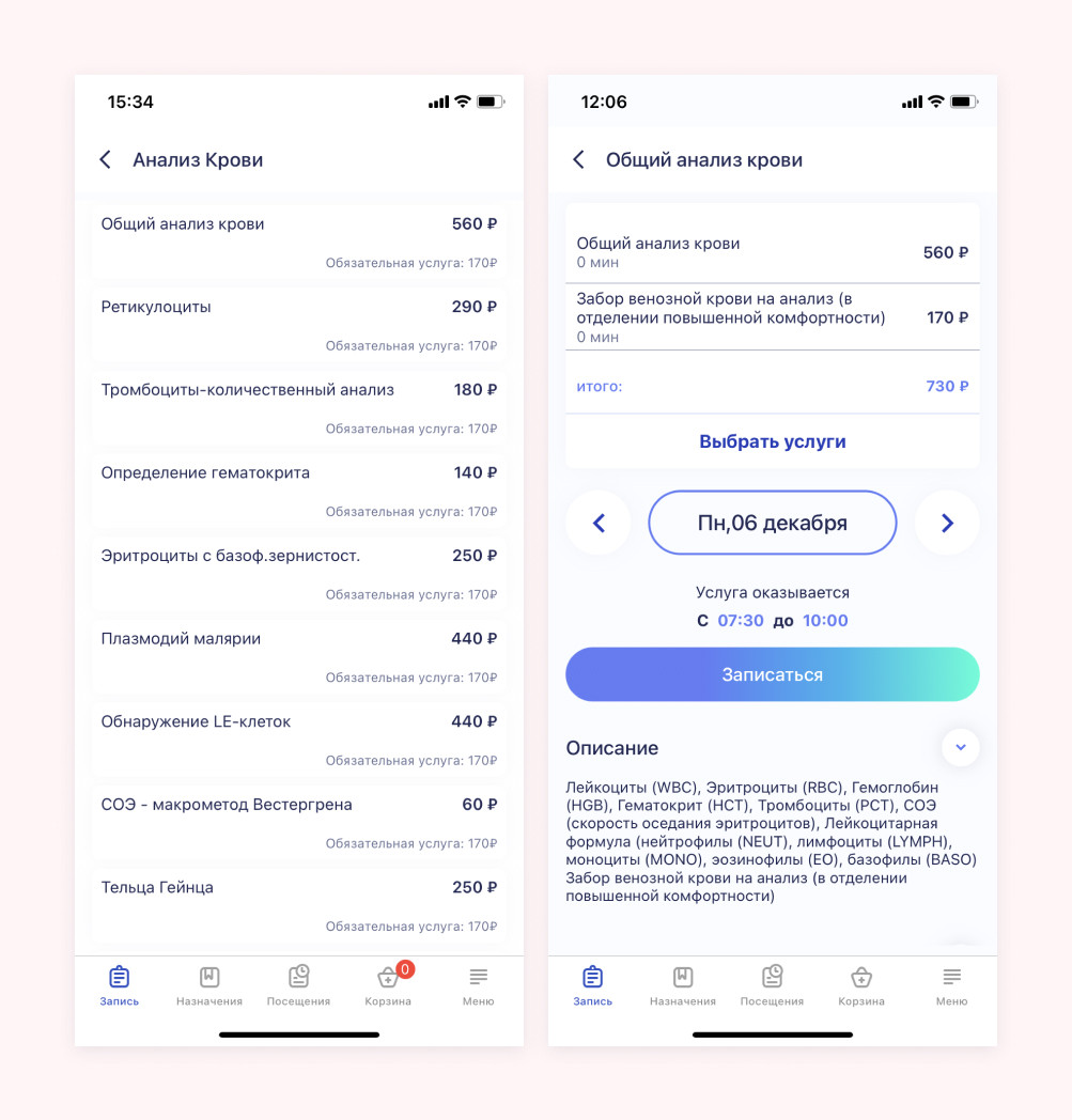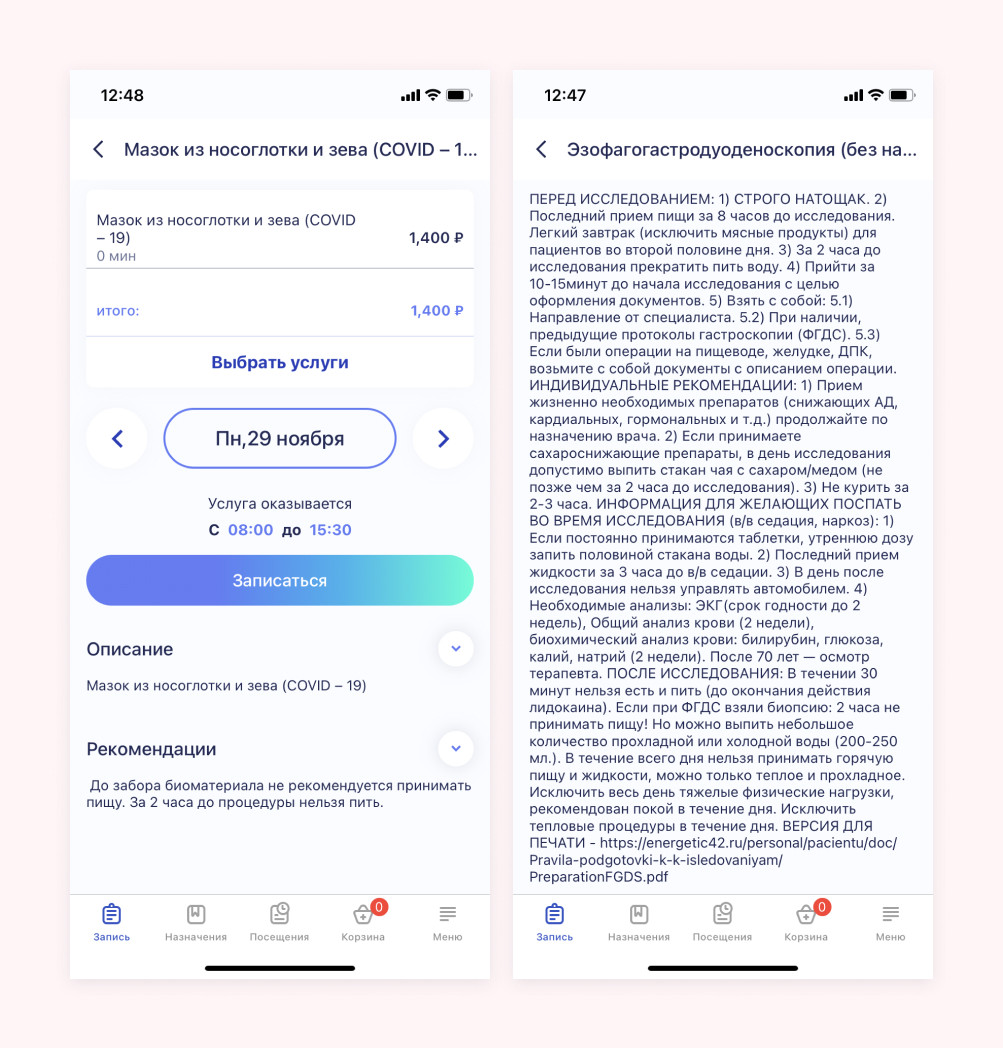 Цифровизироваться решил и наш заказчик — клиническая медико-санитарная часть «Энергетик». Это ведущее медучреждение в Кемеровской области с широким спектром услуг: здесь берут анализы и проводят диагностические исследования, принимают врачи от терапевта до стоматолога и невролога, проводят физиолечение и хирургические операции. Учреждение работает по трем направлениям: В «Энергетике» обслуживание устроено, как в большинстве других клиник: запись через регистратуру по телефону или лично, оплата через кассу, талончики. Управляющие решили улучшить сервис с помощью IT-решений и обратились к нам, чтобы разработать личный кабинет пациента в приложении (для iOS и Android) и веб-версии. У проекта несколько целей: В предварительном техническом задании заказчика была описана логика работы некоторых функций и разделы будущего сайта. Изначально планировалось сделать приложение с онлайн-записью, медицинскими данными пациента, каталогом платных услуг и историей оплат в клинике. Однако после презентации первых прототипов было решено расширить функции личного кабинета и превратить его в полноценный интернет-магазин медицинских услуг, где можно добавлять «товары» в корзину и оплачивать их онлайн. Мы изменили первоначальную архитектуру и разработали личный кабинет с дополнительной логикой бронирования услуг и корзиной. На главном экране приложения выводится запись на платные услуги и прием. Мы сделали две вкладки: «Услуги» и «Врачи». Это основные пользовательские пути: чаще всего пациенты ищут информацию об услуге или запись к конкретному врачу. Сверху размещены баннеры с наиболее частыми запросами пациентов для быстрого перехода к записи: первичный прием терапевта, хирурга, отоларинголога и т.д. Также есть поиск, где можно найти услуги и врачей по запросу. Представим, что пациенту нужно попасть на прием к хирургу. Для этого нужно перейти в раздел услуг с записью к врачам, где приложение предложит выбрать нужную специальность и тип приема. Далее пациент выбирает доктора и время записи. Здесь же видна информация о стоимости приема и квалификации врача. График специалистов и вся остальная информация подтягиваются из базы 1С клиники. После подтверждения времени приема услуга бронируется на 15 минут. За это время можно добавить в корзину другие услуги или сразу закончить оформление приема. Чтобы закрепить за собой запись, нужно перейти в корзину выбрать способ оплаты: онлайн или в поликлинике — приложение не обязывает оплачивать услугу заранее. Если пациент выбирает онлайн-оплату, то услуга оплачивается в приложении с помощью карты, Apple Pay, Google Pay. На этом все — прием оформлен и подтвержден, врач ждет пациента к назначенному времени. Информация о приеме попадает в раздел «Посещения», где пациент видит все свои записи: предстоящие и завершенные. После подтверждения информация в 1С обновляется, и другой человек не сможет повторно записаться на то же самое время. Если в течение 15 минут запись не подтверждена, то бронь слетает и слот снова становится доступным для других пациентов. Все то же самое можно сделать через вкладку «Врачи», найдя в списке нужного специалиста сразу. Кроме приема врача, через личный кабинет можно записаться на любые другие медицинские услуги: сдать кровь или мазок, сделать флюорографию или УЗИ, пройти стационарное 