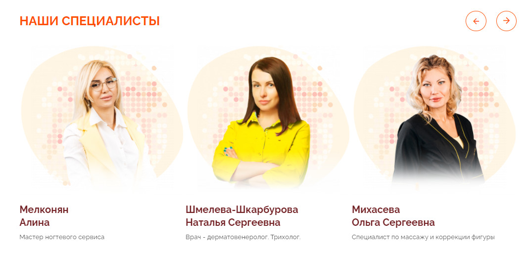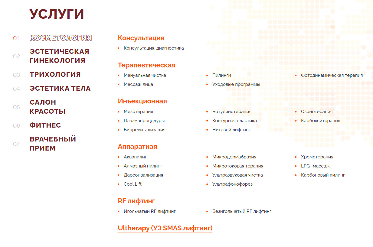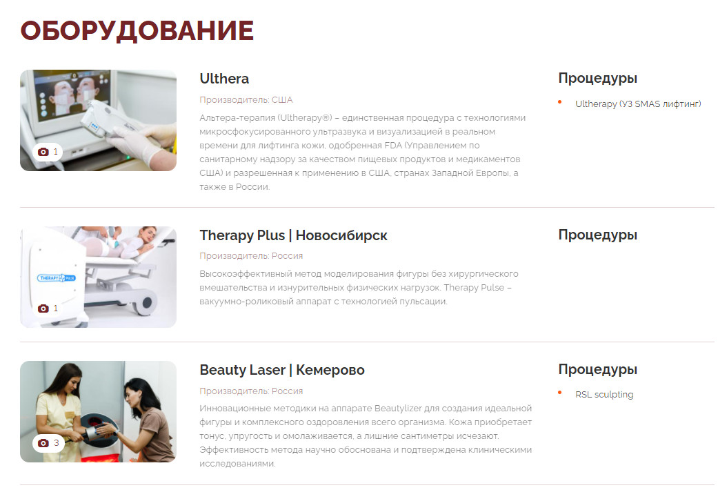 Отличие от конкурентов — современные аппараты и обеспечение полного цикла по уходу за здоровьем и красотой. Сайт для такого крупного центра — обязательный атрибут, который формирует имидж компании и помогает привлекать клиентов.