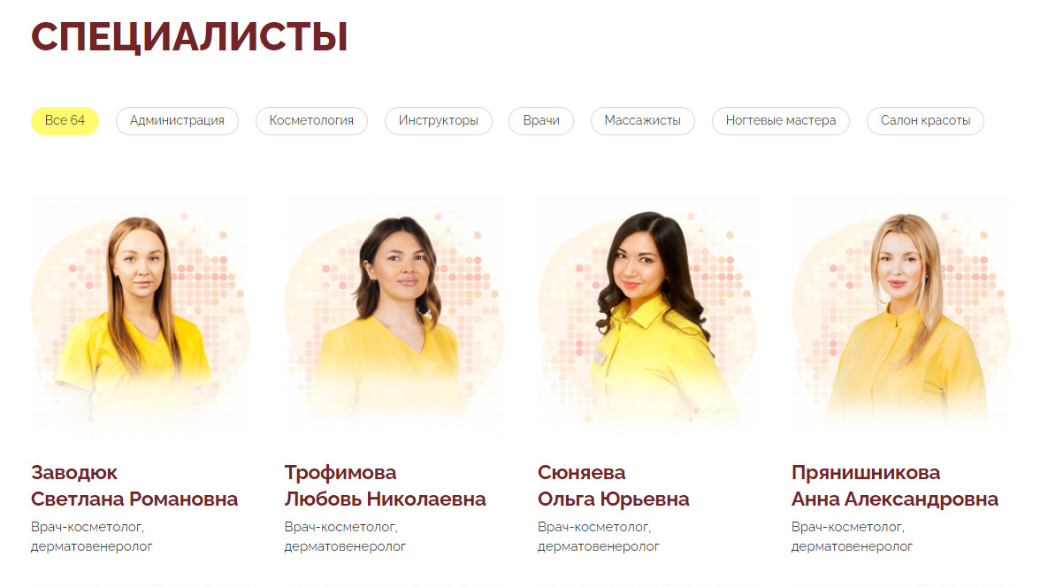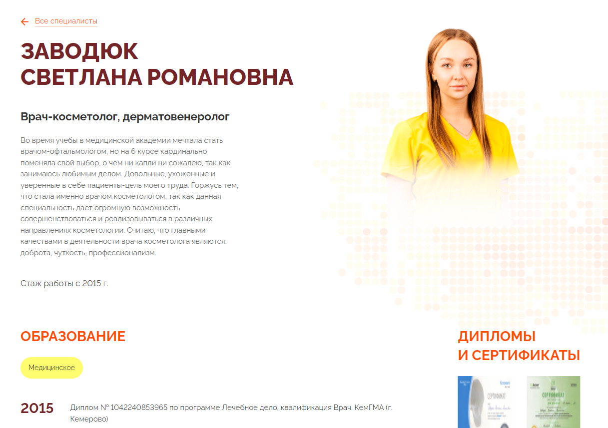 На старом сайте заказчика мы выявили следующие проблемы: Сайт нуждался в модернизации, так как не он соответствовал имиджу топового косметологического центра и не решал задачи пользователей. Предстояло разработать сайт, который дает пользователям исчерпывающую информацию обо всех услугах центра в удобном структурированном формате и стимулирует записаться на услуги. Для этого необходимо: Ранее главная страница сайта начиналась с неинформативного рассказа о компании. Вместо этого мы разместили анимацию, которая презентует логотип бренда и через образ девушки олицетворяет красоту и здоровье. По запросу заказчика мы избежали в прямых ассоциаций с медициной в визуальной части оформления сайта. Изображение складывается из множества мелких точек, которые напоминают структуру кожи, состоящей из множества клеток. Флагманское направление центра — косметология, к чему и отсылает задумка наших дизайнеров. Ассоциации с названием бренда определили цветовую палитру — за основу взяли теплые оттенки оранжевого, бордового и желтого. Эти цвета использованы для разных элементов дизайна: текста, кнопок, фоновых изображений. Преемственность идеи с точками прослеживается по всему сайту. Мы использовали этот прием в деталях: на фонах, в иконках и оформлении кнопок, при подсвечивании курсора в разделах навигации. Вместо неинформативного раздела «О нас» мы сразу предлагаем пользователю ознакомиться с услугами центра и вовлекаем его в изучение сайта, убирая лишний шаг перед целевым действием. Чтобы пользователь нашел нужную информацию, все разделы, которые могут заинтересовать клиентов, мы расположили в навигации — она находится в верхней части страницы и помогает быстро сориентироваться на сайте. Структурировали каждый раздел так, чтобы пользователь не потерялся в интерфейсе и быстро нашел нужного специалиста или услугу. Это особенно это актуально для центров с широким спектром услуг — наименований так много, что в них легко запутаться. Мы реализовали подробную навигацию по дереву услуг в соответствующем разделе. В разделе «Специалисты» для удобного поиска мы добавили фильтры по направлениям работы сотрудников. Обязательная страница для сайта в бьюти-индустрии. Отсутствие удобного прайса будет раздражать пользователя и вызовет сомнения в прозрачности ценообразования. Частая ошибка здесь — размещать таблицу или текст со всеми услугами подряд. Лучше использовать разбивку по видам и группам процедур с разворачивающимися списками. В «Золотой линии» очень много услуг, поэтому в прайсе мы сделали навигацию по общим направлениям и декомпозировали их на подгруппы. Чтобы узнать цены, пользователю достаточно найти нужный вид процедур и развернуть список. Для каждой услуги мы разработали отдельные страницы. Это закрывает две задачи: На страницах содержится следующая информация: Чтобы пользователь легко считывал информацию, мы визуально выделили ключевые моменты по услуге отдельно от основного текста — справа находится блок со стоимостью, продолжительностью, длительностью восстановления, рекомендуемым курсом и специалистами, которые выполняют процедуру. По поисковым запросам можно сделать вывод, что пользователи интересуются в том числе оборудованием косметологических центров. На сайте «Золотой линии» мы вынесли эту ин