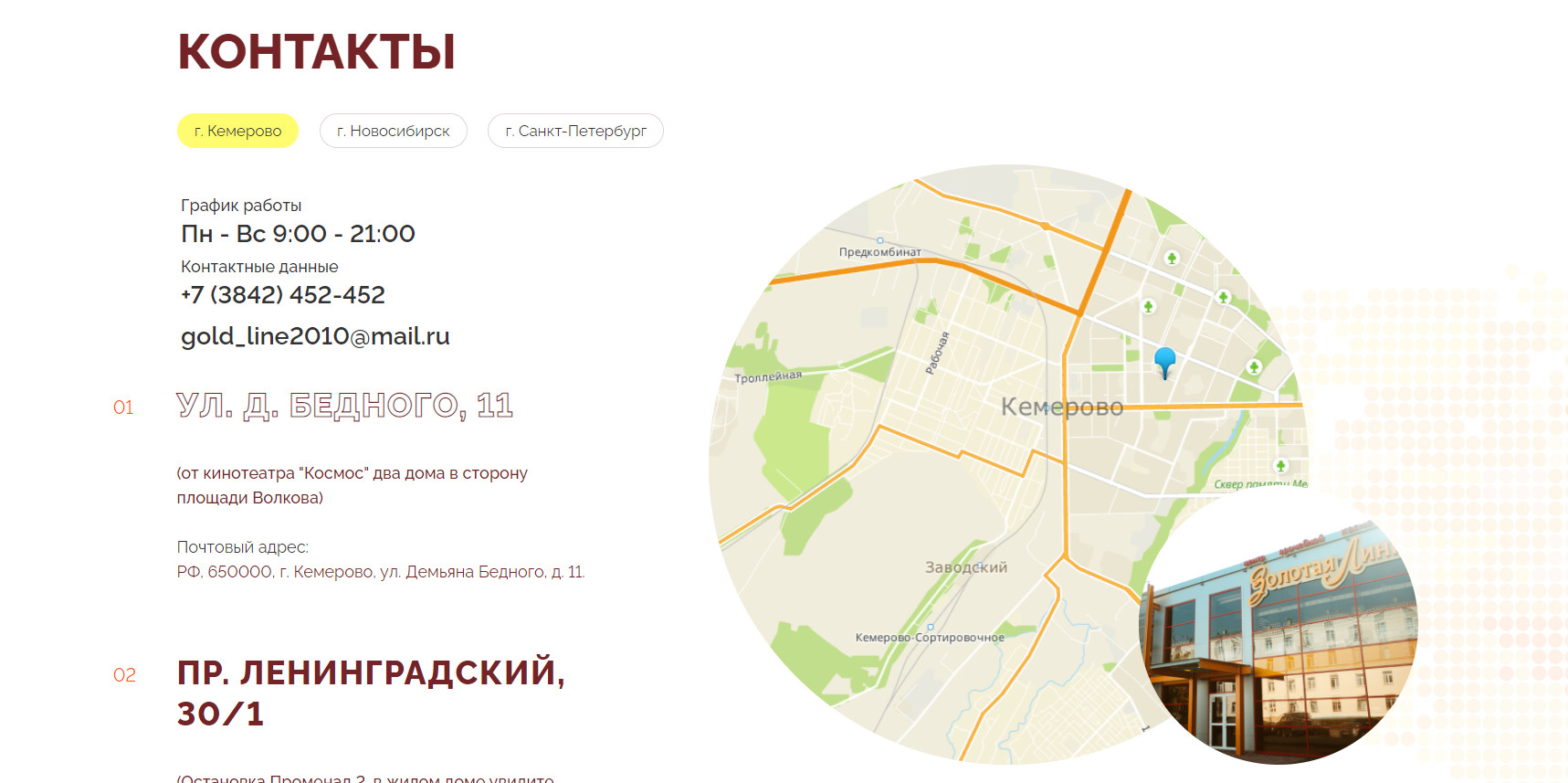 «Золотая линия» — это косметологический центр с филиалами в Санкт-Петербурге, Новосибирске и Кемерове. В них представлено огромное количество услуг по разным направлениям: косметология, салон красоты, фитнес-центр, эстетика тела, врачебный прием.