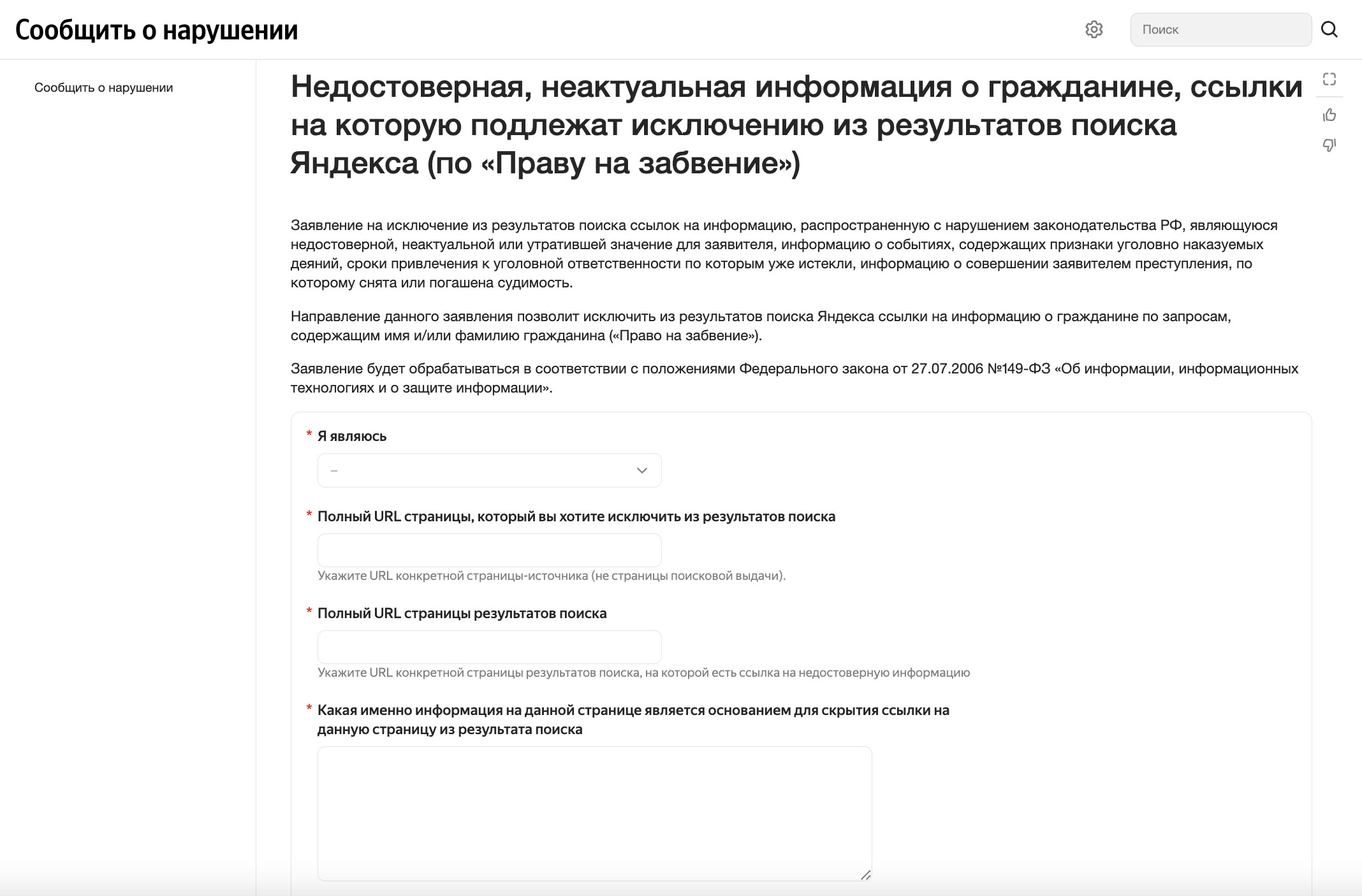 Процедура подачи заявки на деиндексацию ссылки из поиска