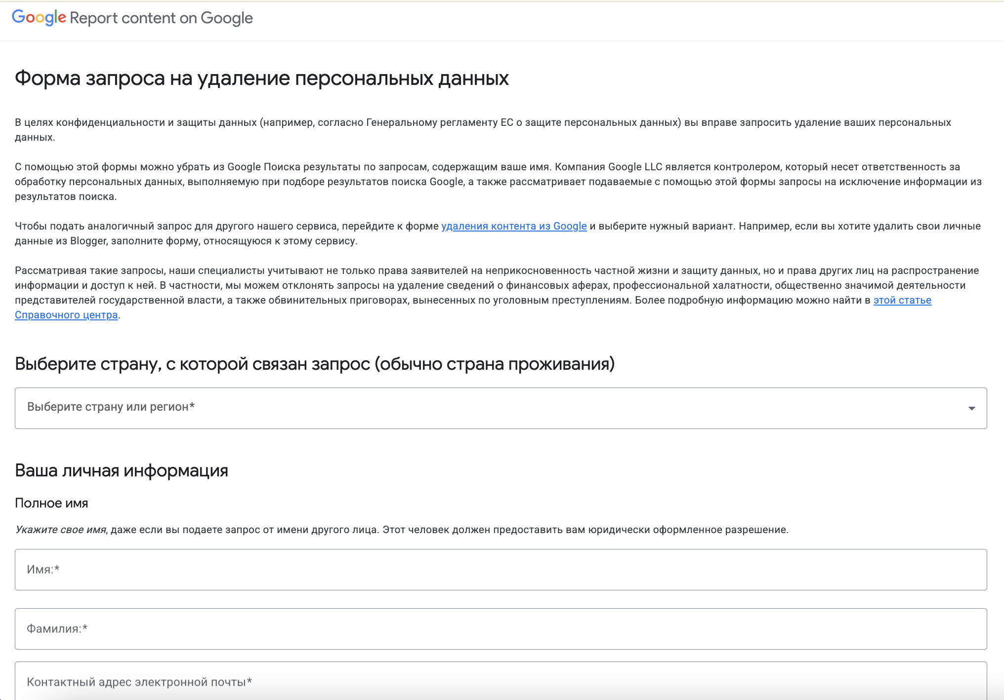 Процедура деиндексации по праву на забвение как в Яндексе, так и в Google включает подачу официального обращения. В этом обращении необходимо: