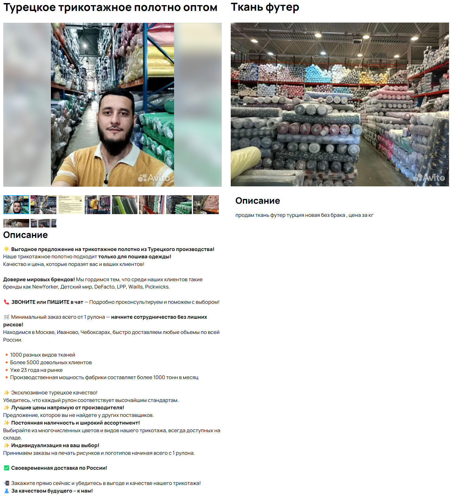- Объявления как общего типа, так и с конкретными артикулами тканей