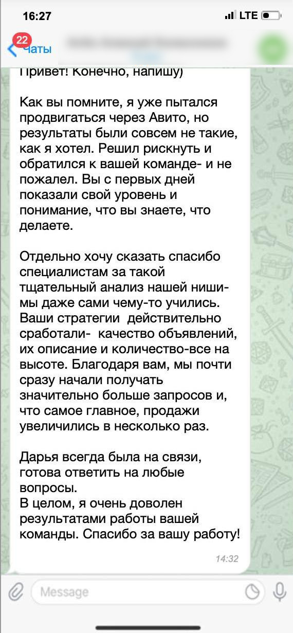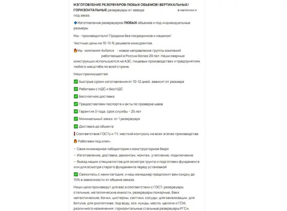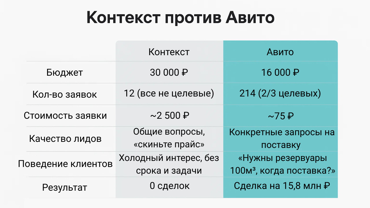 🔸 Проанализировали нишу и конкурентов в выдаче Авито 🔸 Выделили ключевые сегменты спроса: типы резервуаров, объёмы, регионы 🔸 Создали пул объявлений под каждый сегмент — лаконичные, с фокусом на задачу клиента 🔸 Разместили ~12 000 объявлений, затем сузили пул до 3 000 самых эффективных 🔸 Подключили платные поднятия, рекомендации, РСЯ 🔸 Настроили автоответы и помогли клиенту с реакцией на входящие Цель — не просто попасть в выдачу, а отработать входящий запрос в первые 5–10 секунд. Это решают текст, фото и моментальный ответ. Уже в первую неделю пошли точные и тёплые запросы: Никакой «воды» — люди знали, что им нужно. Не «расскажите о компании», а «у нас задача». Главное — не только количество, а качество и готовность к сделке. Авито — это не просто доска. При системной работе и нормальной упаковке оно может стать полноценным каналом заявок даже в B2B. Если продукт сложный, а спрос нестабильный — важно попасть в точку. Мы это сделали — с первой попытки.