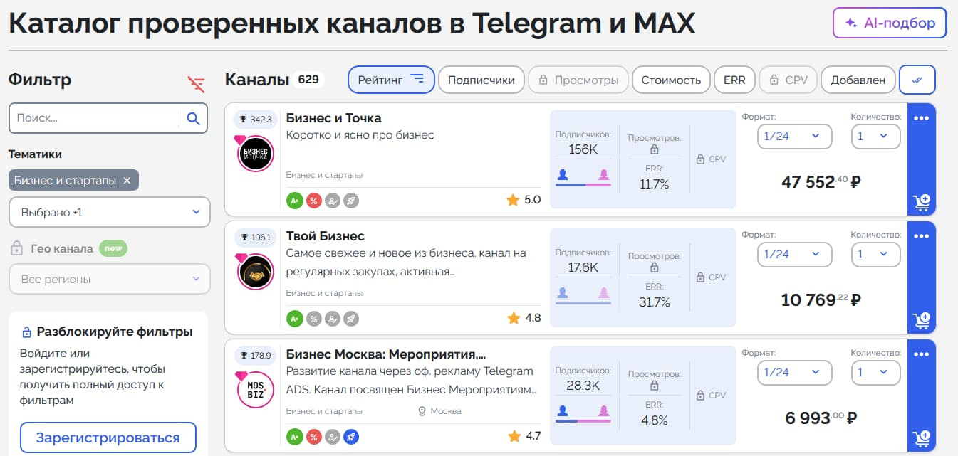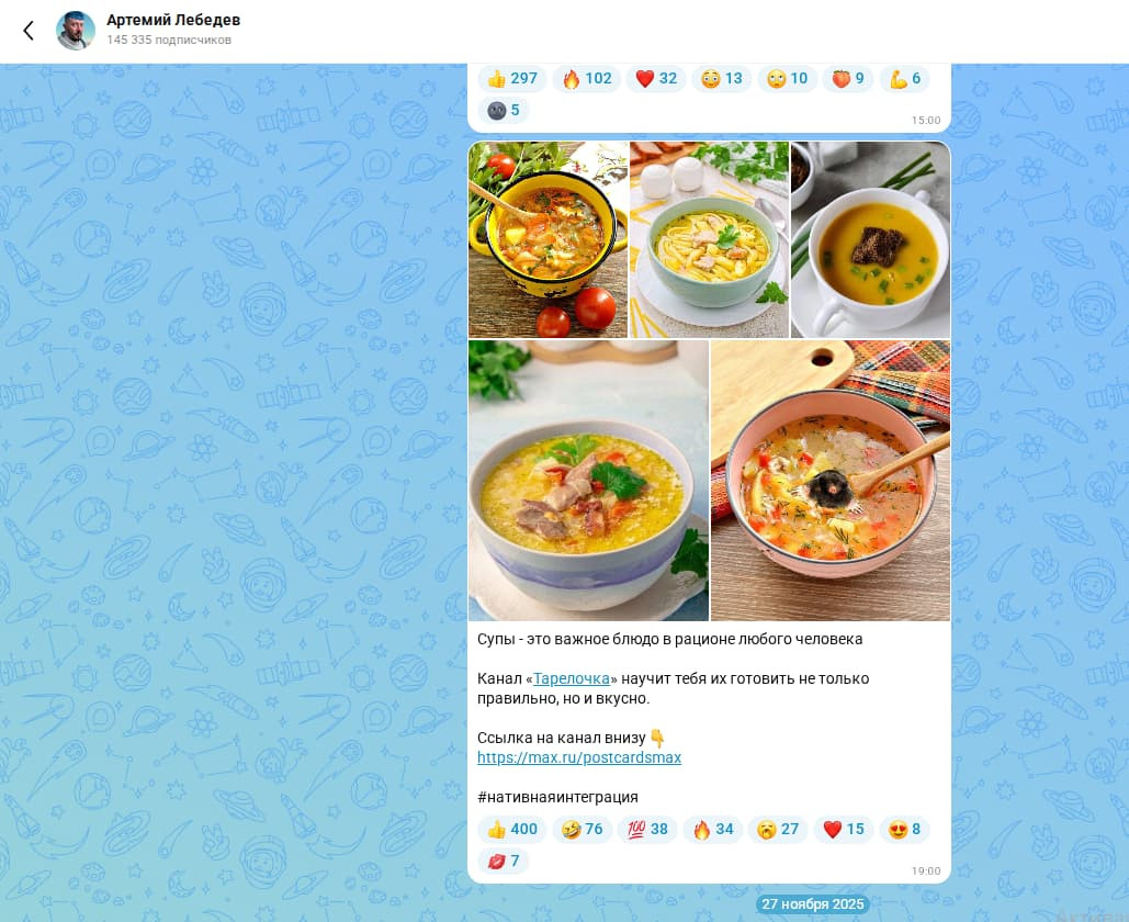 В нем есть косвенные инструменты продвижения бизнеса: создание мини-приложений, ведение официальных каналов, подключение чат-ботов. При этом можно размещать рекламу через прямые договоренности с владельцами каналов. Осенью 2025 года каналы Max начали появляться во внешних рекламных системах. В ноябре о подключении каналов мессенджера сообщил сервис Telega.in. Это позволило автоматизировать размещение рекламы: выбирать каналы с помощью AI-инструментов и фильтров, не переписываться с администраторами, получать аналитику и снижать риски при оплате. Пользователи click.ru могут подключить аккаунт в Telega.in к единому кабинету, чтобы управлять кампаниями на разных площадках, не переключаясь между вкладками, и получать партнерское вознаграждение в процентах от бюджетов, потраченных на рекламу. Пополнять аккаунт Telega-in можно заработанными бонусами. Инструкцию по подключению аккаунта к экосистеме click.ru можно посмотреть по ссылке. Поскольку в Max пока нет специальных мест и форматов для рекламных размещений, основной способ продвижения каналов, брендов и продуктов — нативная реклама. Рекламодатель подбирает подходящие каналы вручную или через сервисы вроде Telega.in и заказывает публикацию поста со ссылками на свой сайт или канал. У нативной рекламы есть множество преимуществ: Благодаря этому у нативных интеграций в Max хороший охват. Реклама не вызывает раздражения, а, наоборот, усиливает доверие к бренду или продукту. Главное ограничение на текущий момент — небольшое количество каналов с широкой и активной аудиторией. Около 60 тысяч из 81 тысячи каналов принадлежат государственным ведомствам и не подходят для рекламных размещений. В коммерческих и авторских каналах активность аудитории пока ниже: многие пользователи зарегистрировались в Max, но еще не сделали его основным мессенджером для общения и потребления контента. Но не стоит расстраиваться. Массовая регистрация каналов началась лишь осенью 2025 года, поэтому многие компании, блогеры и пользователи пока осваиваются на платформе. По мере роста вовлеченности аудитории рекламная активность в Max будет постепенно увеличиваться. Как мы упоминали выше, сейчас есть два способа запустить рекламу в Max. Первый — договориться о нативном размещении напрямую с владельцами каналов с подходящей аудиторией. Искать такие каналы можно через поиск внутри Max или с помощью каталогов, например mxstat.ru или telega.in/catalog. Важно учитывать, что пока что каналы в Max могут создавать блогеры с аудиторией от 10 000 человек в Одноклассниках, ВКонтакте, Telegram или Дзене. Поэтому, если в самом Max контактных данных нет, можно перейти в сообщество этого автора на другой платформе и связаться с ним там. Второй способ — размещение через Telega.in. Здесь доступны как полностью автоматизированные кампании под ключ, так и точечные размещения в выбранных каналах из каталога с более чем 40 тематиками. Рекламодатель может писать тексты самостоятельно или использовать AI-помощника. Сервис информирует о каждом размещении и создает отчеты по итогам публикации. Автоматизация заметно экономит время. В отличие от размещения напрямую, не нужно: Чтобы реклама в Max дала результат, важно внимательно подойти к выбору площадки. Канал должен: Пока каналы в Max только развиваются, многие просто размещают в них контент из сообщества в Telegram или группы ВК. Поэтому 