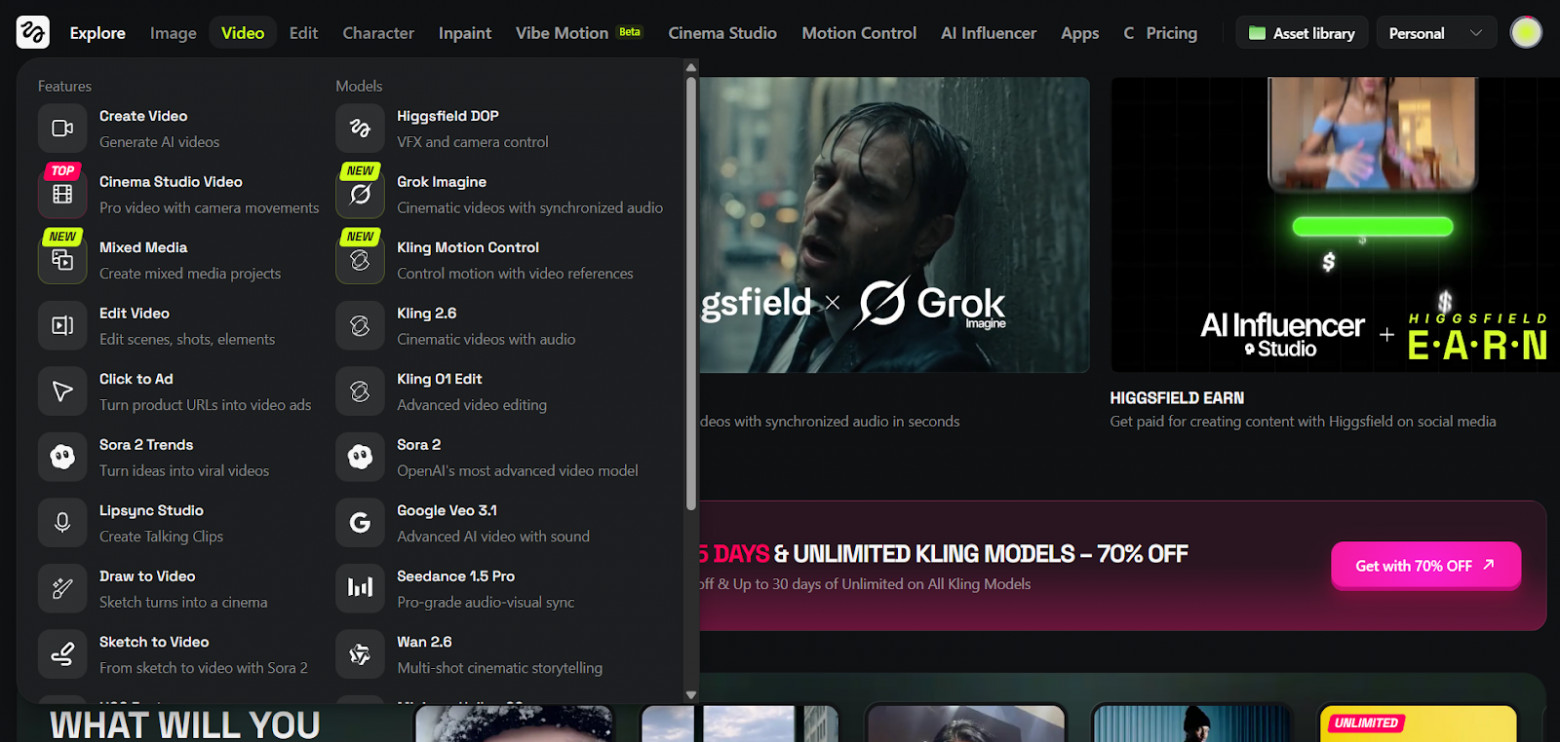 - генерация на моделях Sora 2, Minimax 2.3, Google Veo 3.1 и собственных моделях Higgsfield;