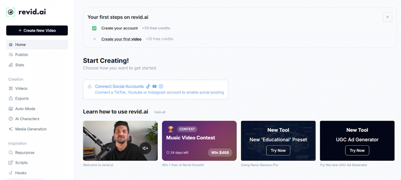Revid AI — инструмент для генерации и монтажа под ключ. Особенно удобен для создания контента для социальных сетей.