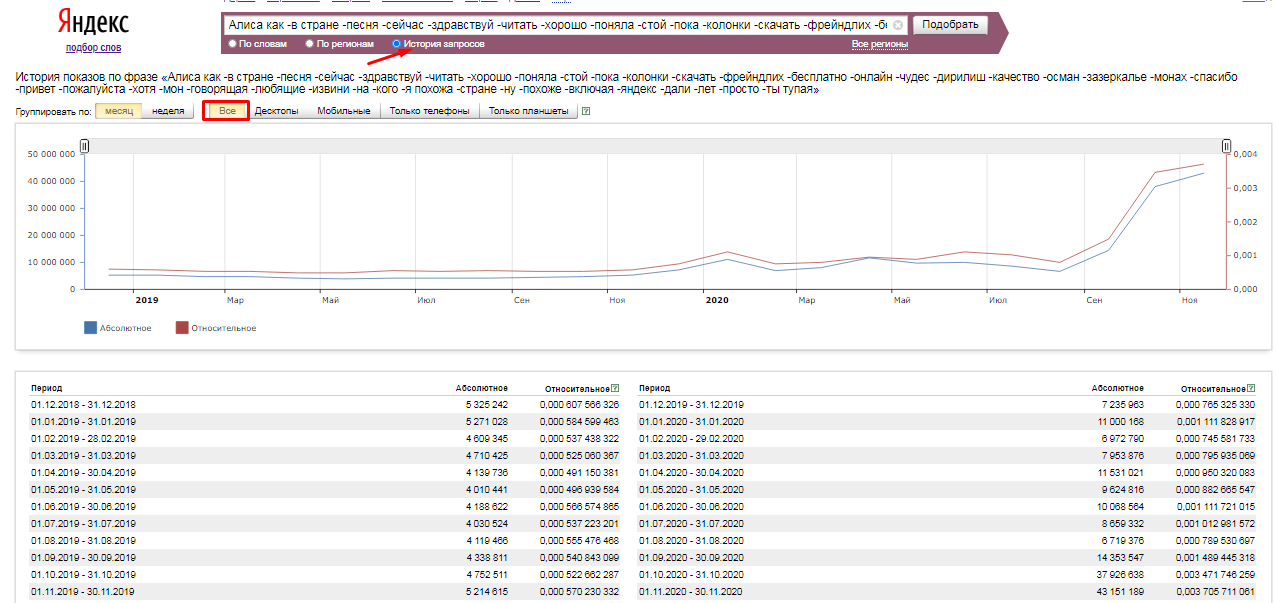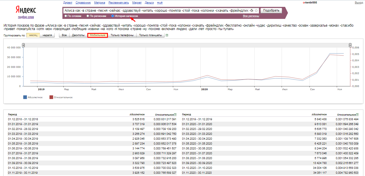 Анализ истории запросов показывает, что количество запросов со словом «Алиса» с октября по ноябрь 2020 года по всем устройствам (мобайл и десктоп) выросло с 14 млн до 37 млн запросов (на 23 млн).
