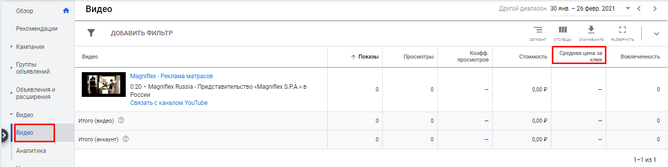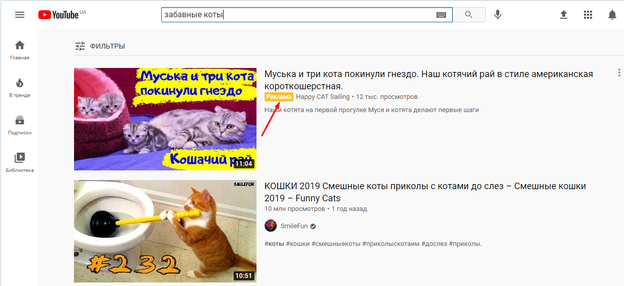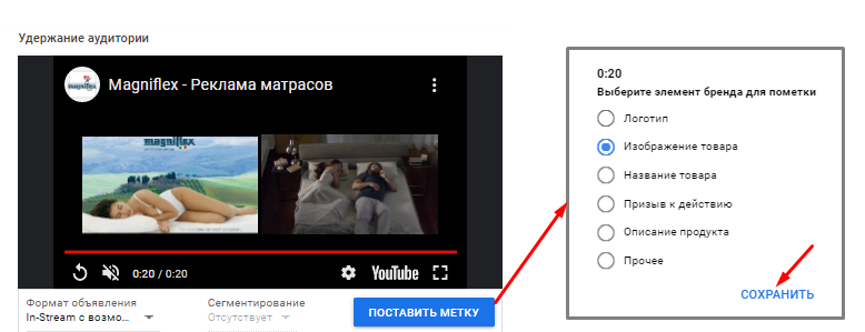 Оплата происходит по модели «Целевая цена за 1000 показов». Video Discovery. Ролик длительностью от 3 минут до часа. Его могут просмотреть пользователи, которые ищут видео на главной странице YouTube, в результатах поиска или списках похожих видео. Объявление состоит из текста и кадра из ролика. Для его просмотра пользователь должен кликнуть по нему. Оплата снимается за клик по видео (CPC-модель). Out-Steam. Видеореклама для мобильных устройств, которая запускается автоматически без звука. Звук включается, если зритель кликает на объявление. Этот формат рекламы не показывается на YouTube. Его можно встретить на партнерских ресурсах и приложениях Google. Оплата взымается, если пользователь смотрит ролик от 2 секунд. Рекламодатель платит за 1000 показов в видимой области экрана. Musthead. Видеобаннер на главной странице YouTube, который показывается на ПК, в мобильном приложении и приложении для телевизоров. Объявление включает в себя видео, заголовок, описание и кнопку с призывом к действию. На ПК видео отображается в течение 30 секунд вверху главной страницы. Снимается оплата за 1000 показов или фиксированная сумма за день. Этот формат рекламы доступен только через резервирование. На страницах Youtube. Видеобаннеры, которые размещаются в верхнем правом углу выше рекомендованного контента. Раньше под баннерами YouTube размещал надпись «Нативная реклама». Сейчас эти баннеры никак не обозначаются, поэтому аудитории сложно определить, что это реклама. Оверлеи (Overlay Ads). Графические баннеры размером 480×70, которые отображаются в нижней части экрана при просмотре видеоролика. Баннер отображается до тех пор, пока его не закроют или пока не закончится видео. Показываются только в спонсорских видео на ПК. На мобильных устройствах не отображаются. Заставки (Bumper Ads). 6-секундные ролики без возможности пропуска, которые показываются в начале, середине или конце видео. Оплата осуществляется за 1000 показов. Подробнее о применении объявлений-заставок читайте в статье «Рецепт успеха Bumper Ads: как эффективно использовать рекламный видеоформат». Объявления, которые показываются аудитории во время выполнения поиска или на главной странице между видеороликами. Пример текстового объявления при поиске видео на YouTube: Пример объявлений между видеороликами: Этот тип рекламы используется для охвата аудитории, использующей форматы и креативы, которые оптимизированы для прослушивания. Контент может быть музыкальным или немузыкальным. Цель запуска аудиорекламы — повысить узнаваемость бренда среди целевой аудитории. Длина аудиообъявлений — до 15 секунд. Оплата — CPM. Читайте также статью «12 типов видеороликов для продвижения продукта в сети». Эффективность видеообъявлений можно анализировать по таким показателям, как клики, показы, просмотры, взаимодействия и т. д. Рассказываем, где можно посмотреть статистику по видеорекламе и как ее анализировать. Статистика по видеокампаниям в YouTube доступна в рекламном кабинете Google Ads. Всего есть два варианта, которые используются для оценки видеороликов: Как посмотреть показатель «Удержание аудитории» по вкладке «Данные рекламы» В правом меню выбираем «Видео» и переходим в «Аналитика». Во вкладке «Данные рекламы» смотрим верхний блок «Удержание аудитории». Во вкладке «Данные рекламы» доступна информация об удержании для объявлений TrueView In-Stream, объявлен