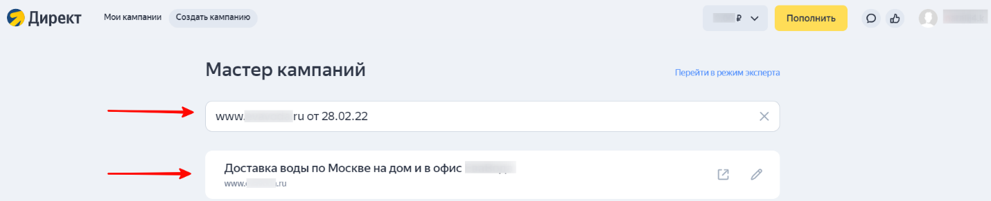 Теперь давайте пошагово настроим рекламу с помощью «Мастера кампаний» для услуг по доставке воды в Москве. У нас на это ушло примерно 10 минут.