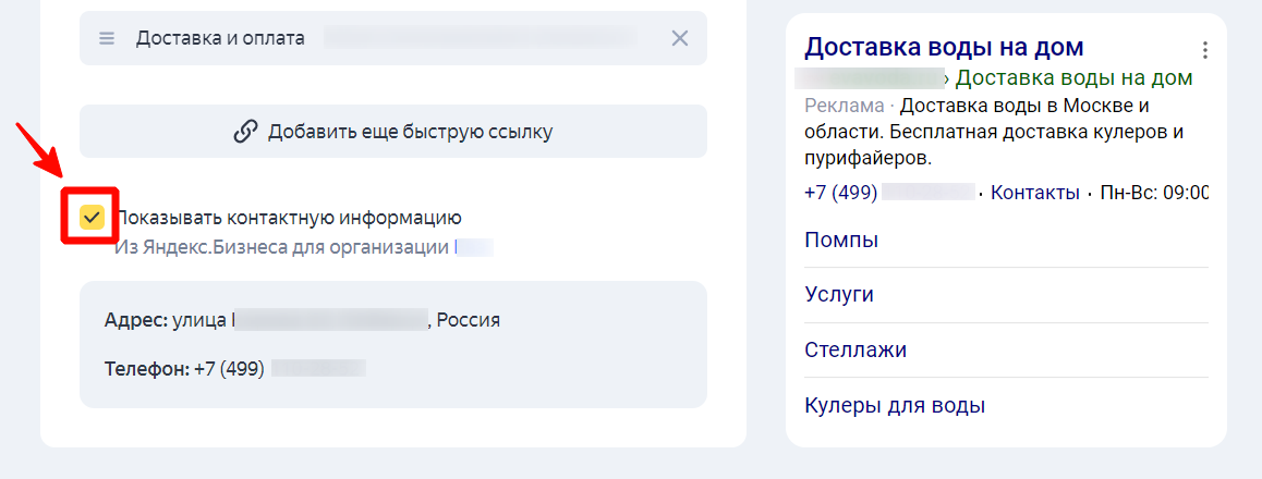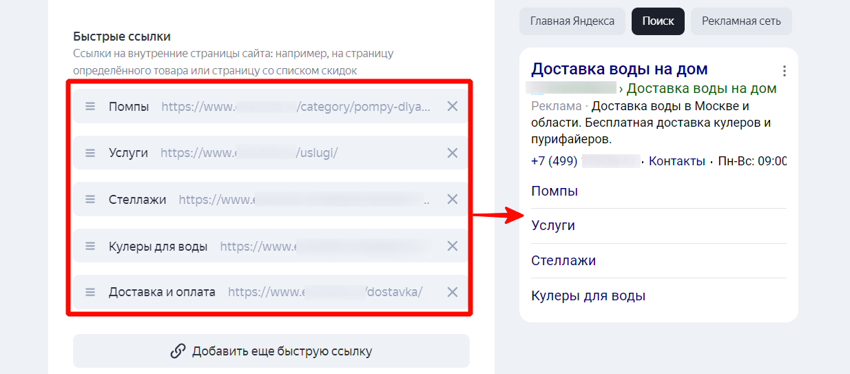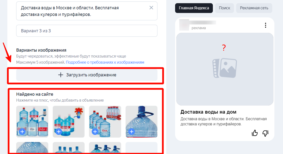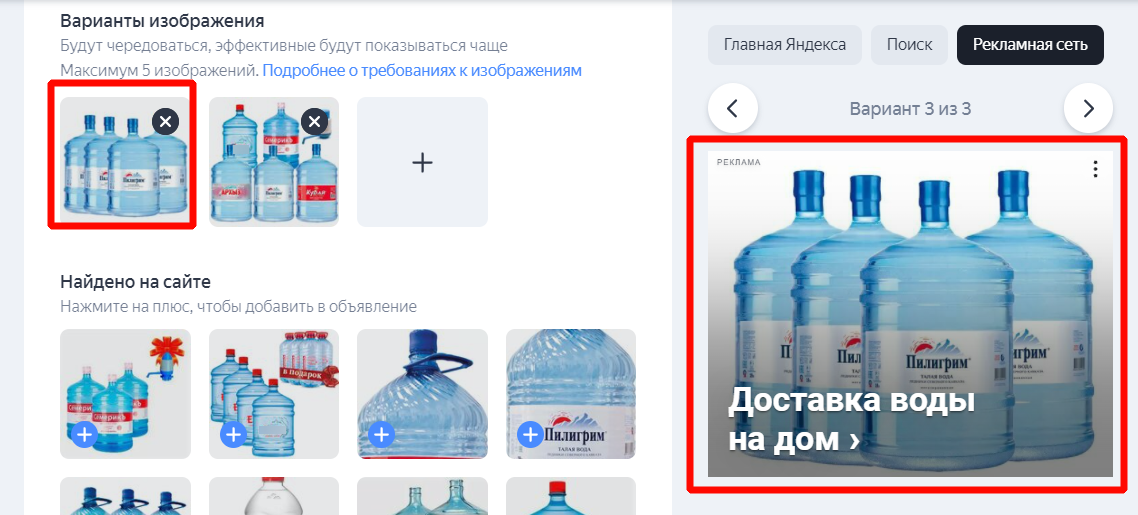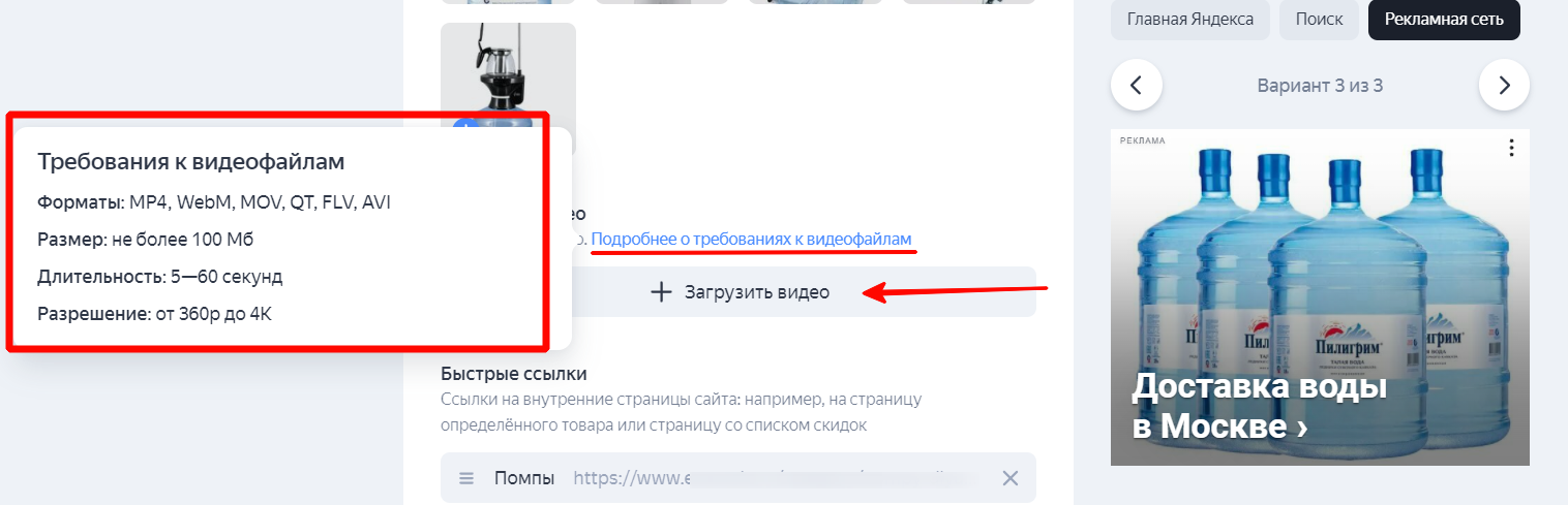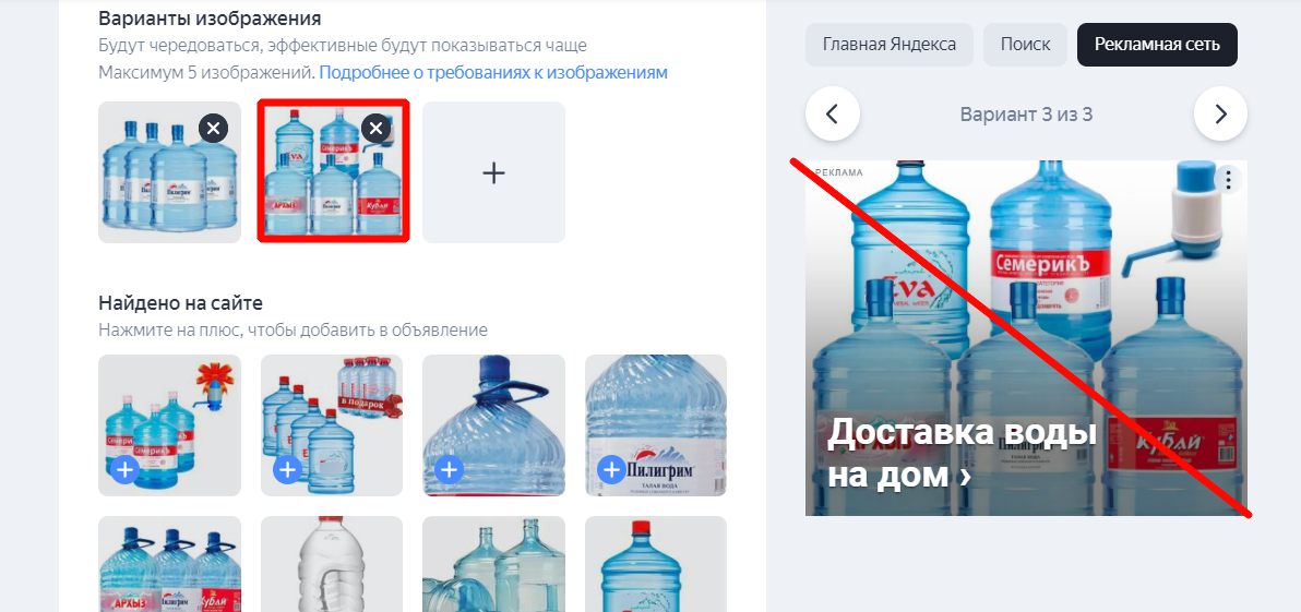 Нажимаем «Добавить кампанию» и выбираем «Мастер кампаний»: На открывшейся странице указываем ссылку на ваш сайт или приложение. Если к вашему аккаунту Яндекса привязаны какие-либо счетчики Метрики, они отобразятся в выпадающем списке и нужно будет только выбрать нужный. Читайте также нашу статью «Все про рекламу мобильных приложений в Яндекс Директе». После выбора система сама создаст название РК с текущей датой и предложит посадочную страницу для объявлений. Через «Мастер кампаний» за один раз можно создать только 1 объявление, однако в нем может быть до 5 вариантов заголовков, текстов и картинок. Система будет чередовать их, наиболее эффективные с точки зрения кликов будут показываться чаще, чтобы кампания привлекала больше трафика на сайт. Для тех, кто хочет дополнить предлагаемые системой варианты текстов, есть подсказки. Они доступно рассказывают, что в объявлении нужно указать название продукта и его важную характеристику. Особое внимание стоит обратить на то, как будут отображаться объявления в зависимости от их типа и места показа. Для этого нужно переключиться между вкладками в правой части интерфейса. Рассмотрим их подробнее. Сначала для такого объявления не показывается картинка. Ее нужно добавить с компьютера с помощью кнопки «Загрузить изображение» или выбрать из картинок товаров, которые система сама нашла на сайте. После выбора вы сможете оценить, хорошо ли смотрится сочетание картинки и вариантов текстов в объявлении (они чередуются в предпросмотре справа). Предпросмотр здесь еще более важен, так как позволяет оценить, вмещается ли текст, достаточно ли в нем конкретики, есть ли контакты и быстрые ссылки. Нелишним будет отредактировать быстрые ссылки. В них лучше оставить только те, которые ведут на важные дополнительные страницы на сайте. Например, если наше объявление касается воды, то ссылку на воду лучше убрать, а оставить сопутствующие товары (помпы, стеллажи, кулеры), услуги и информацию о доставке и оплате. Если вы не хотите показывать контактную информацию в объявлении, ее можно отключить, убрав галочку: Здесь особое значение имеет не текст, а фото. Важно выбрать такое изображение, которое будет смотреться аккуратно и эстетично на всех вариантах объявлений. Варианты можно прокликать справа под надписью «Рекламная сеть». Например, такое фото с сайта лучше не брать, так как оно неэстетично обрезается: А это фото подходит лучше: все бутыли помещаются в кадре, четко различимы, композиция не перегружена. Можно не только добавлять фото с сайта, но и загружать собственное по клику на кнопку «Плюс». Кроме того, для РСЯ можно добавить короткий рекламный видеоролик. Но подойдет не любой, а только тот, который соответствует требованиям площадки: Правила показа объявлений настраиваются тоже довольно просто, но с нюансами. Для доставки воды будет достаточно выбрать только город или область. Однако если ваш бизнес суперлокальный (работает только в одном районе или квартале, как, например, кафе, салон красоты или студия нейл-арта), то лучше выбрать зону на карте. В появившемся окне нужно указать точку, где находится ваше заведение, а также настроить радиус таргетинга в километрах. По геолокации пользователей Яндекс будет определять, кому показывать рекламу. По умолчанию «Мастер кампаний» предлагает ежедневный