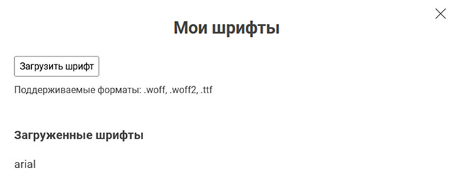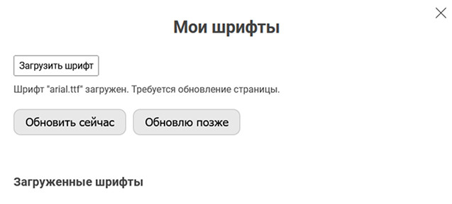 Откроется всплывающее окно с кнопкой загрузки шрифтов и списком уже имеющихся шрифтов: