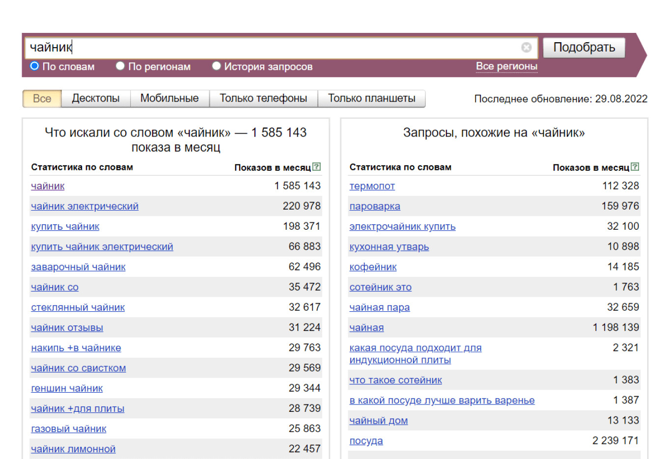Чтобы достичь цели, первым делом анализируем спрос: оцениваем глубину запросов в Вордстате — сколько людей в месяц смотрит информацию по запросу «чайник».