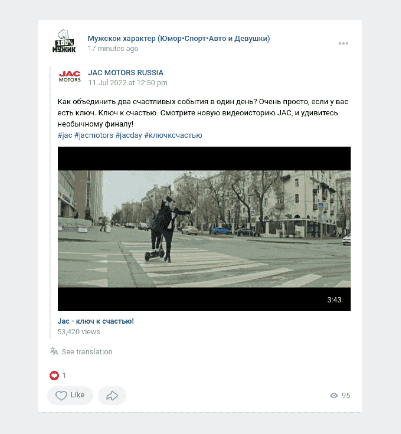 Чтобы пригласить аудиторию на Jac Day 2022 автопроизводитель снял ролик и выложил его во Вконтакте. Но он не стал популярным — 8110 просмотров и ни одного лайка.