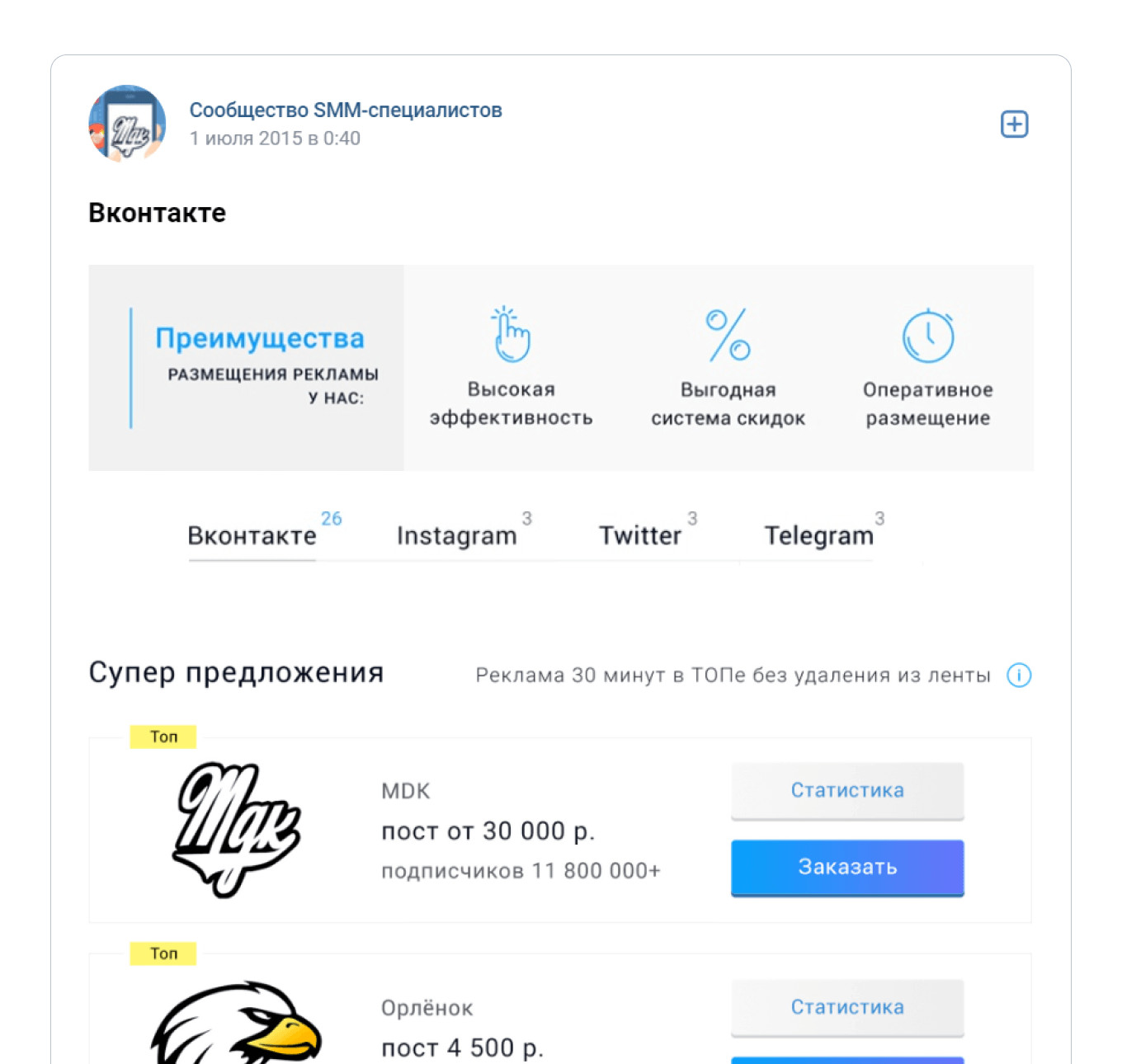 Если все в порядке, следующий шаг — договориться о размещении контента. При ручном размещении цены на публикацию креативов запрашивают у администраторов пабликов — контактные данные указаны в контактах страниц.