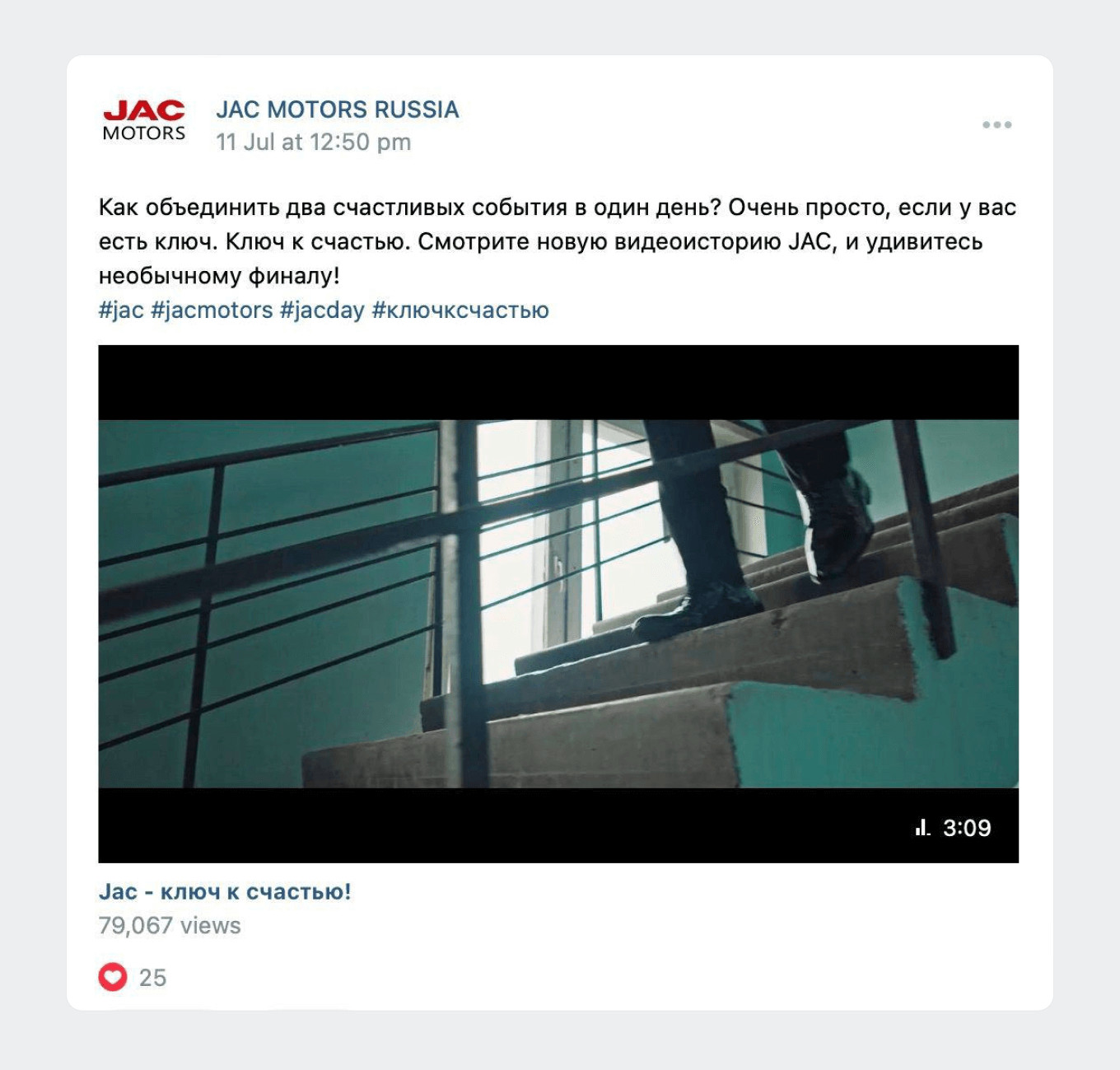 Например, для автопроизводителя JAC MOTORS RUSSIA сработал креатив в формате видеоистории с текстовой подводкой к ней. В центре сюжета — свадебный день. Жених забыл дома телефон, потерял кольцо и опаздывает в ЗАГС, а невеста почти отчаивается.