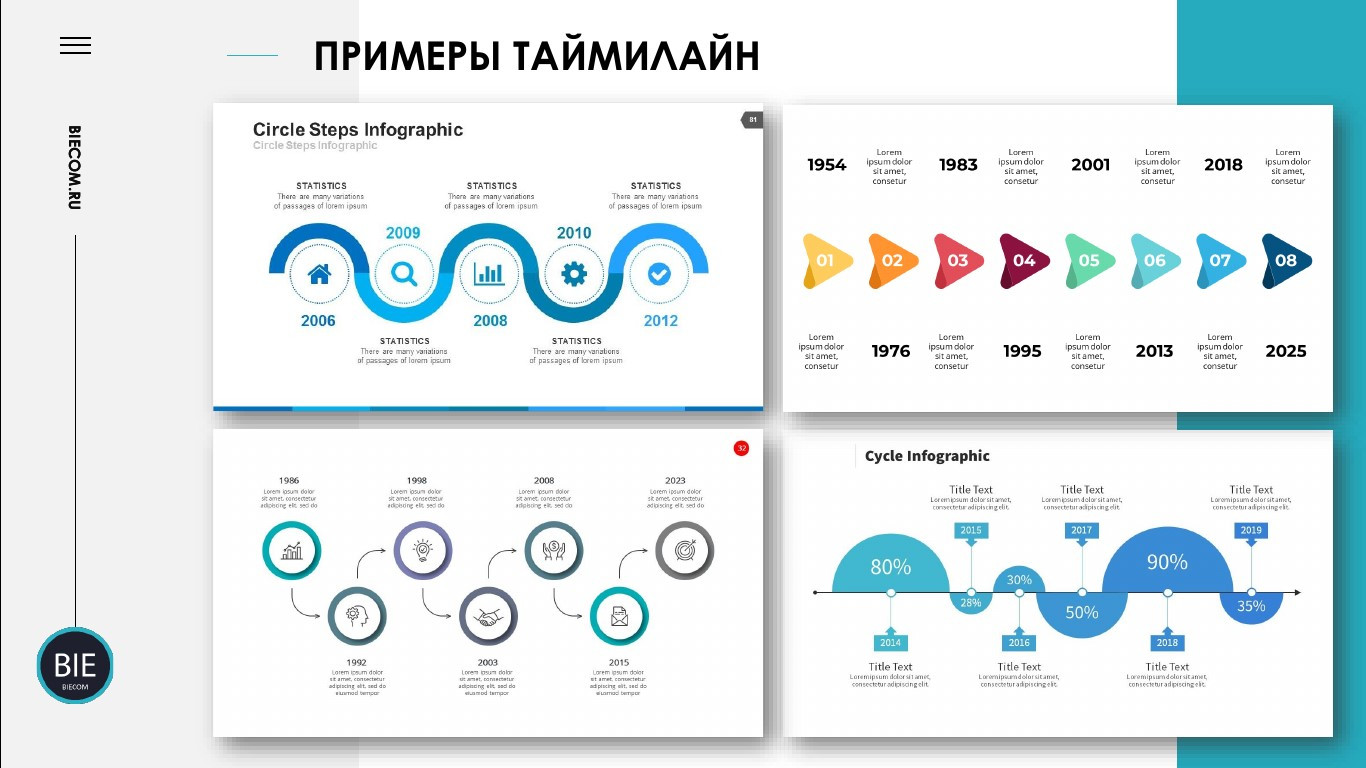 помощью «таймлайна» можно показать хронологию событий. Например, развитие и