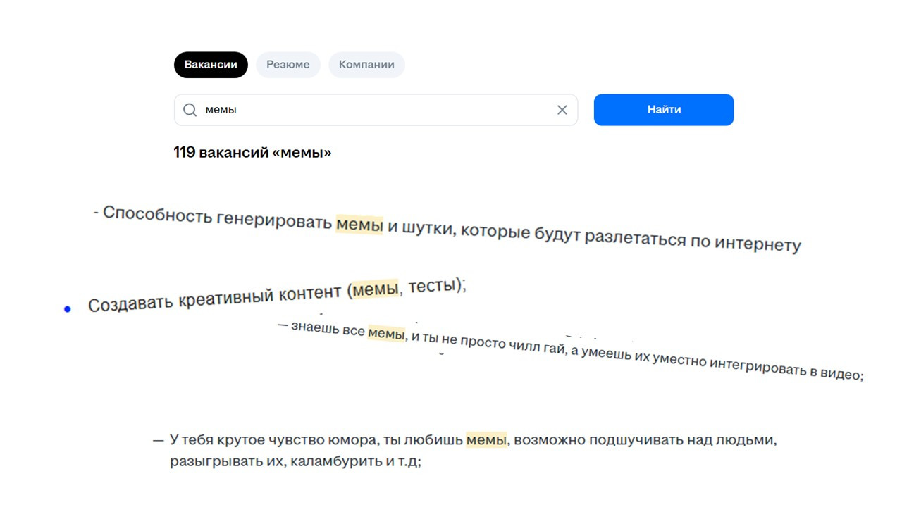 факт: поиск на hh.ru по ключевому слову «мемы» выдает более 100 вакансий. В