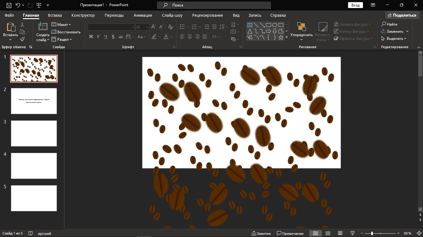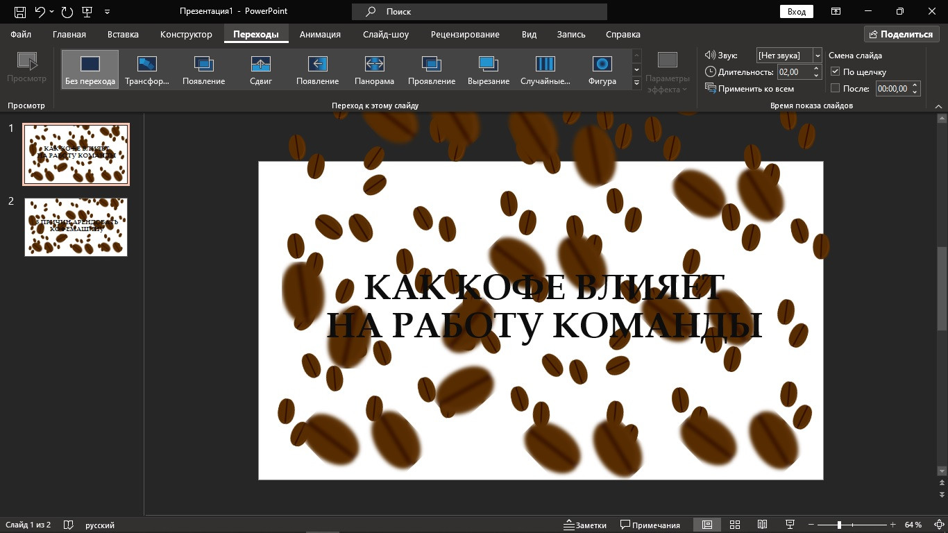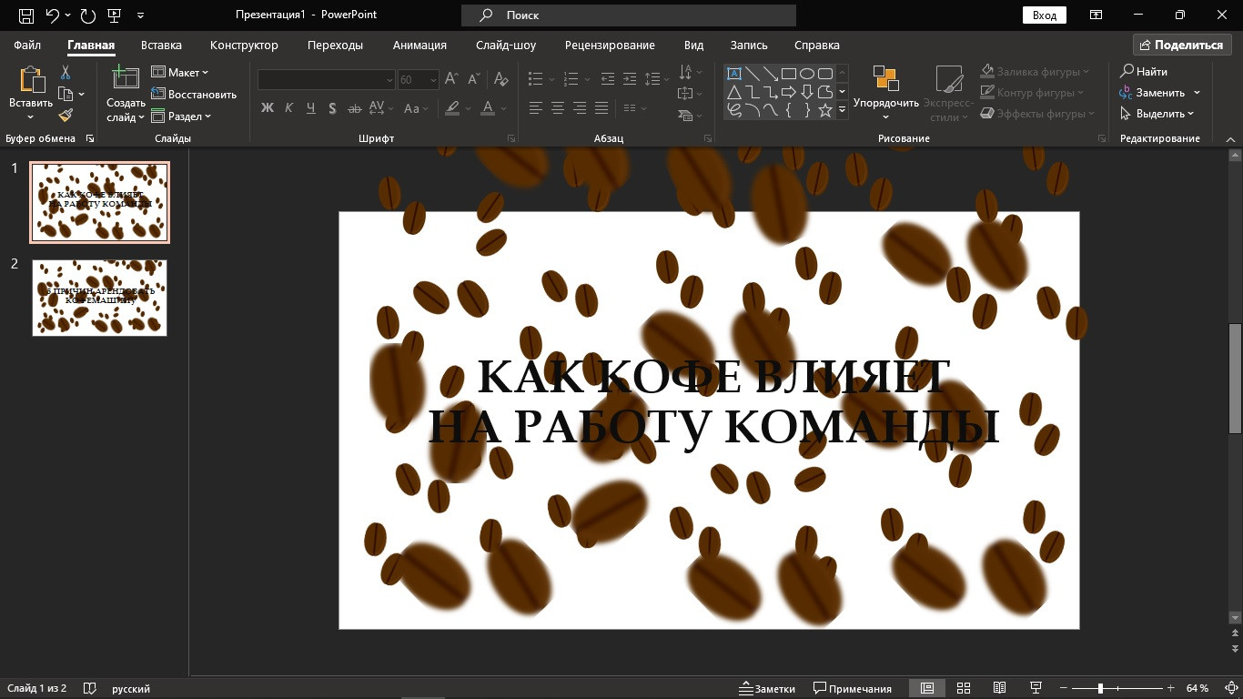 В качестве примера представим ситуацию, что ваша команда устала пить растворимый кофе и тратить немалую часть зарплаты на капучино из ближайшей кофейни. В связи с этим вы с коллегами решили убедить руководителя арендовать или приобрести кофемашину в офис. Чтобы разговор дал лучший результат, все аргументы «за» собрали в одну презентацию. Давайте добавим динамичный фон в ваш проект в PowerPoint.
