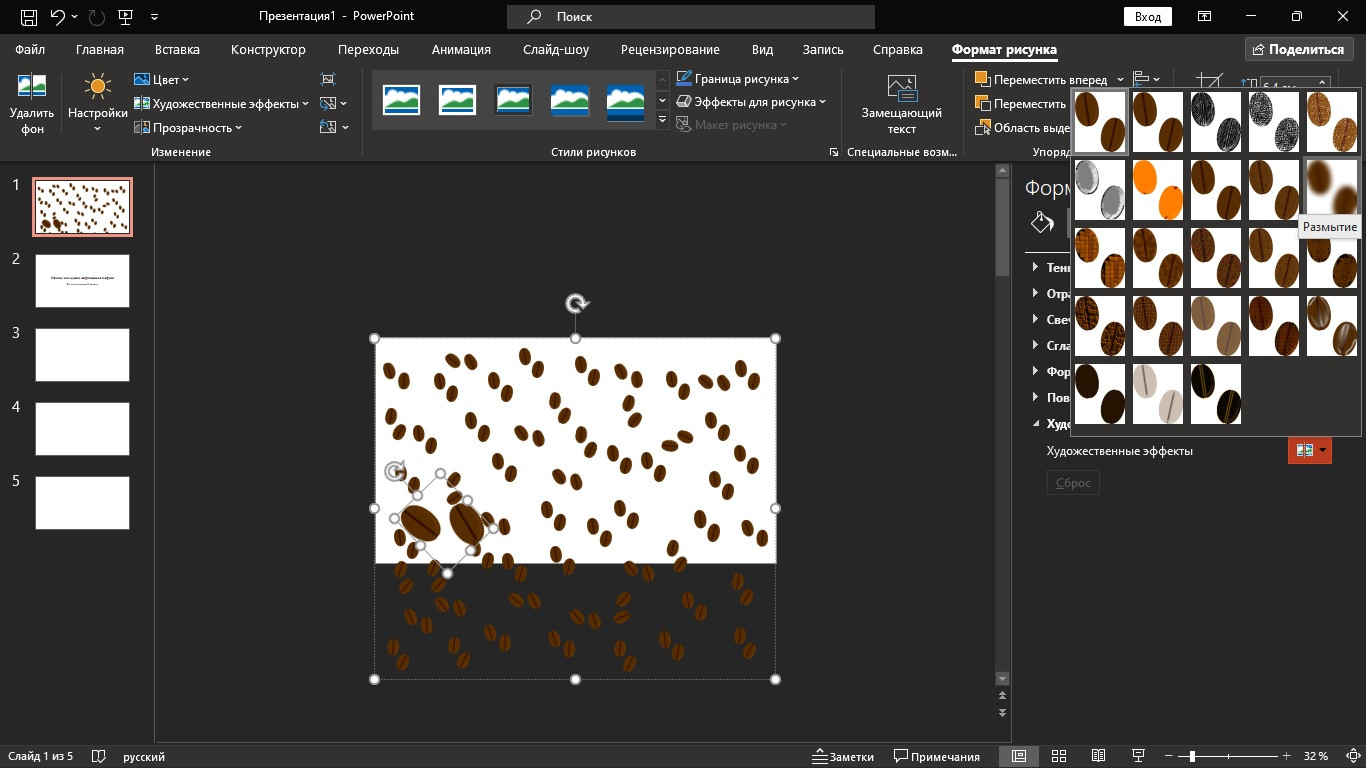 рисунка» → «Художественные эффекты» → «Размытие». Отрегулируйте степень размытия, двигая