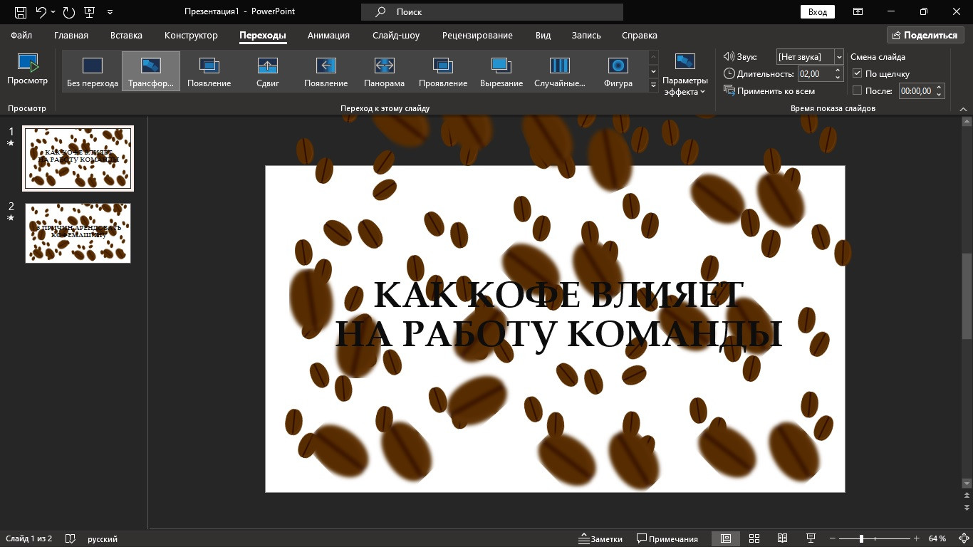 «Трансформация». Примените эффект ко всем слайдам. Шаг 9. Готово! Можете нажать F5 для перехода в